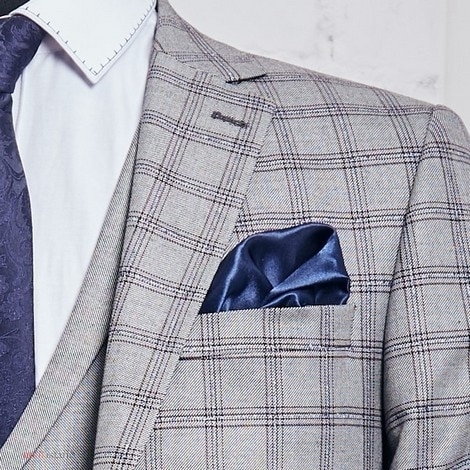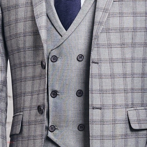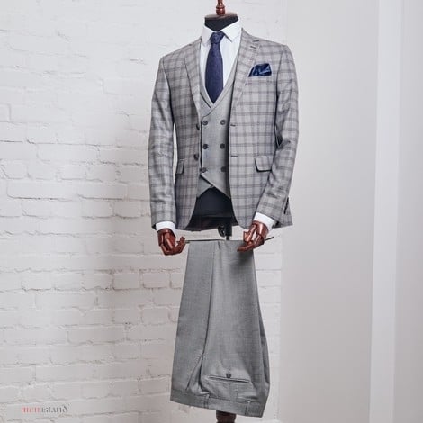– garnitur typu slim-fit, trzyczęściowy (marynarka w kratę glencheck, kamizelka oraz spodnie gładkie w kolorze szarym)