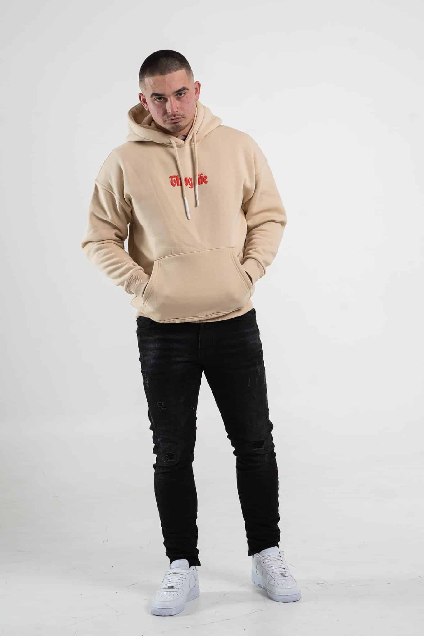 Beżowa bluza męska o oversizowym kroju z dużym, ozdobnym nadrukiem na plecach. Wykonana z wysokiej jakości materiału (65% bawełna, 35% poliester) posiada regulowany sznurkiem kaptur oraz kieszeń kangurkę. Rękawy oraz dół bluzy zakończone są ściągaczem. Uwagę zwraca również napis, który znajduje się na przodzie bluzy.