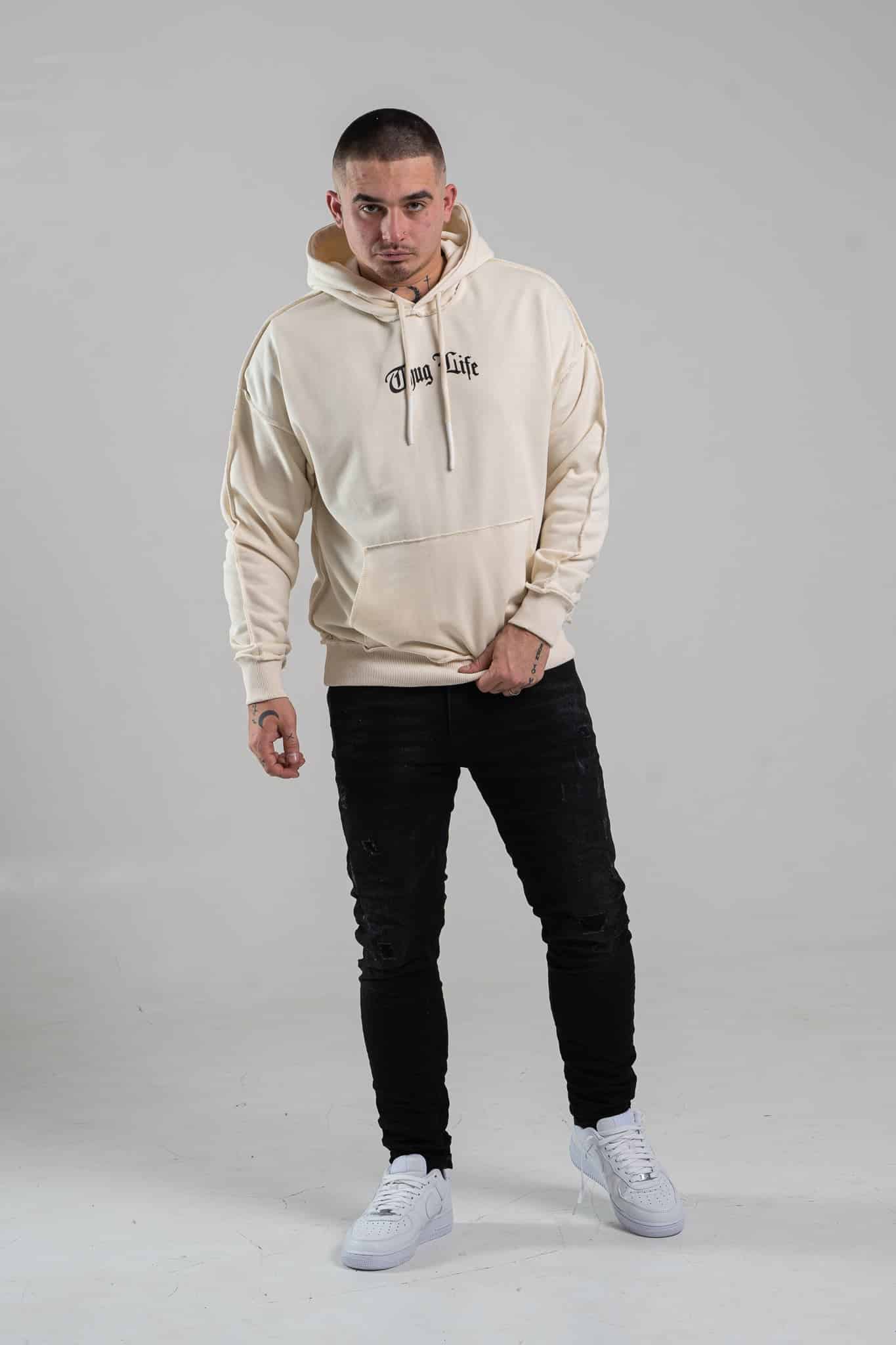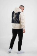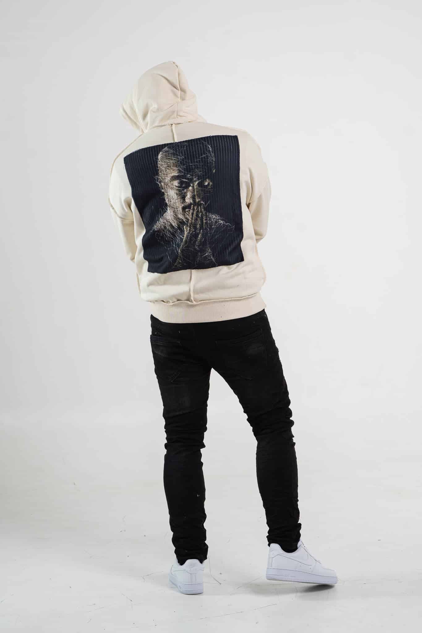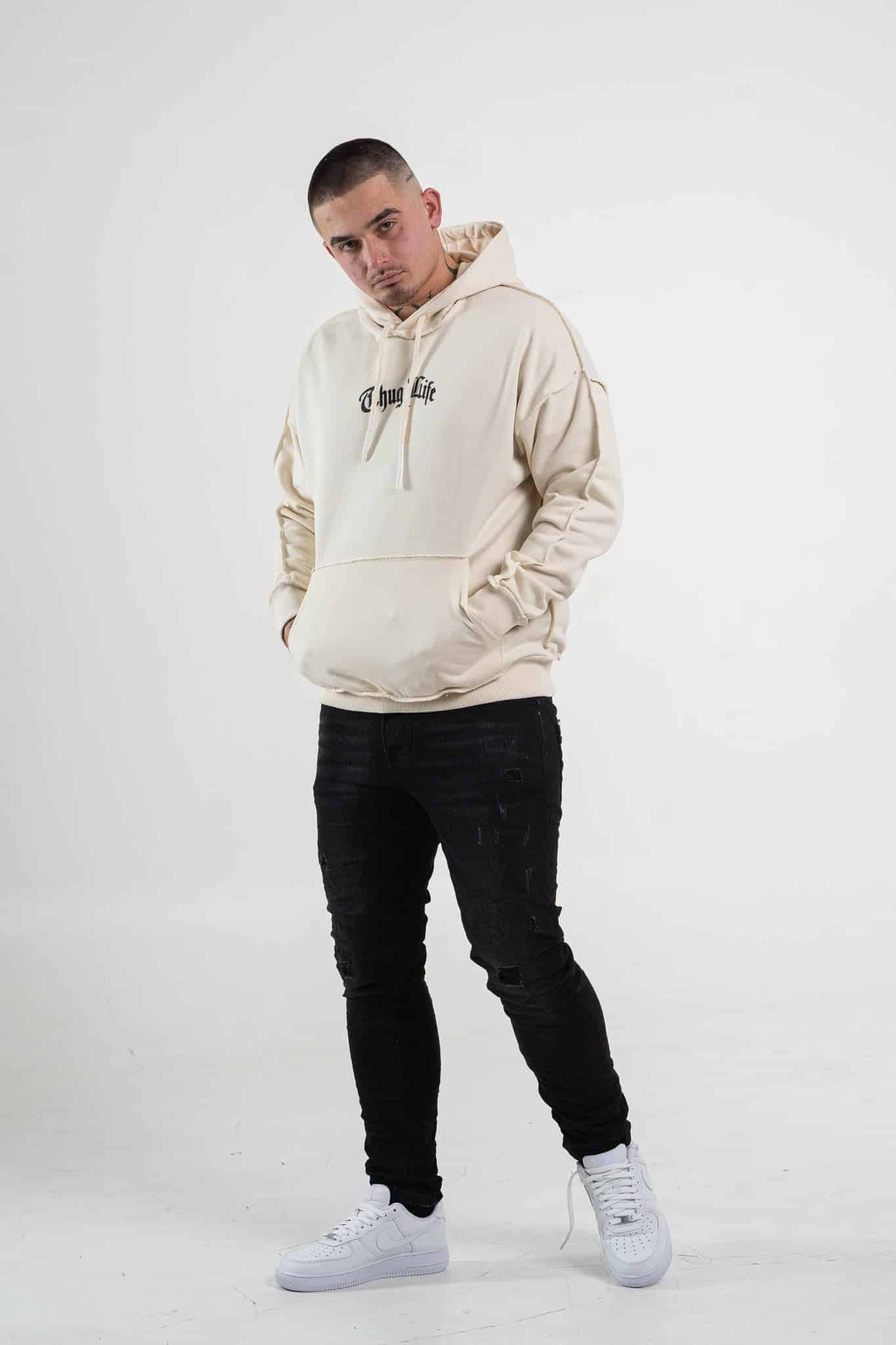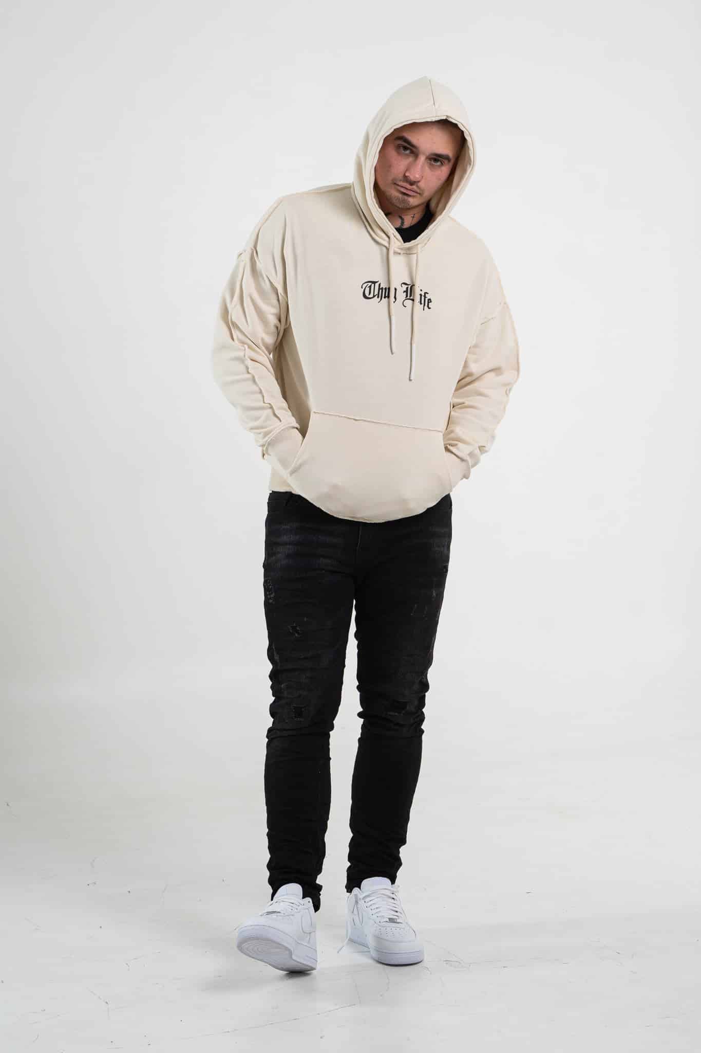 Beżowa bluza męska o oversizowym kroju z dużym nadrukiem Tupac’a na plecach. Wykonana z wysokiej jakości materiału (65% bawełna, 35% poliester) ma kaptur oraz ozdobne przeszycia. Rękawy oraz dół bluzy zakończone są ściągaczem.