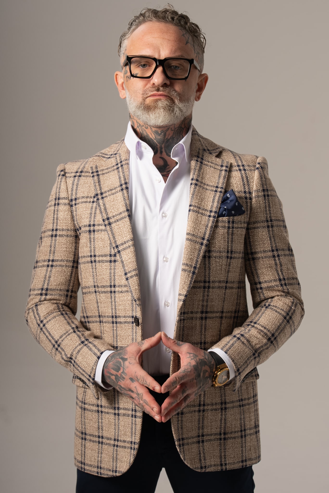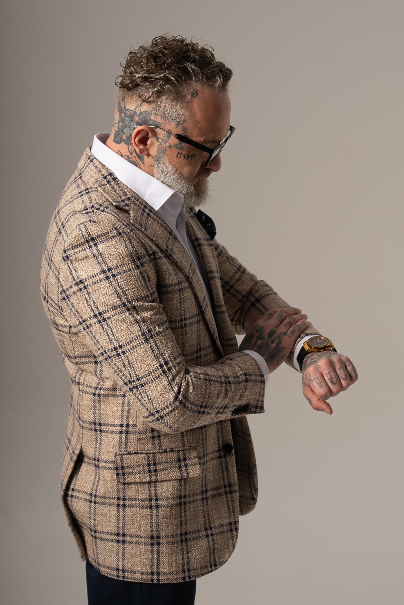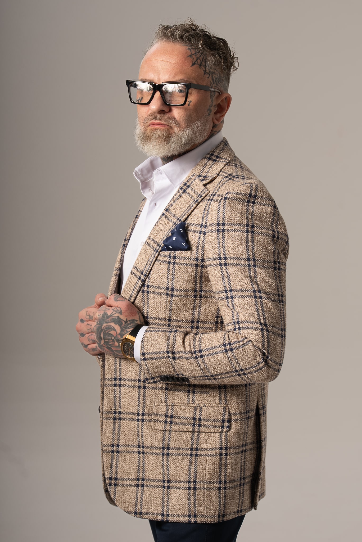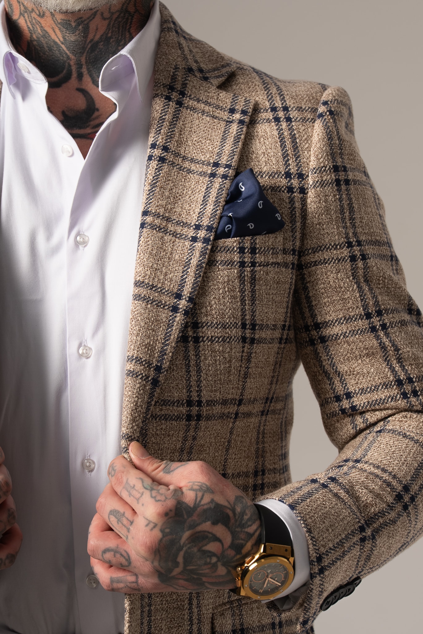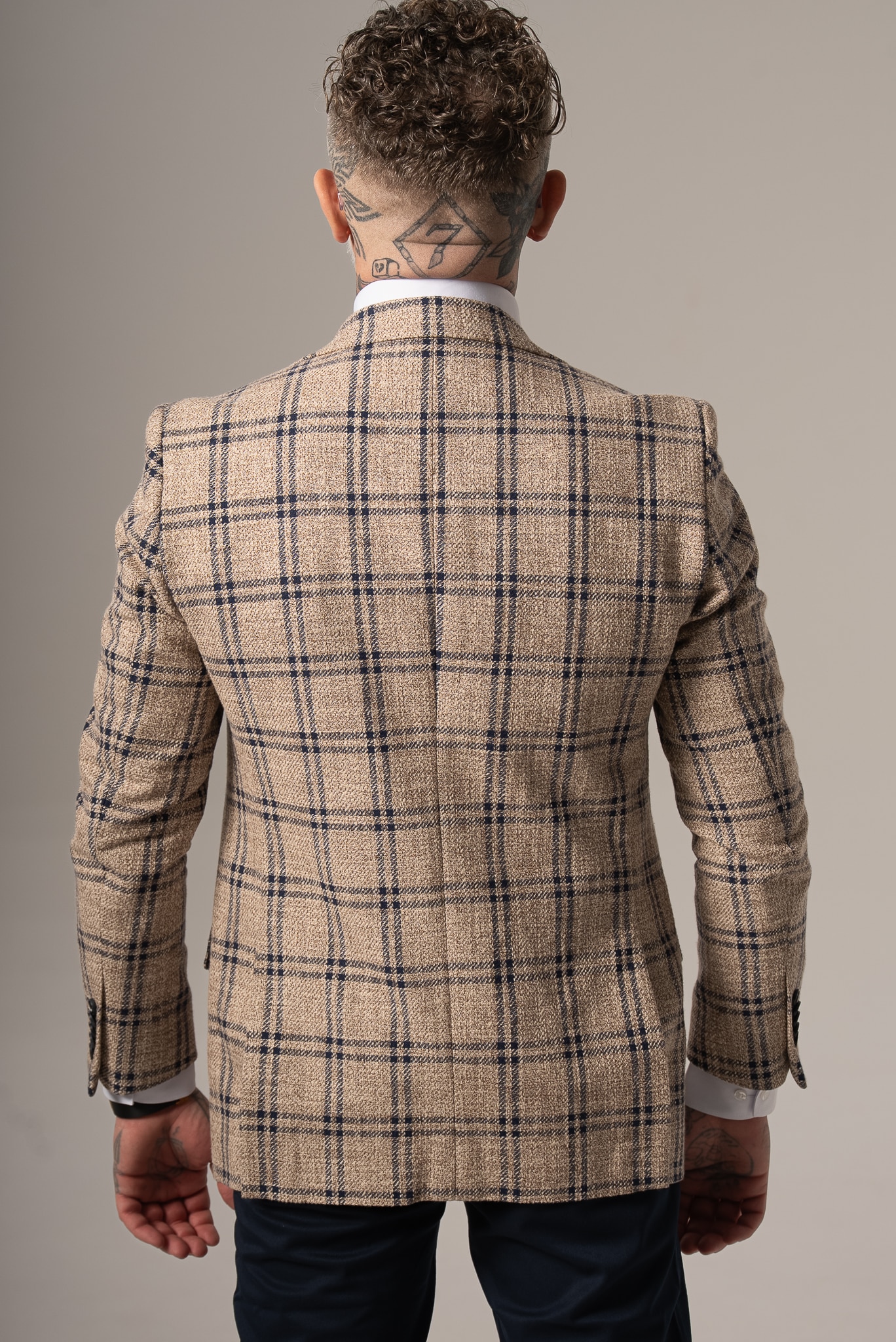 Beżowo-granatowa marynarka męska w kratę z dodatkiem lnu