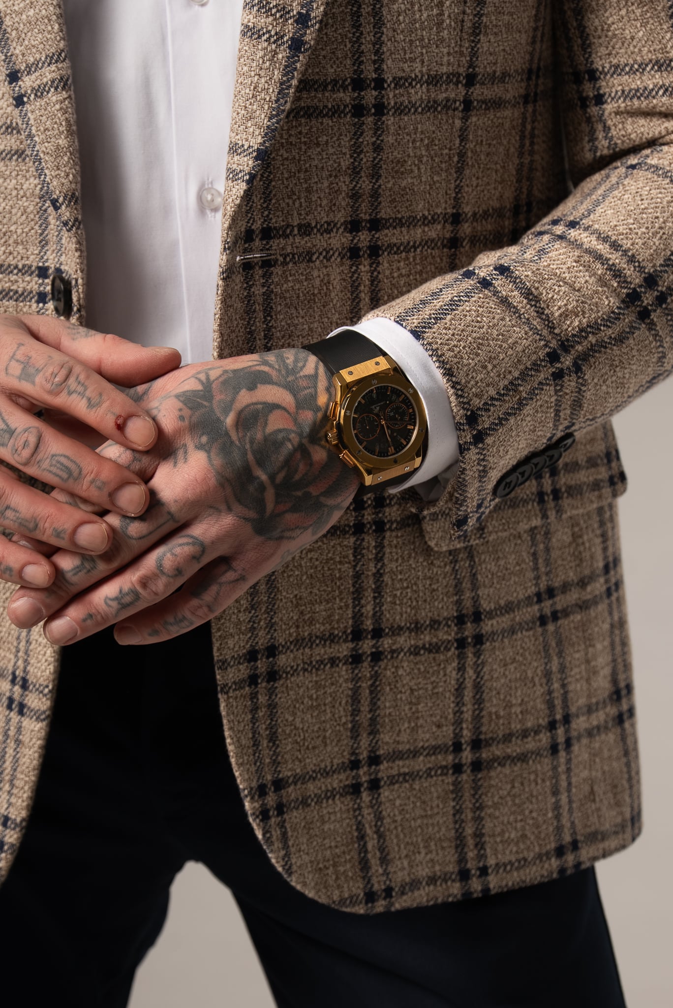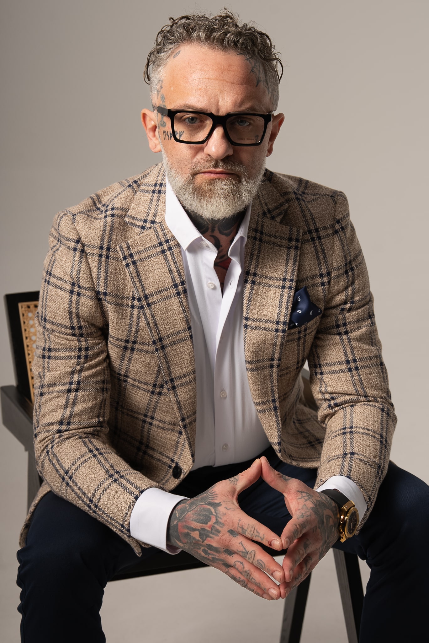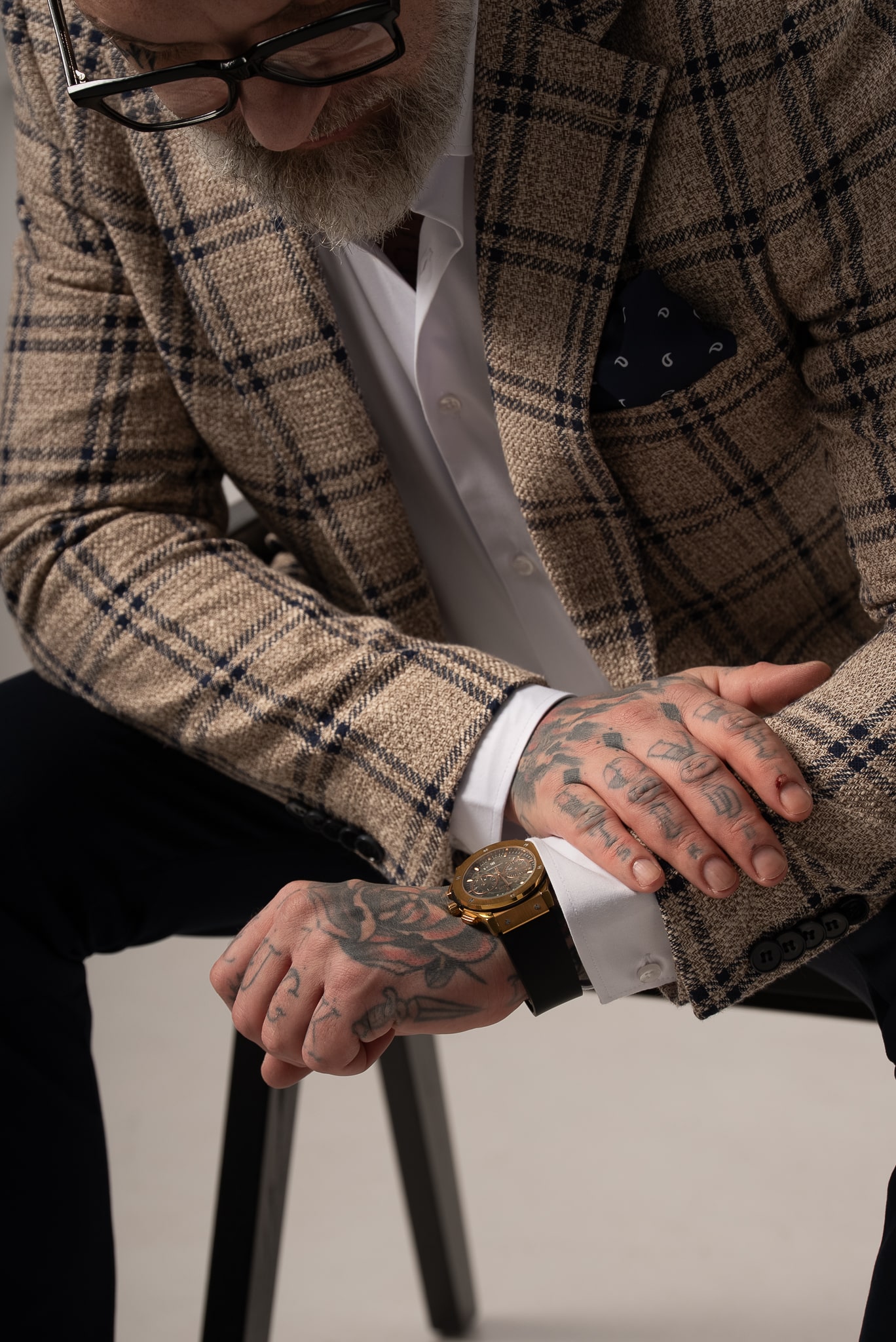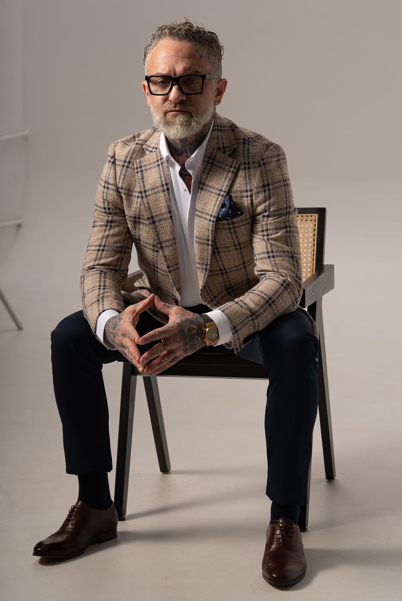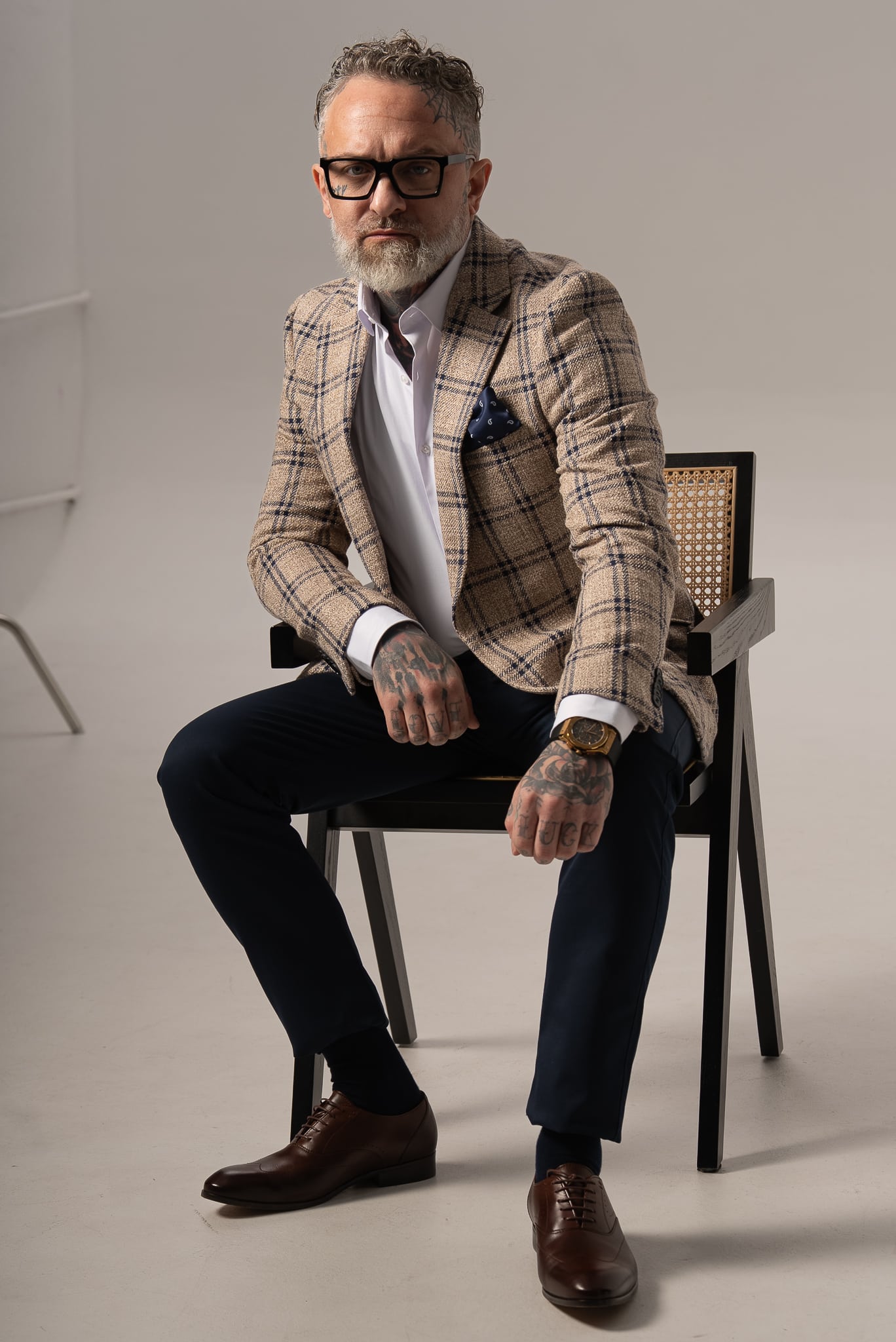 Beżowo-granatowa marynarka męska w kratę z dodatkiem lnu