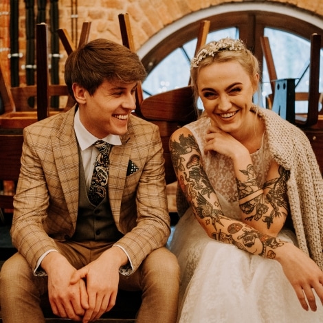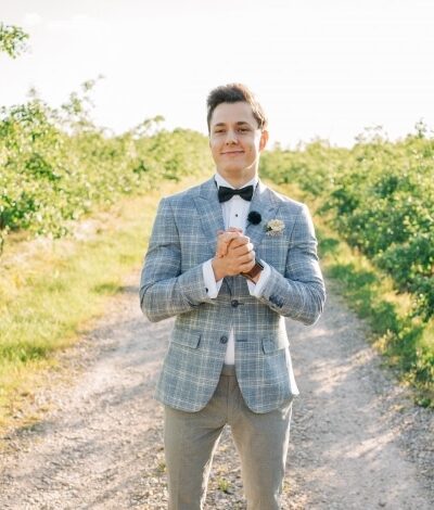 – garnitur typu slim-fit, trzyczęściowy (beżowa marynarka w zielono – białą kratę, kamizelka w bardzo elegancki zielono – złoty wzór oraz gładkie, beżowe spodnie)
