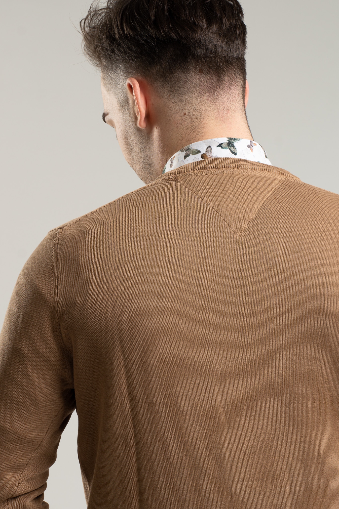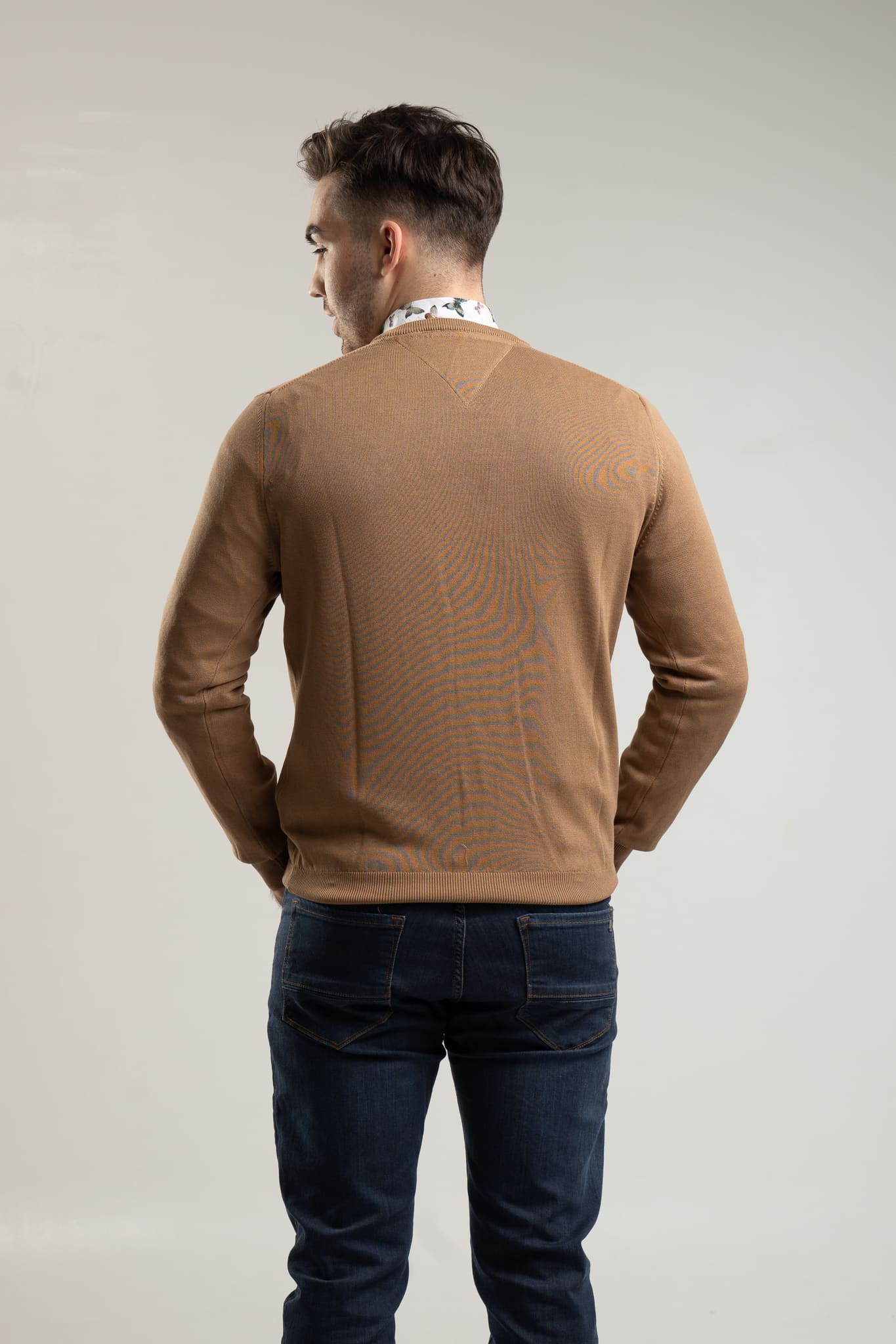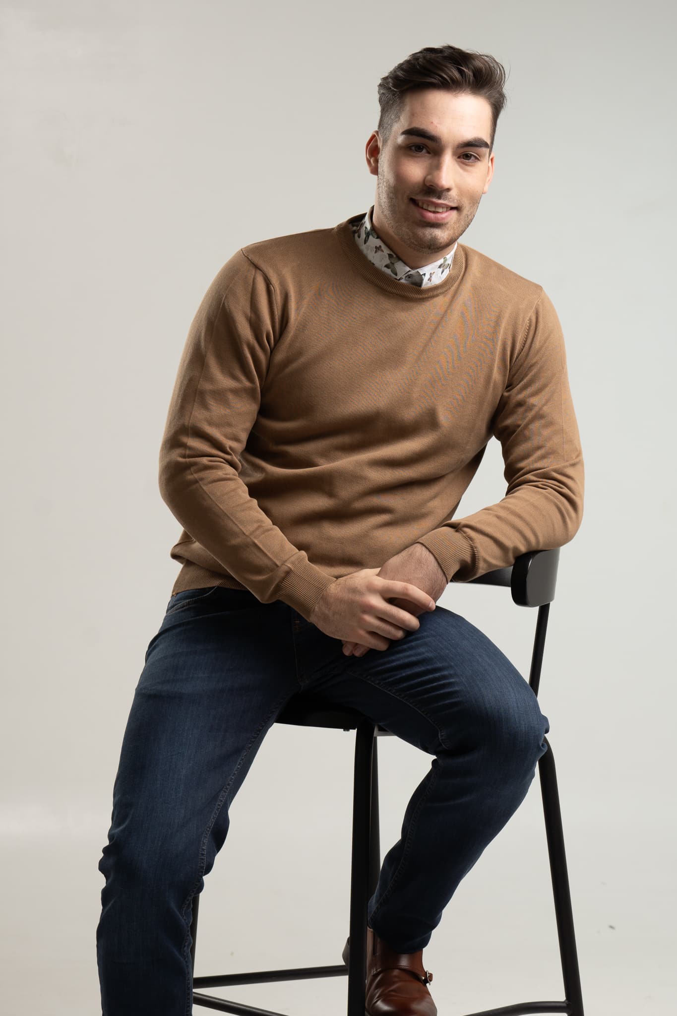 Sweter męski z okrągłym dekoltem w kolorze beżowym wykonany został z najwyższej jakości tkaniny bawełnianej (100% bawełny), co gwarantuje najwyższy komfort użytkowania. Wyposażony został w ściągacze przy szyi, w pasie i w rękawach dla zapewnienia maksymalnego komfortu termicznego. Cechuje go jakość wykonania oraz dbałość o detale.