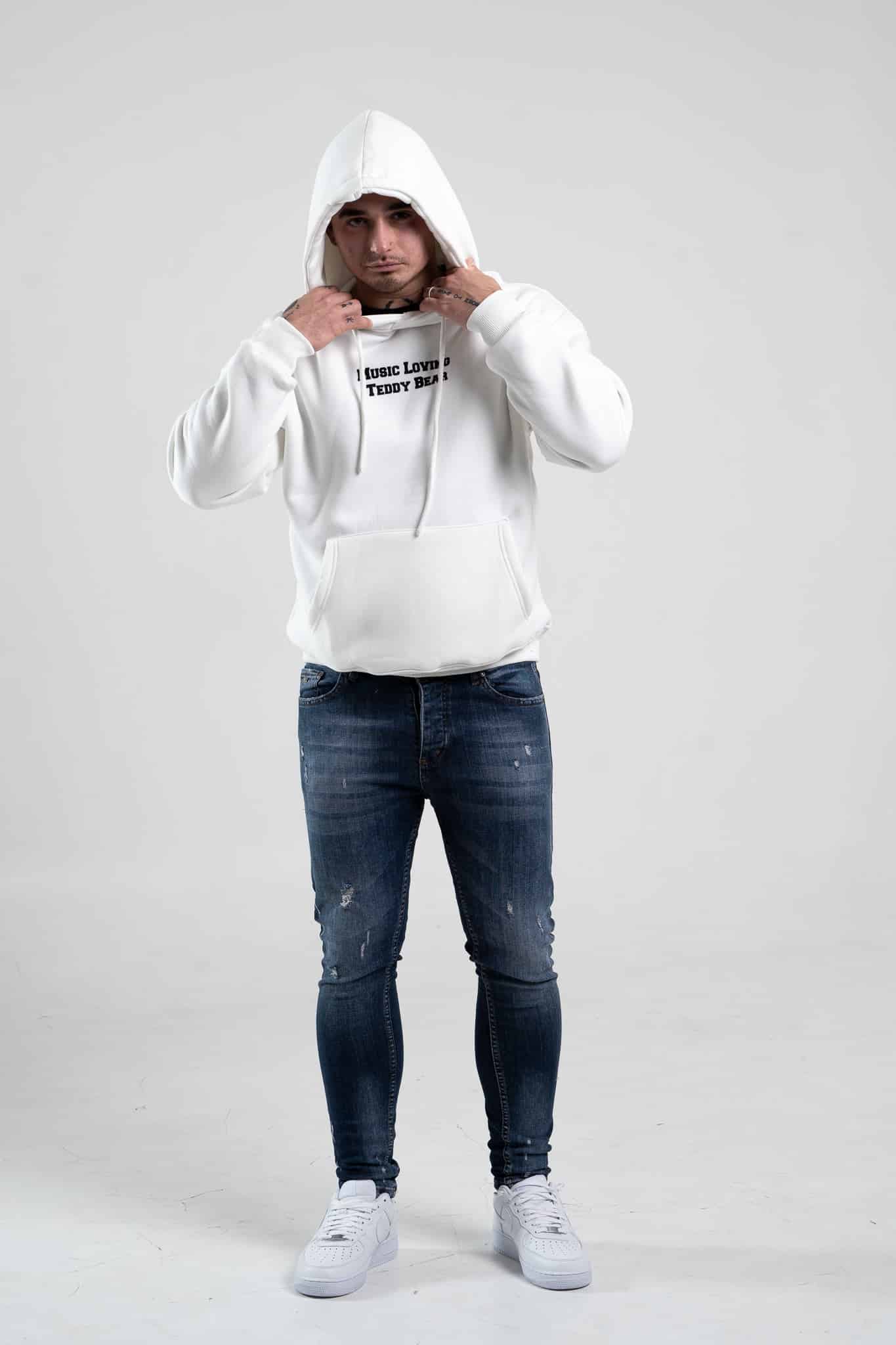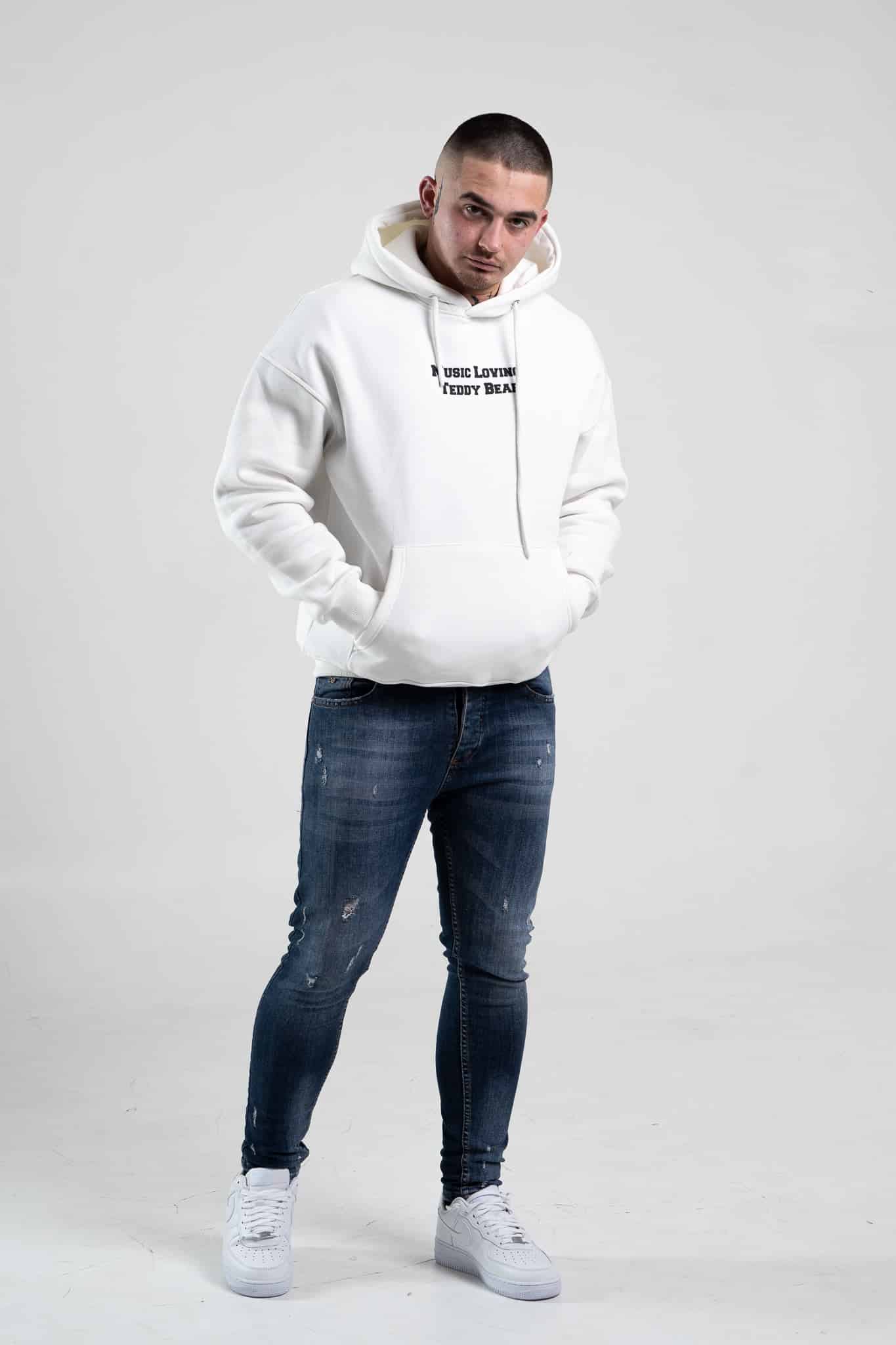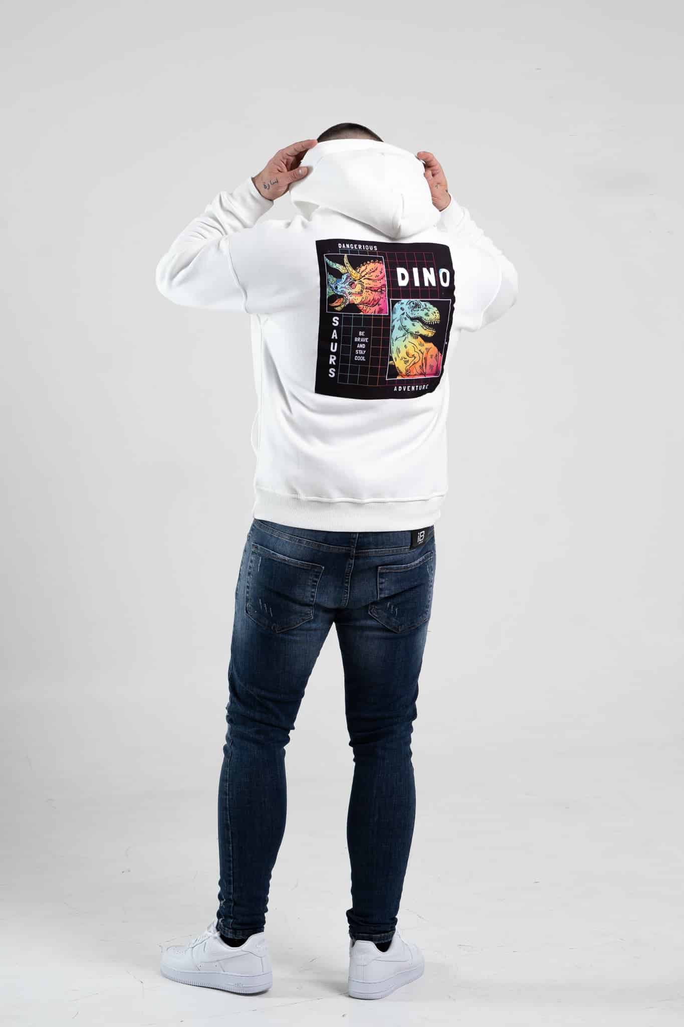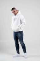 Biała bluza męska o oversizowym kroju z dużym, ozdobnym nadrukiem na plecach. Wykonana z wysokiej jakości materiału (65% bawełna, 35% poliester) posiada regulowany sznurkiem kaptur oraz kieszeń kangurkę. Rękawy oraz dół bluzy zakończone są ściągaczem. Uwagę zwraca również napis, który znajduje się na przodzie bluzy.