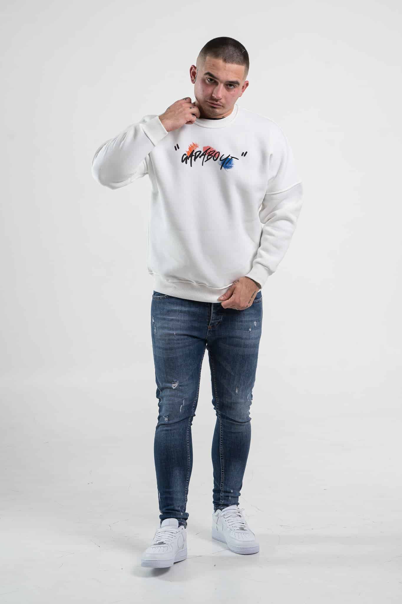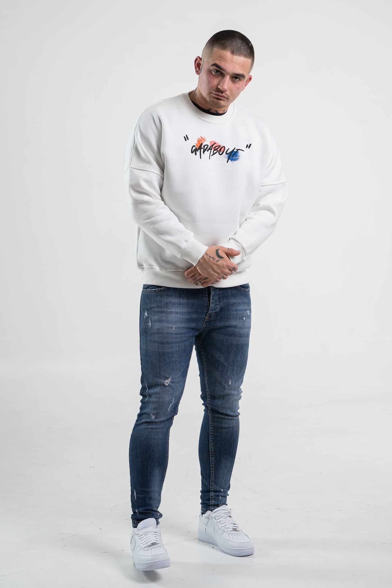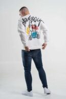 Biała bluza męska o oversizowym kroju z dużym, ozdobnym nadrukiem na plecach. Wykonana z wysokiej jakości materiału (65% bawełna, 35% poliester). Nie posiada kaptura ani żadnej kieszeni. Rękawy oraz dół bluzy zakończone są ściągaczem. Uwagę zwraca również napis, który znajduje się na przodzie bluzy.