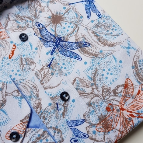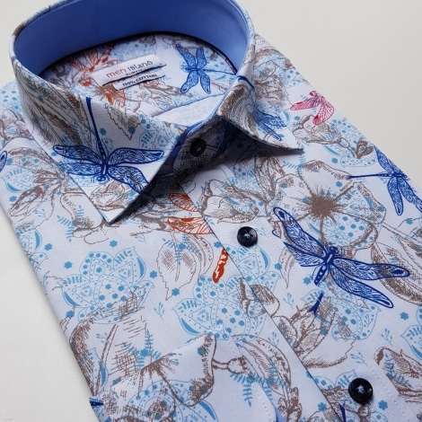 Wysokiej klasy, o niepowtarzalnym wzorze i stylowym połączeniu kolorów. Koszula marki Men Island (201907) to propozycja dla mężczyzn chcących wyróżnić się z tłumu, zachowując przy tym wysoką klasę i styl. Kompozycja kolorów – błękitu, granatu, beżu, a także pomarańczu i czerwieni oraz wymyślnego deseniu, jakim są ważki, wykreowały hit tego sezonu.