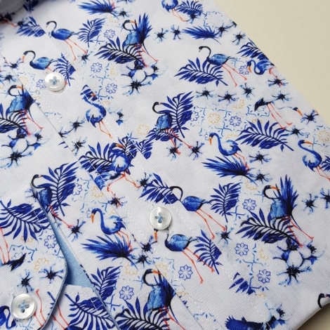 Koszula męska 201913 to najnowsza propozycja białej koszuli w niezwykle modny, układający się w regularny wzór motyw, jakim są niebieskie flamingi.