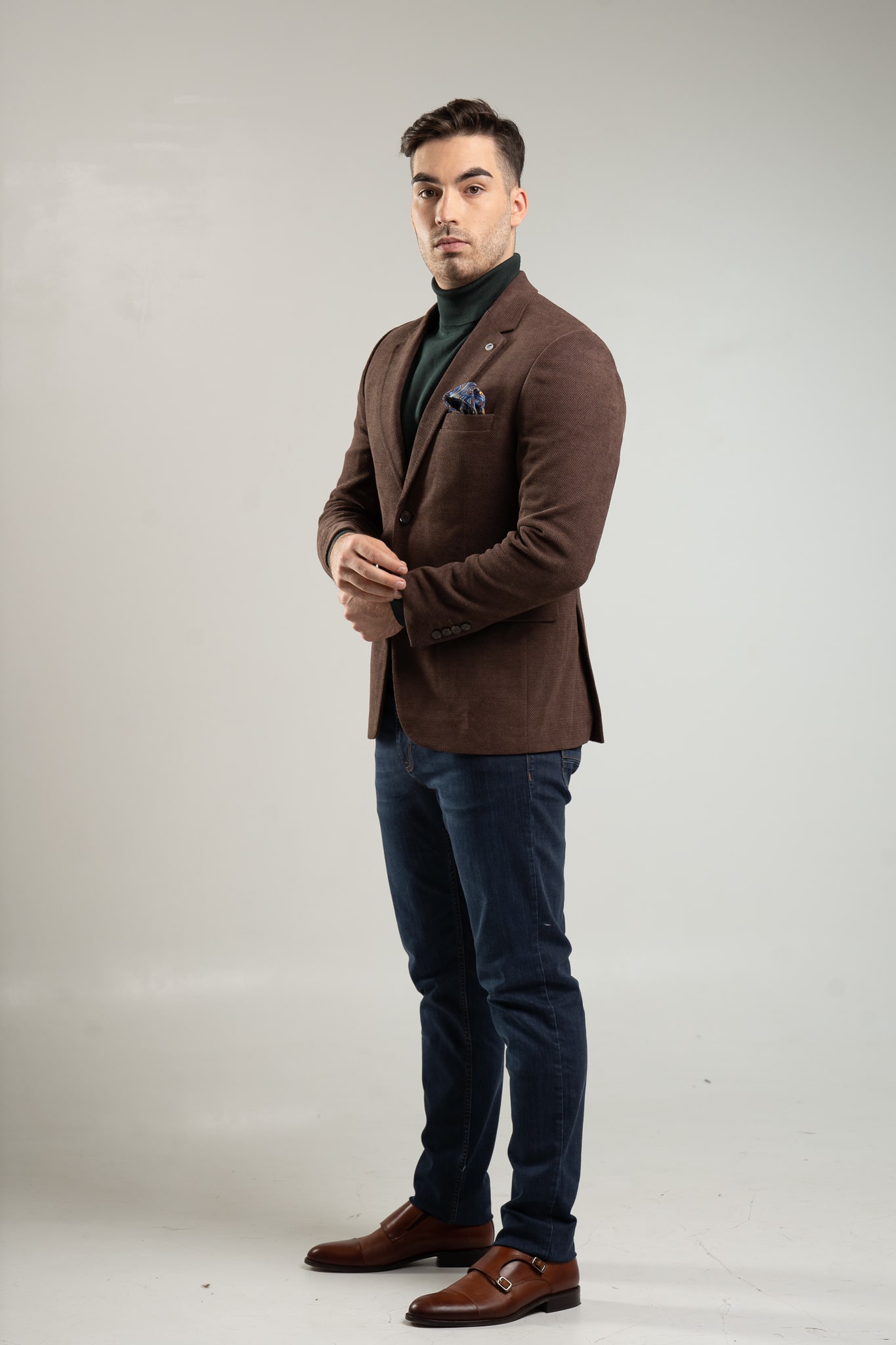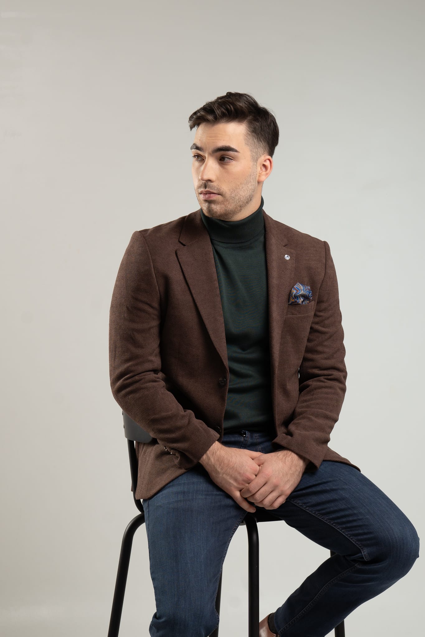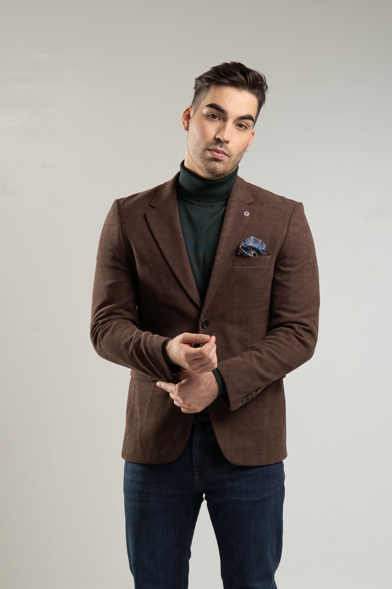 Dzięki tej propozycji zyskamy męski, niepowtarzalny look. Jednorzędowa, brązowa marynarka z tkaniny o strukturalnym splocie. Zapinana na dwa guziki, o wytaliowanym kroju, idealnie dopasowuje się do sylwetki.