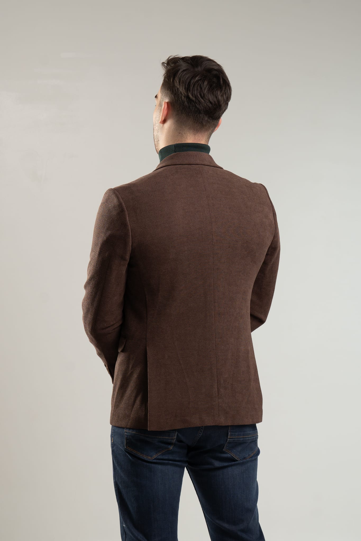 – brązowa marynarka z tkaniny o strukturalnym splocie