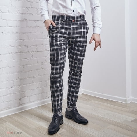Model spodni o dopasowanym kroju w kolorze czarnym, z kontrastującą kratą (kolor biały i szary). Wykonane z tkaniny bawełnianej (65%) oraz poliestru (35%). Posiadają dwie kieszenie po bokach oraz dwie cięte z tyłu. Wyposażone są w szlufki oraz ozdobny, kontrastowy łańcuszek w pasie. Zapinane są na guzik, haftkę oraz kryty suwak pod listwą z przodu.
