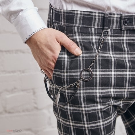 Ich model przypomina spodnie garniturowe, aczkolwiek ich tkanina, deseń oraz dodatkowy, ozdobny łańcuszek w pasie, sprawiają, iż stają się one bardziej casualowe.