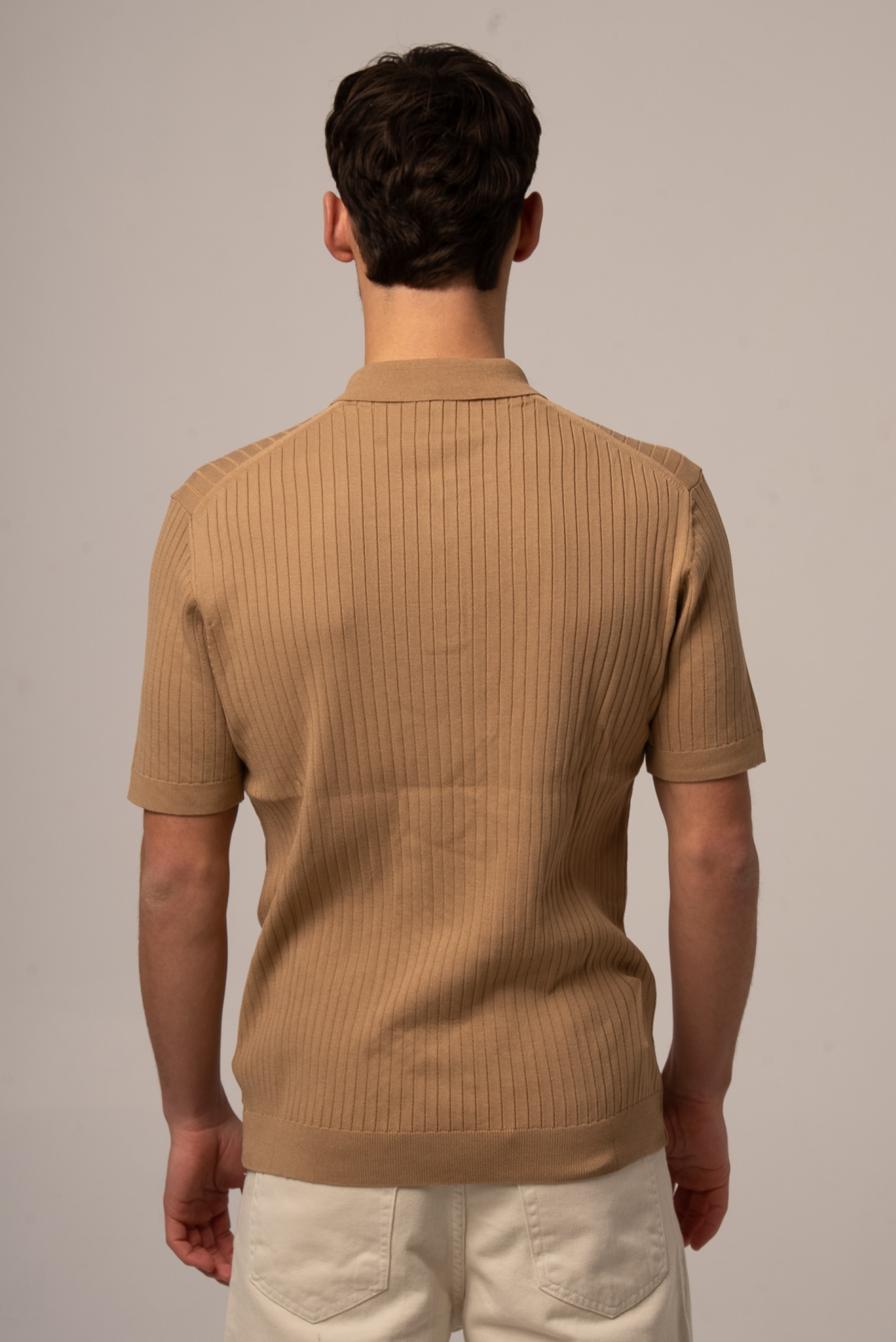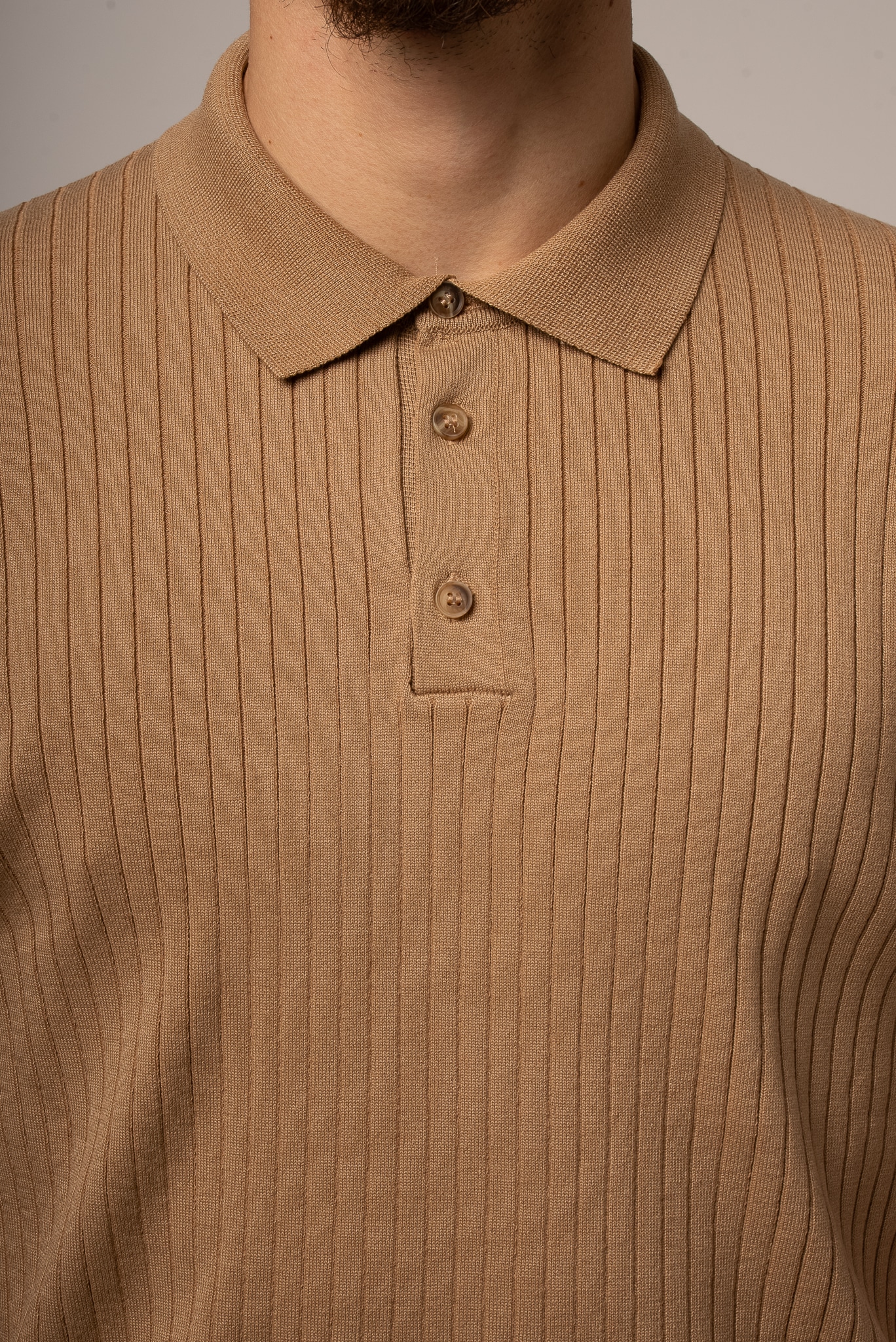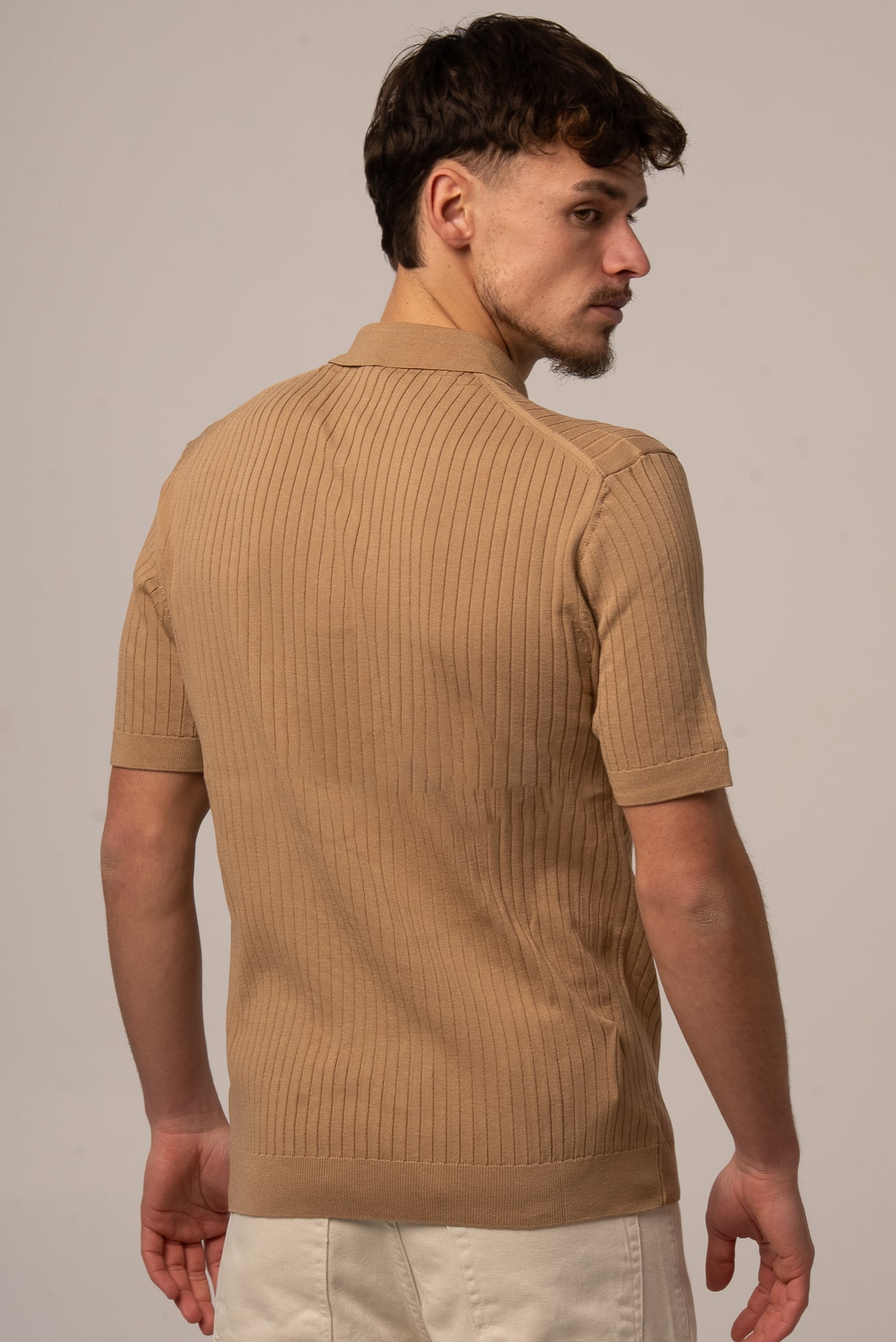 Ciemnobeżowa koszulka męska polo ze sweterkowej dzianiny
