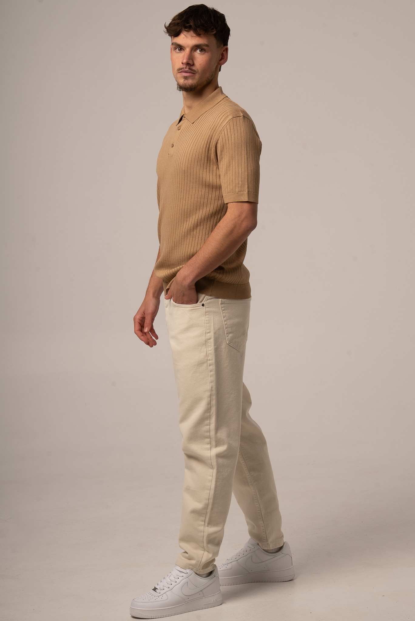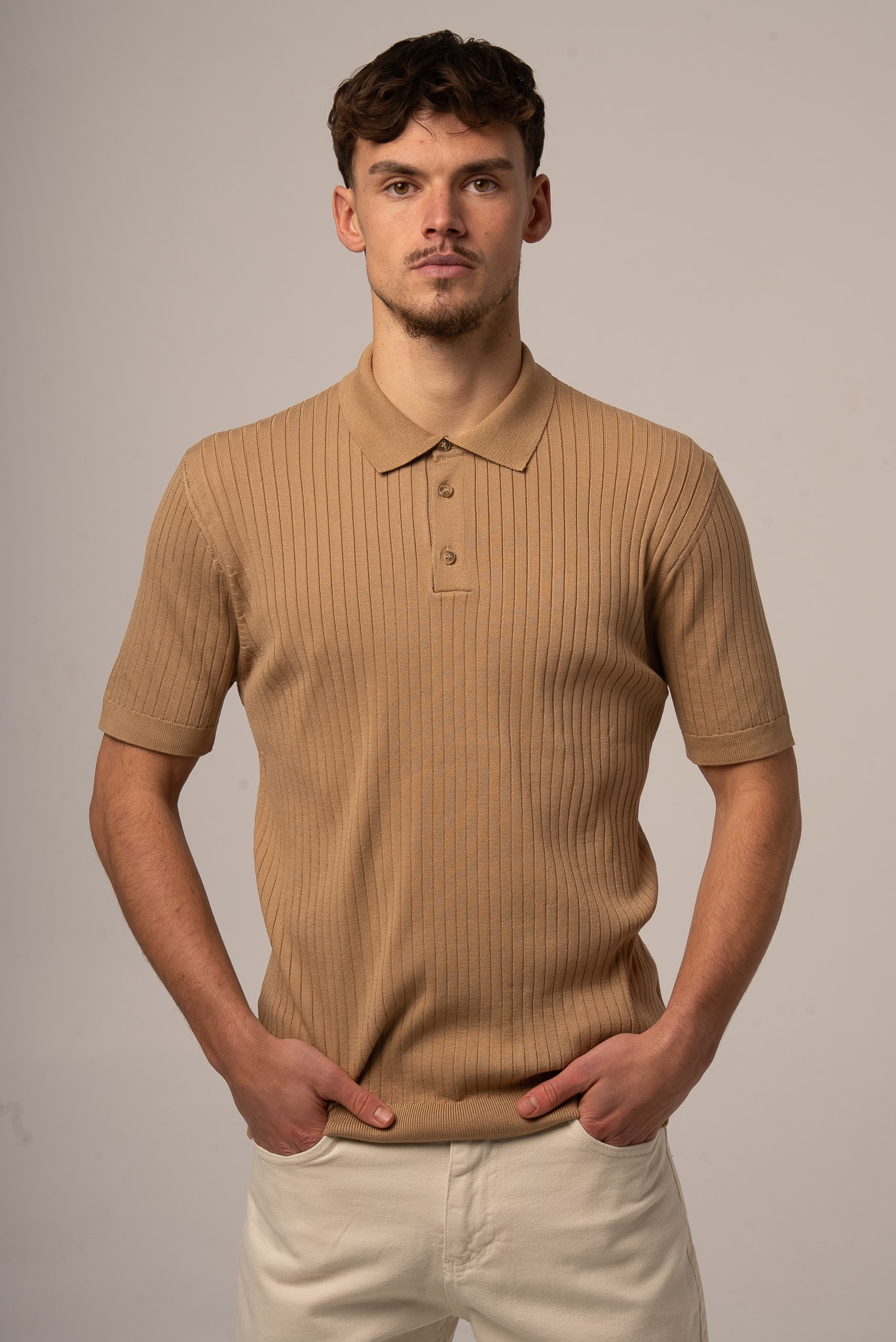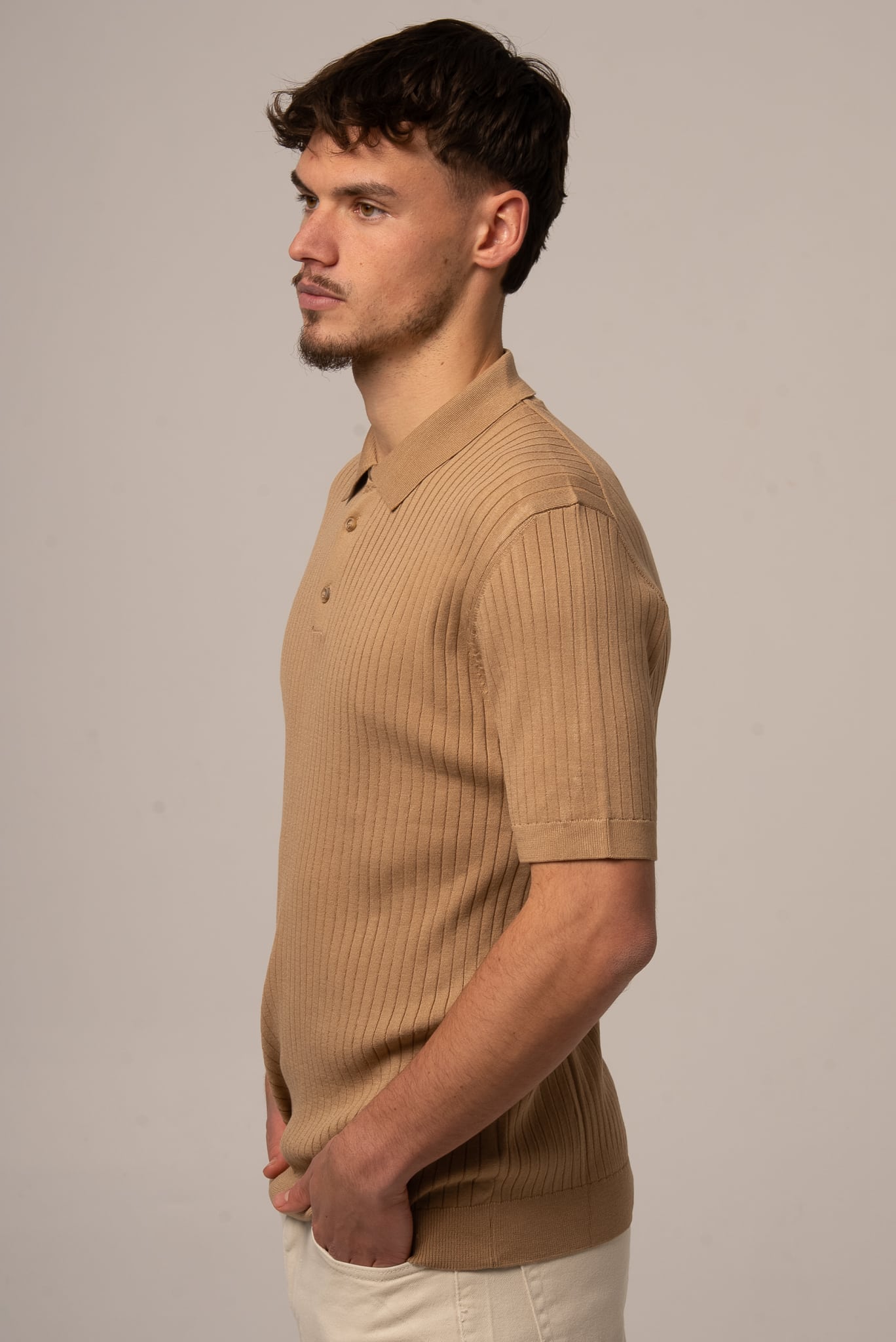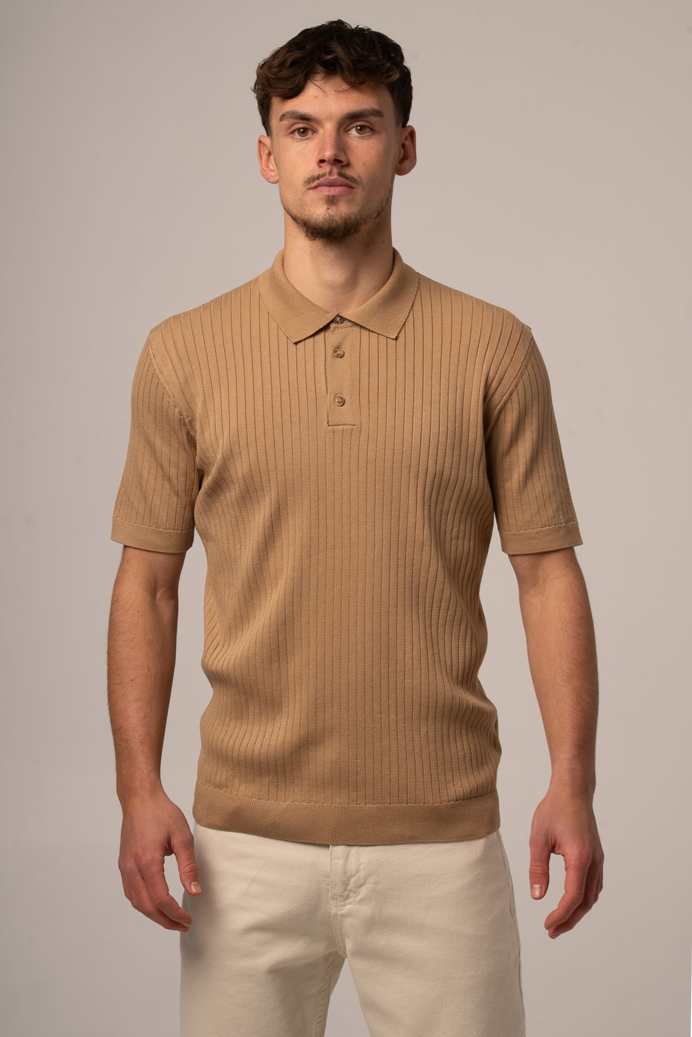 Ciemnobeżowa koszulka męska polo ze sweterkowej dzianiny