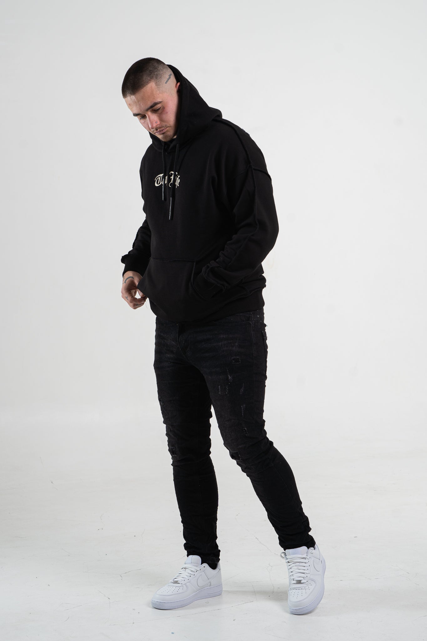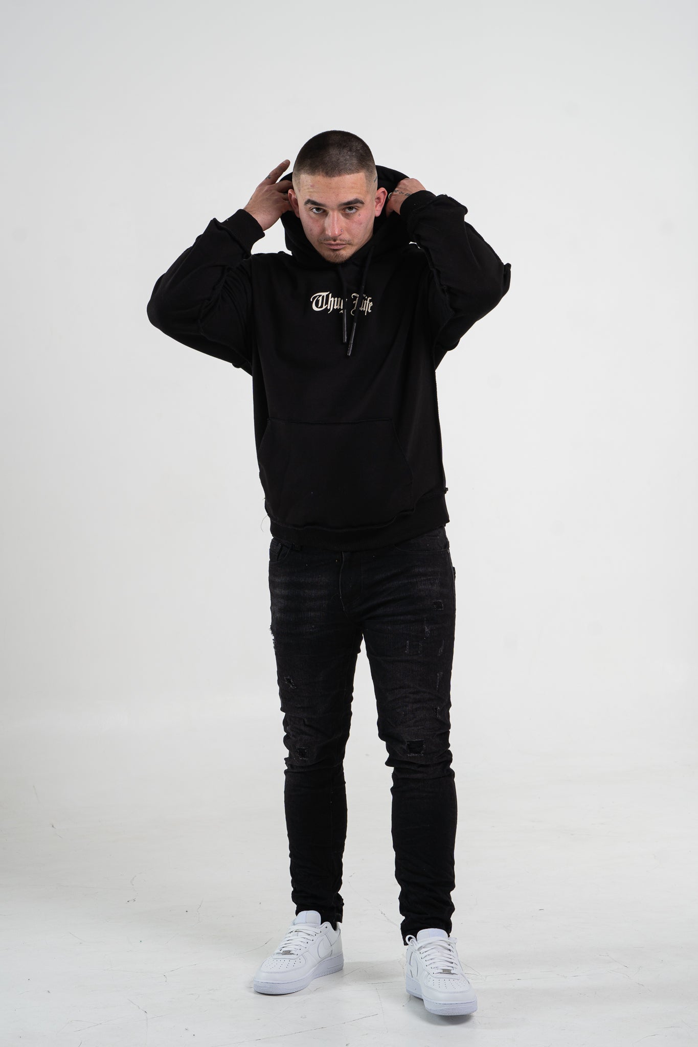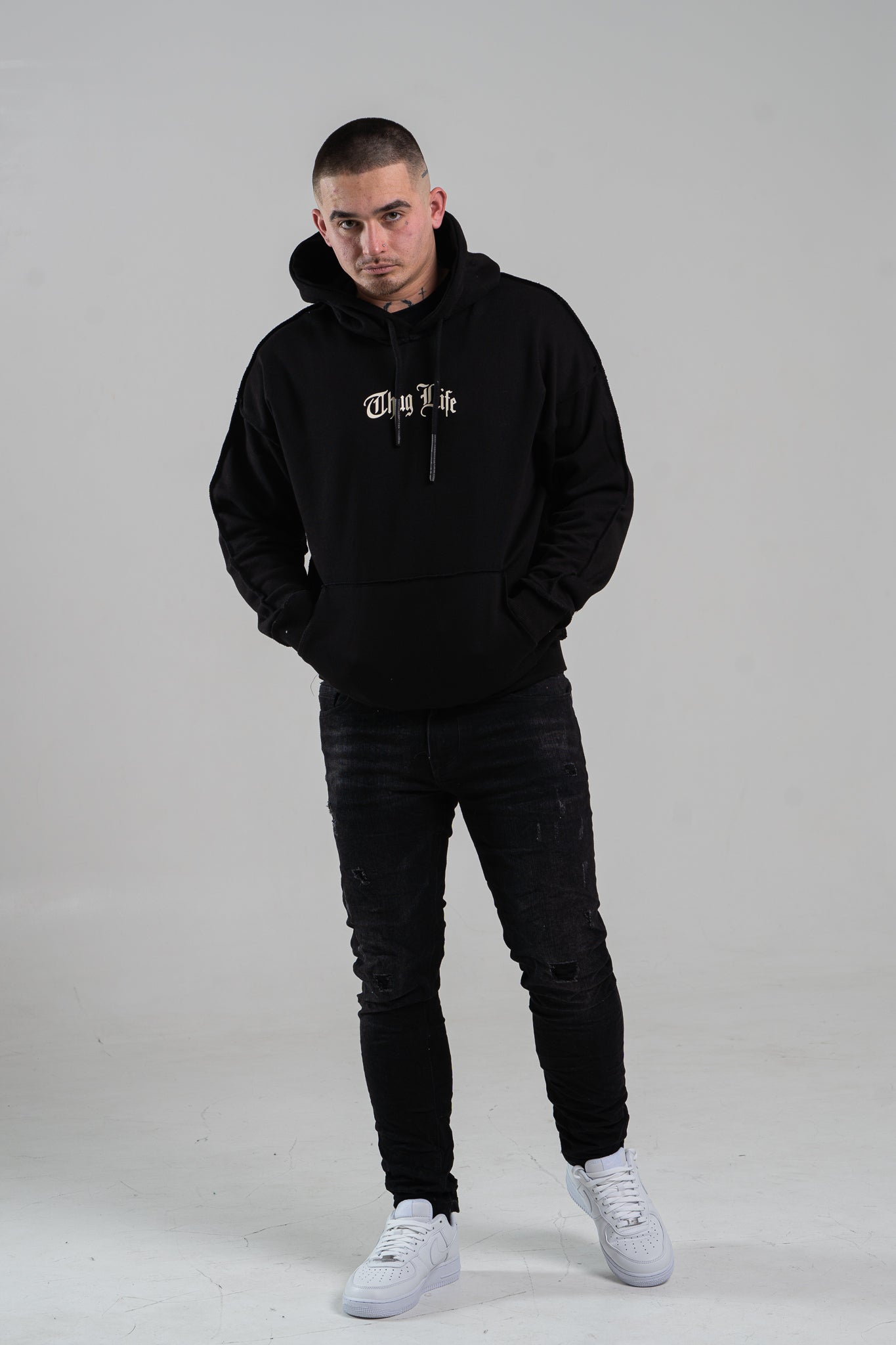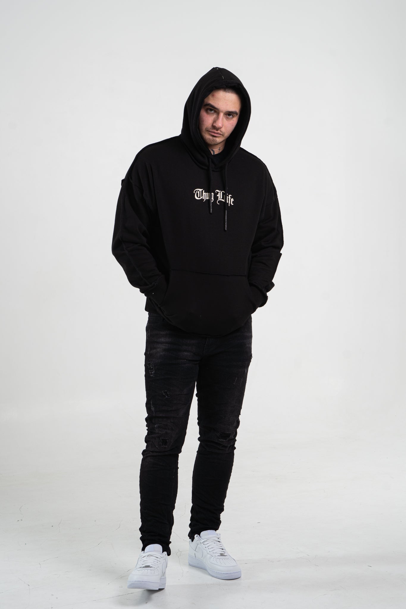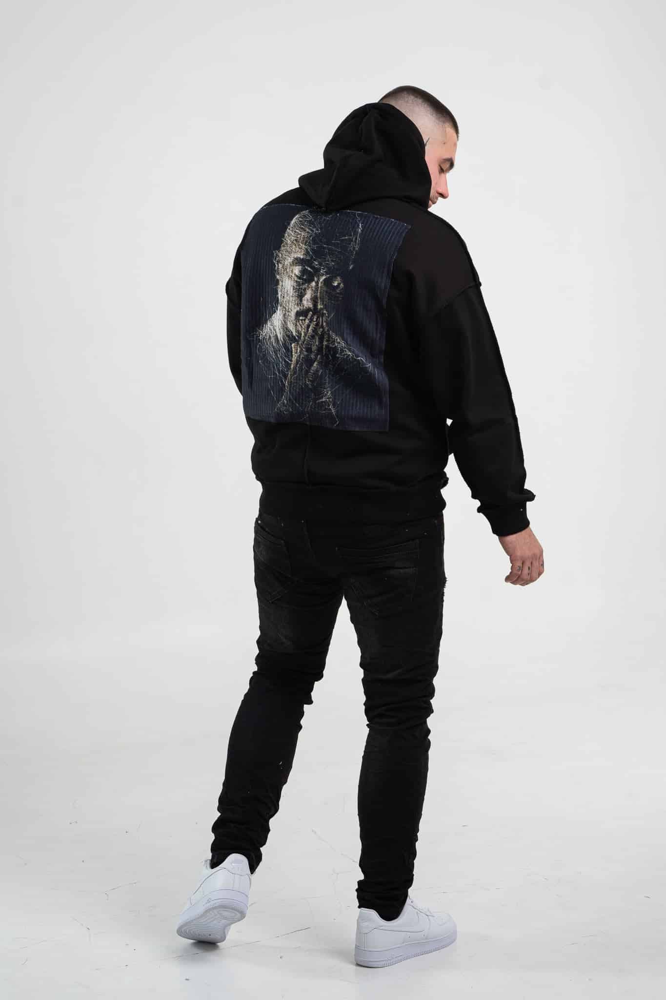 Czarna bluza męska o oversizowym kroju z dużym nadrukiem Tupac’a na plecach. Wykonana z wysokiej jakości materiału (65% bawełna, 35% poliester) ma kaptur oraz ozdobne przeszycia. Rękawy oraz dół bluzy zakończone są ściągaczem.