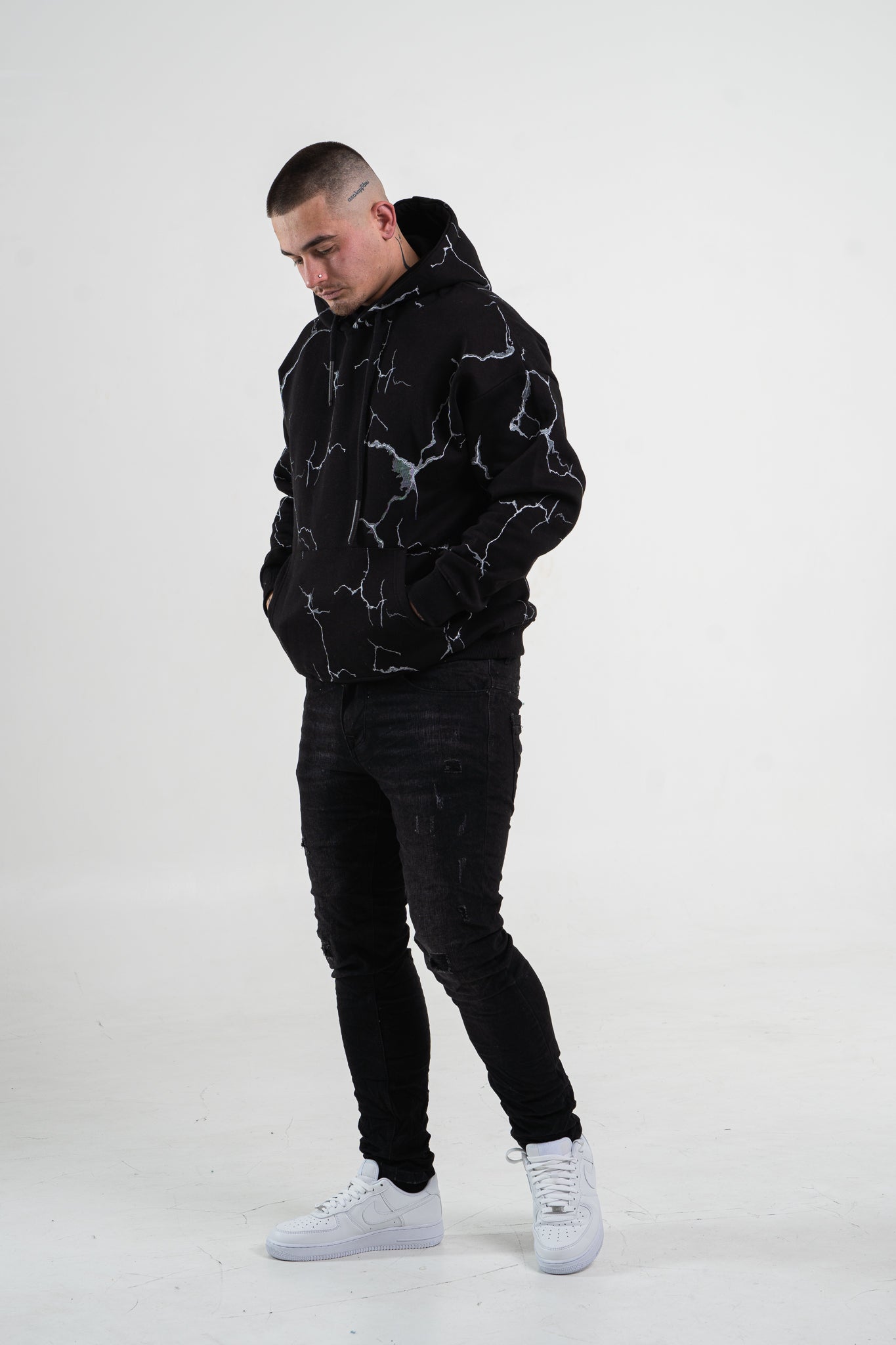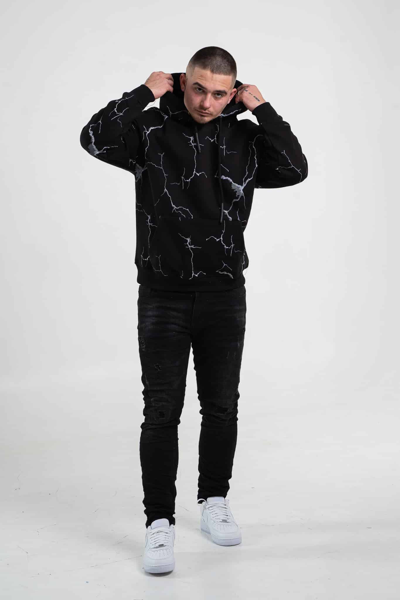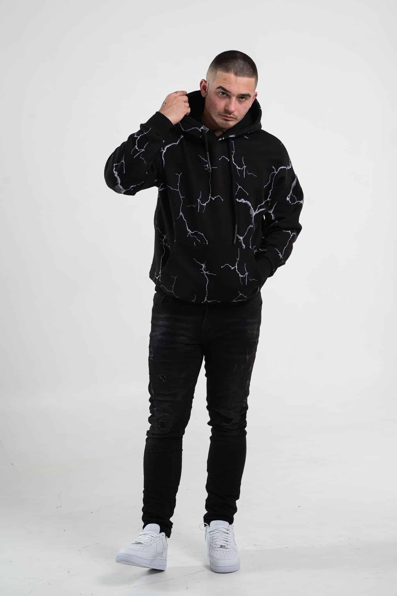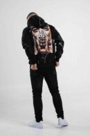 Czarna bluza męska o oversizowym kroju z dużym, ozdobnym nadrukiem na plecach. Wykonana z wysokiej jakości materiału (65% bawełna, 35% poliester) posiada regulowany sznurkiem kaptur oraz kieszeń kangurkę. Rękawy oraz dół bluzy zakończone są ściągaczem. Uwagę zwracają również czarne linie, które znajdują się na całej powierzchni bluzy.