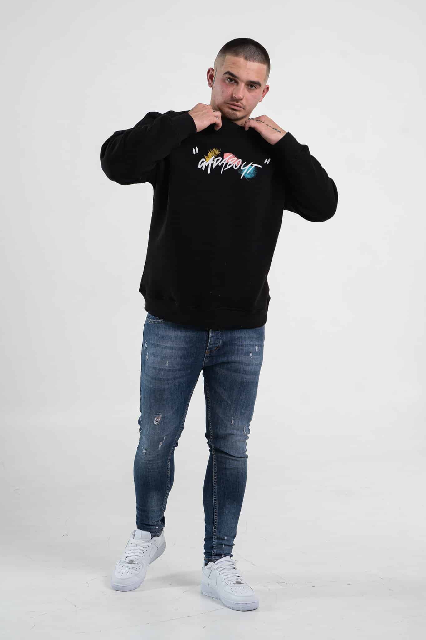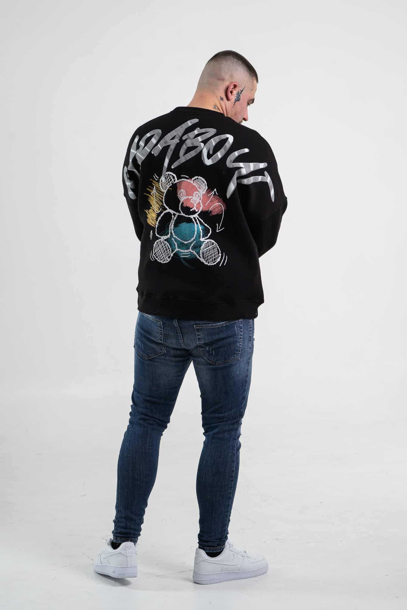Czarna bluza męska o oversizowym kroju z dużym, ozdobnym nadrukiem na plecach. Wykonana z wysokiej jakości materiału (65% bawełna, 35% poliester). Nie posiada kaptura ani żadnej kieszeni. Rękawy oraz dół bluzy zakończone są ściągaczem. Uwagę zwraca również napis, który znajduje się na przodzie bluzy.