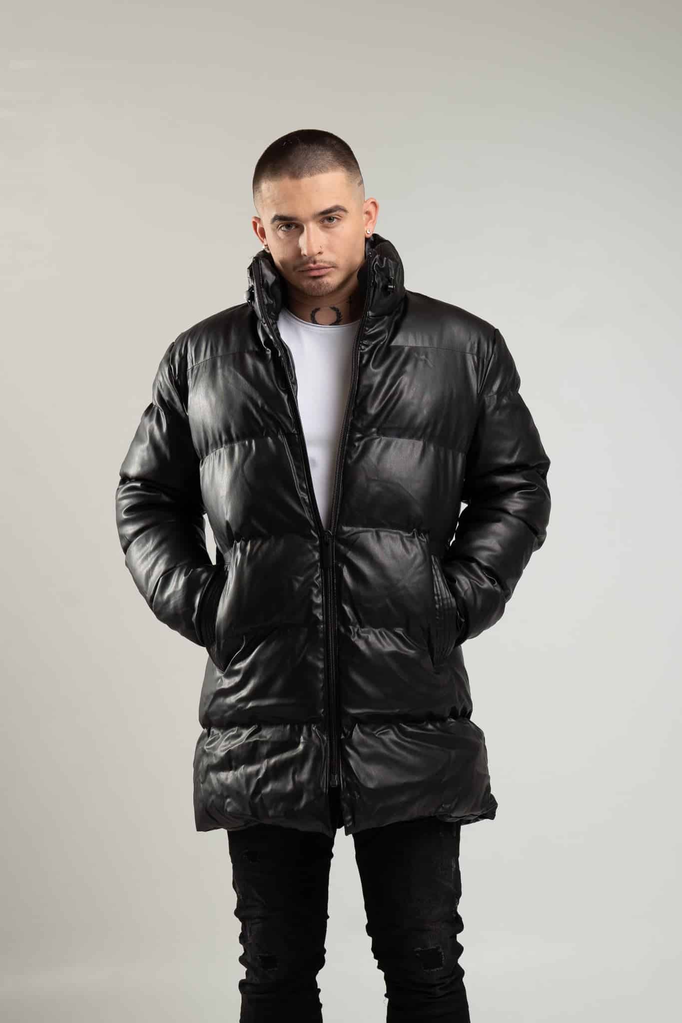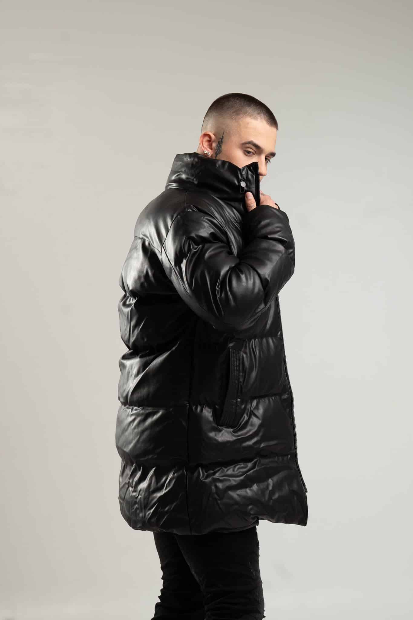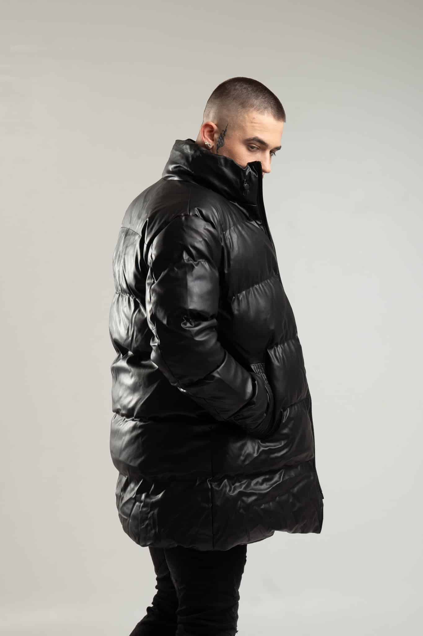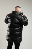 Bardzo ciepła, długa, czarna, lakierowana, pikowana kurtka męska typu parka. Nie posiada kaptura. Zapinana jest na zamek. Ma dwie kieszenie zewnętrzne. Wewnątrz znajduje się jedna kieszeń piersiowa zapinana na zamek.