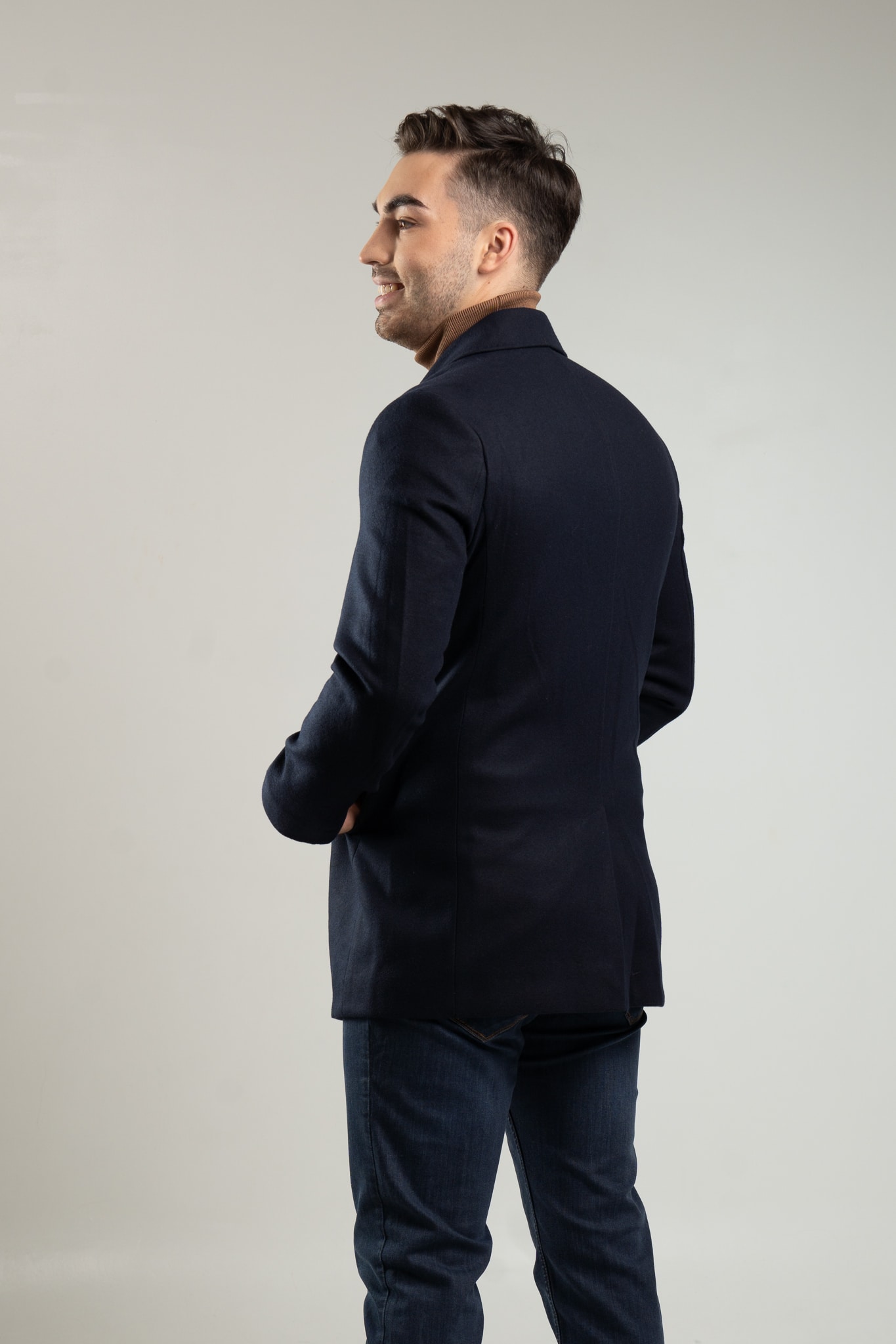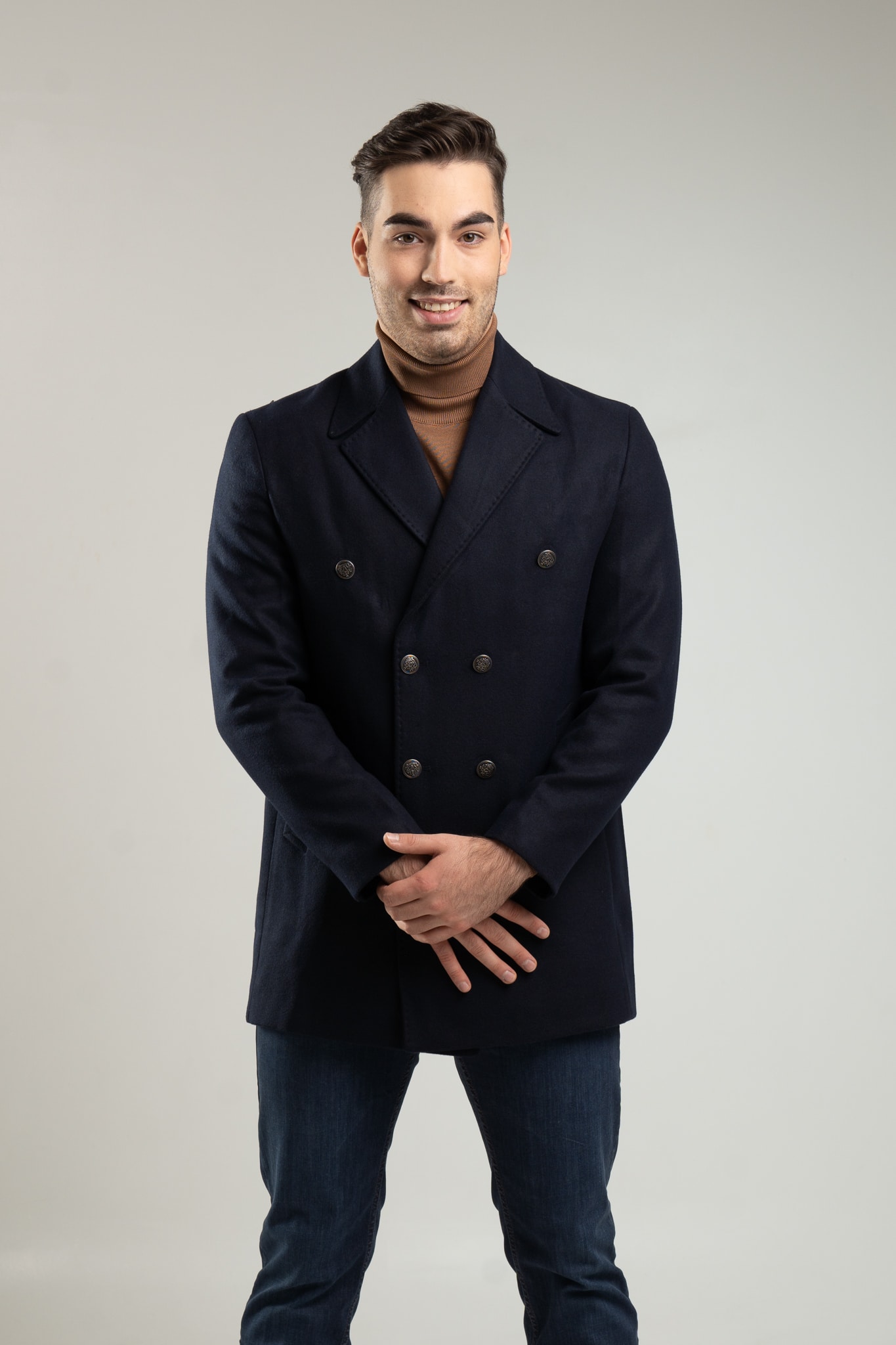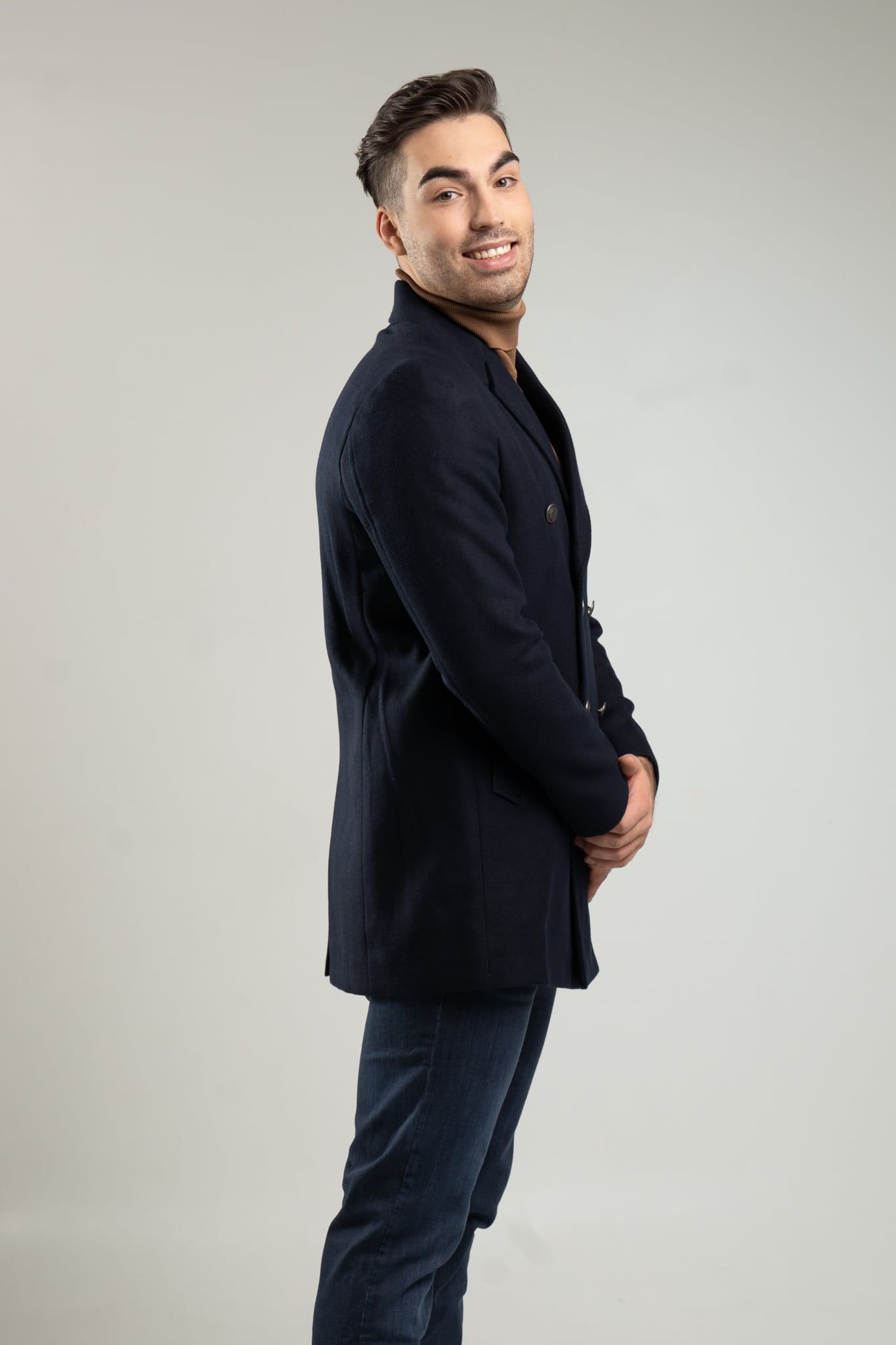 – granatowy, dwurzędowy płaszcz męski