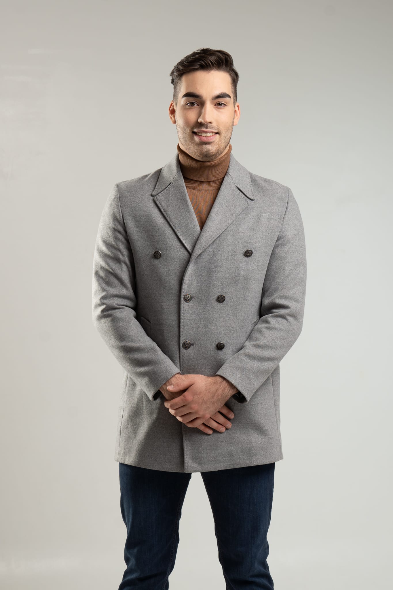 – szary, dwurzędowy płaszcz męski