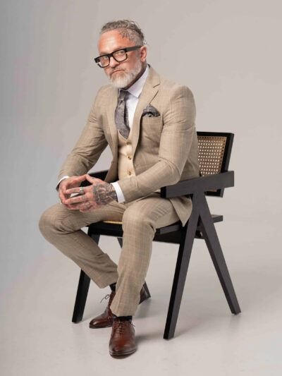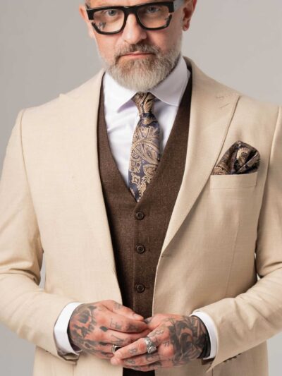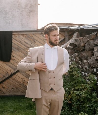 Dzięki perfekcyjnie skrojonemu fasonowi garnitur pięknie podkreśla sylwetkę, a wysokiej jakości tkanina gwarantuje komfort noszenia. Stylizację można uzupełnić kontrastową kamizelką, klasyczną białą koszulą oraz dodatkami w odcieniach beżu lub granatu, które dopełnią całość. To propozycja dla mężczyzn, którzy chcą wyróżniać się klasą i stylem w każdej sytuacji.