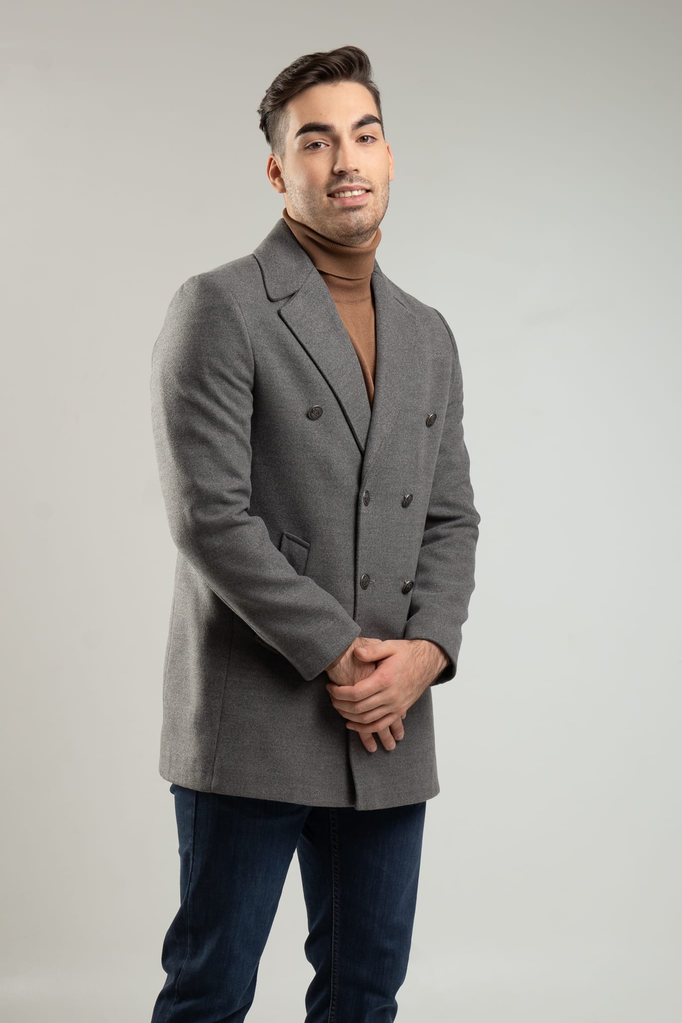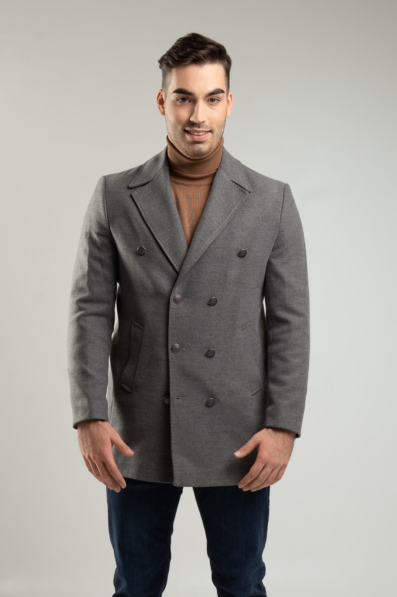 – grafitowy, dwurzędowy płaszcz męski