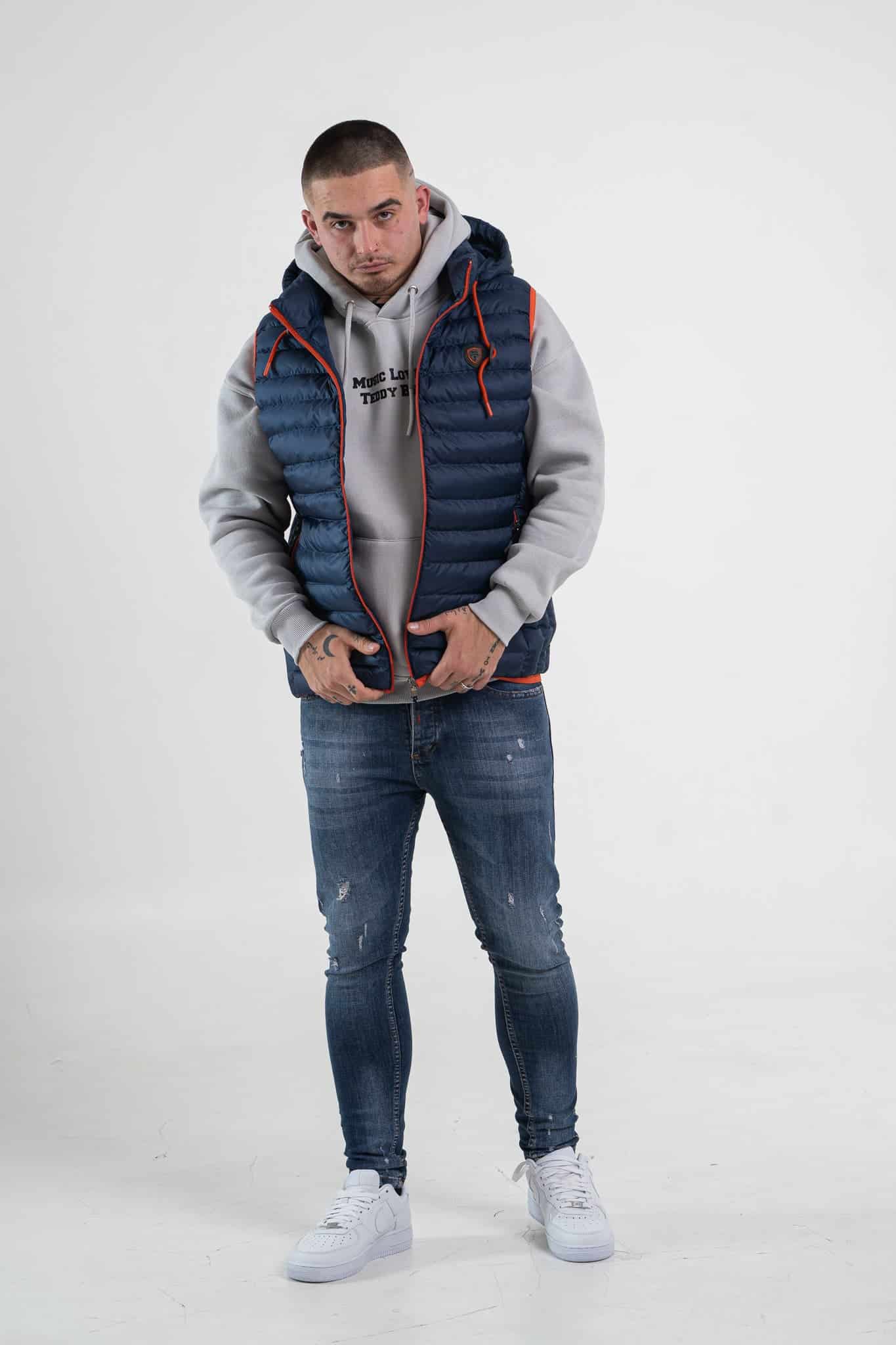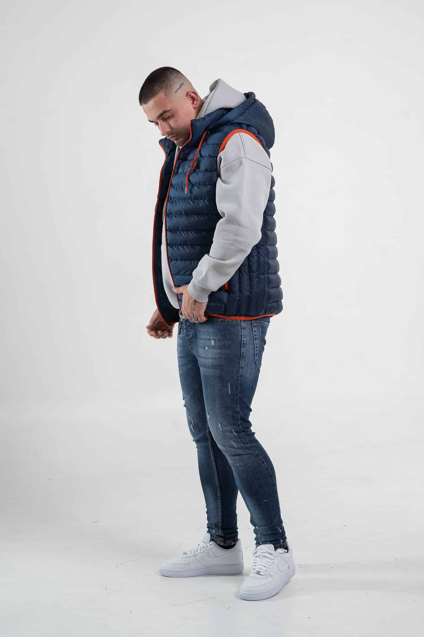 Granatowy bezrękawnik męski z kapturem z pomarańczowym ściągaczem