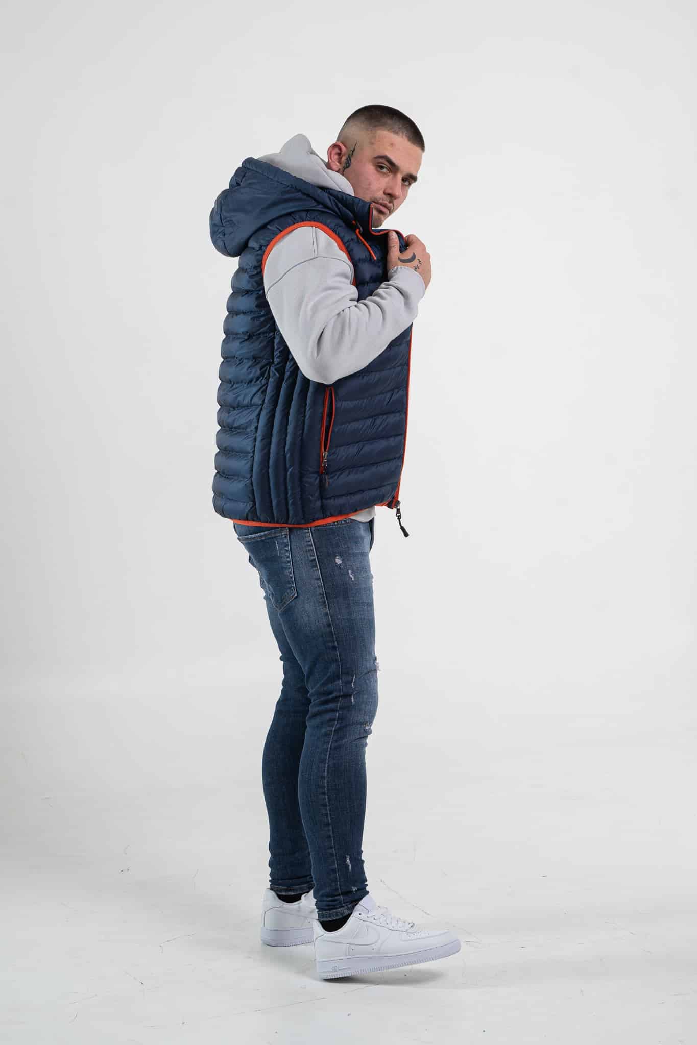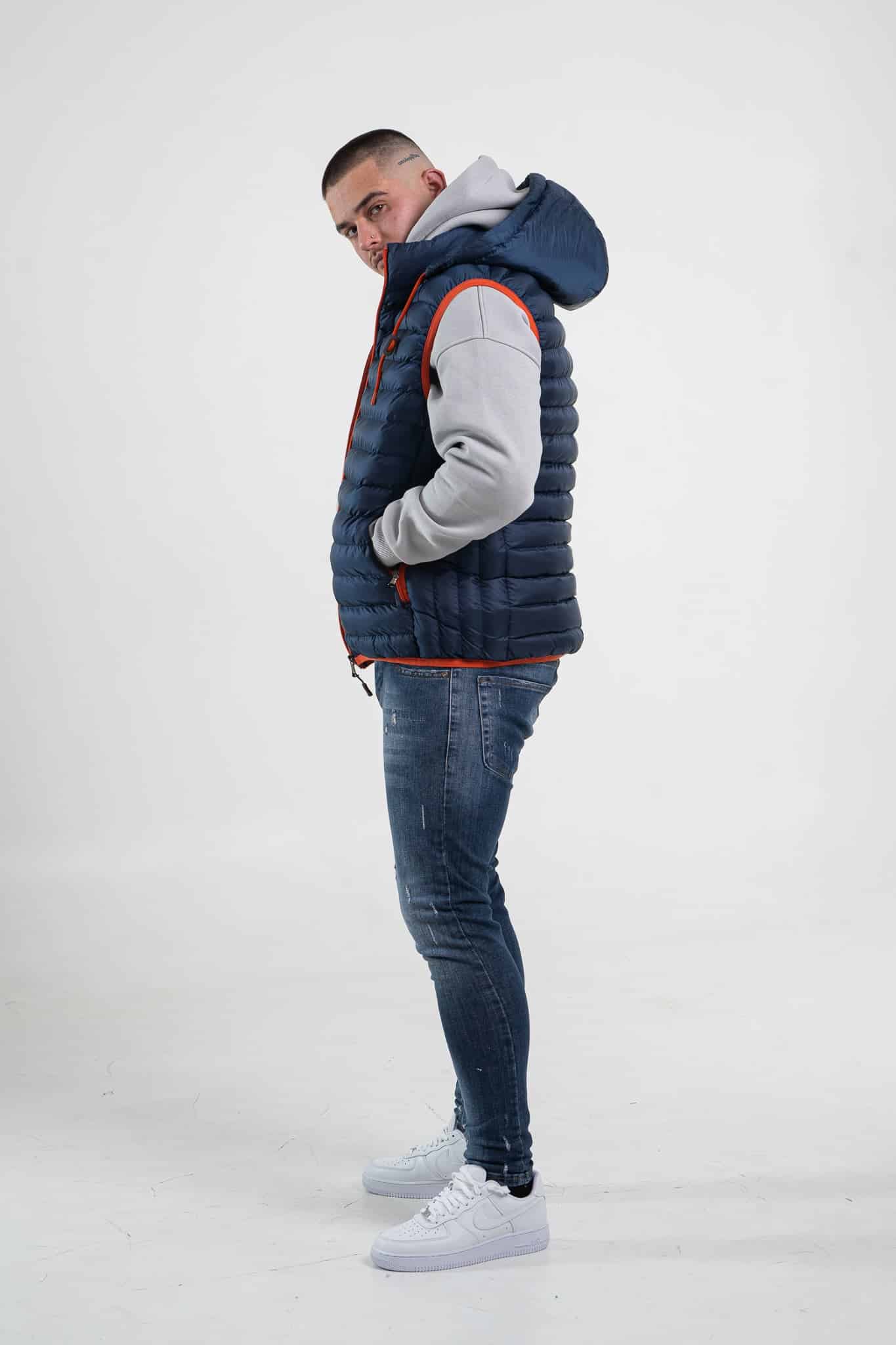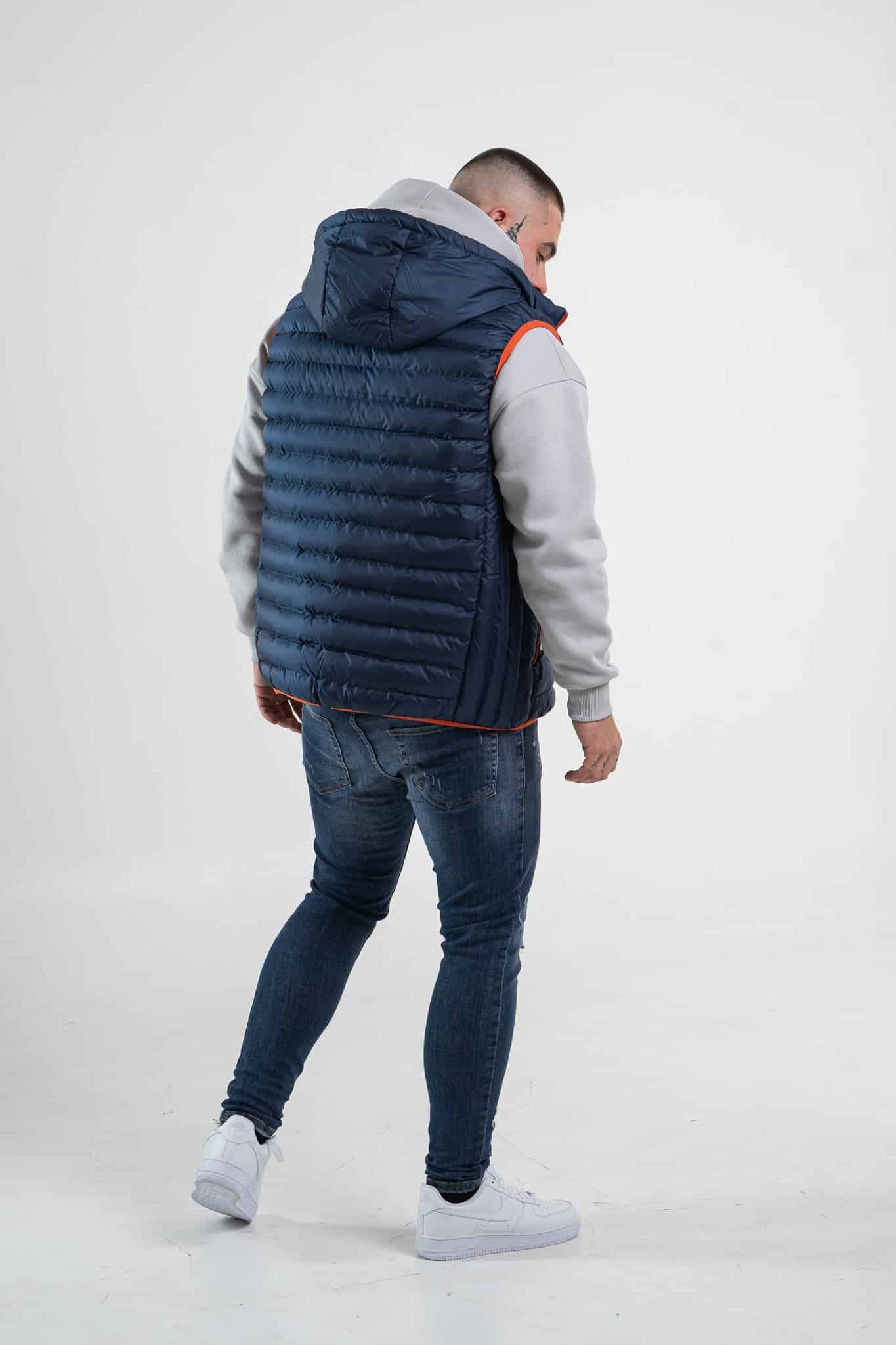 Granatowy bezrękawnik męski z kapturem (kaptur można odpiąć) o kroju dopasowanym. Posiada dwie kieszenie zapinane na zamek. Wykończony jest cienkim pomarańczowym ściągaczem. Z przodu, po lewej stronie umieszczony jest mały znaczek z logo.