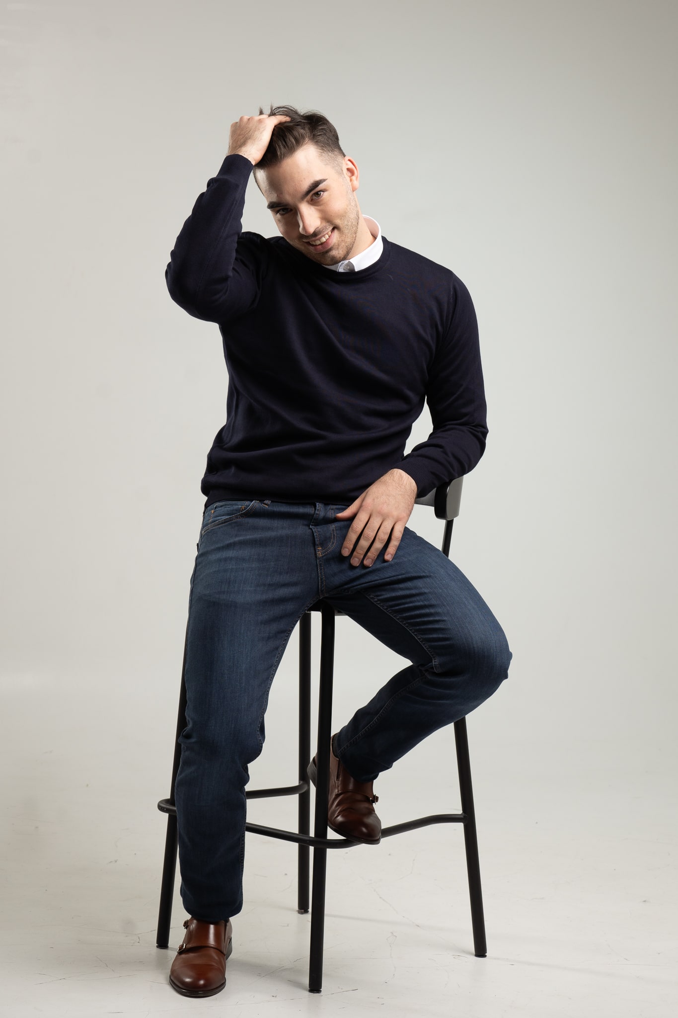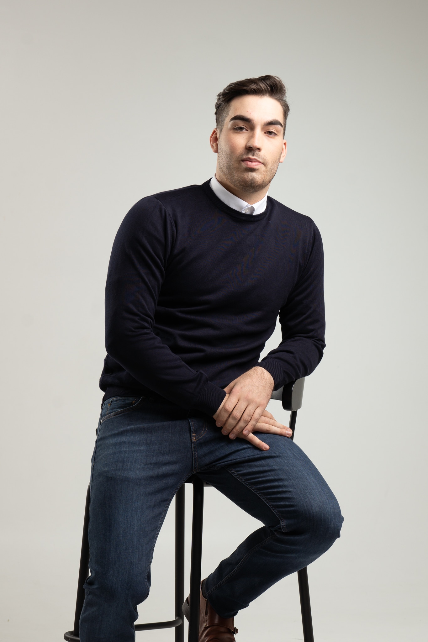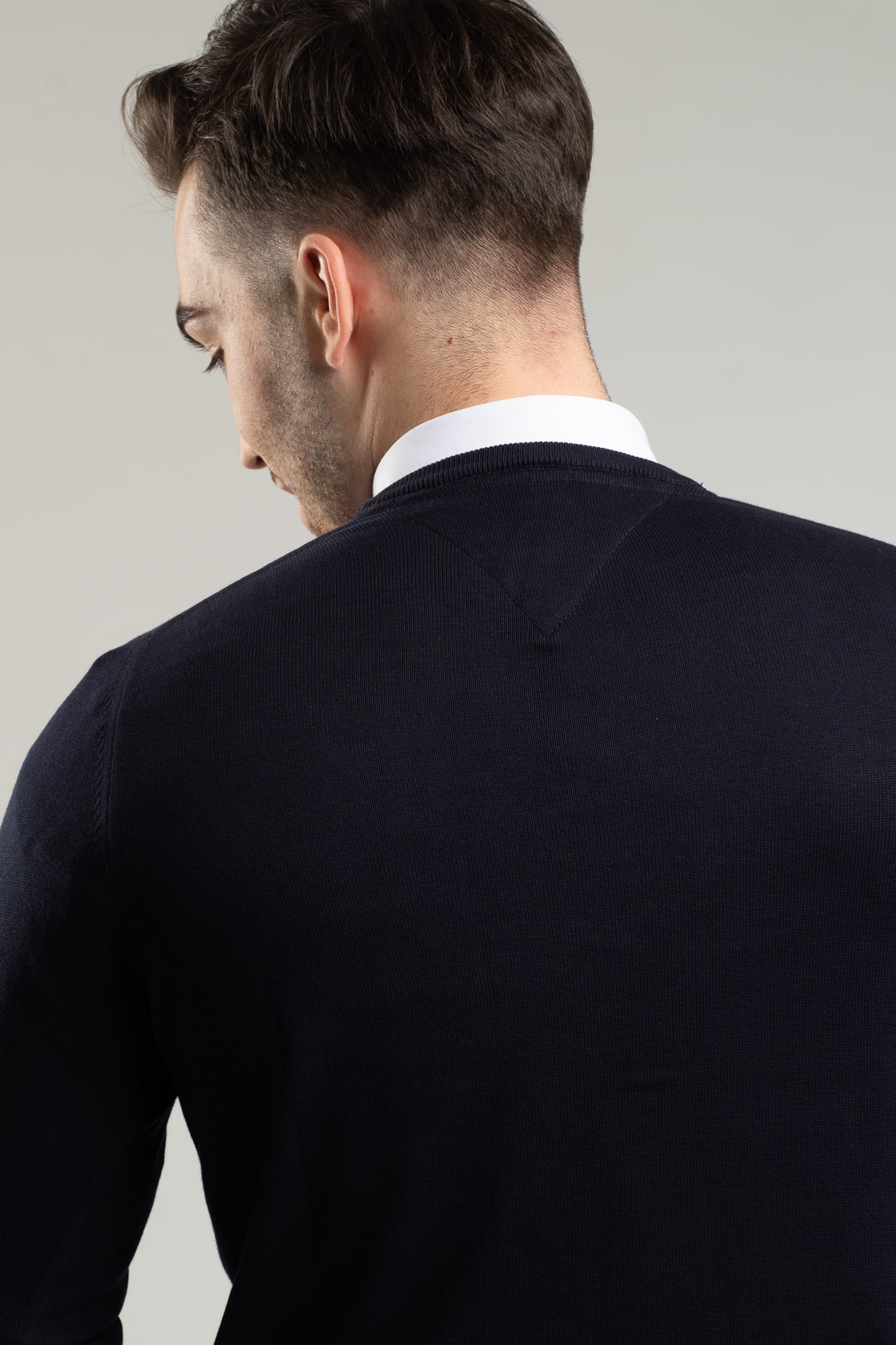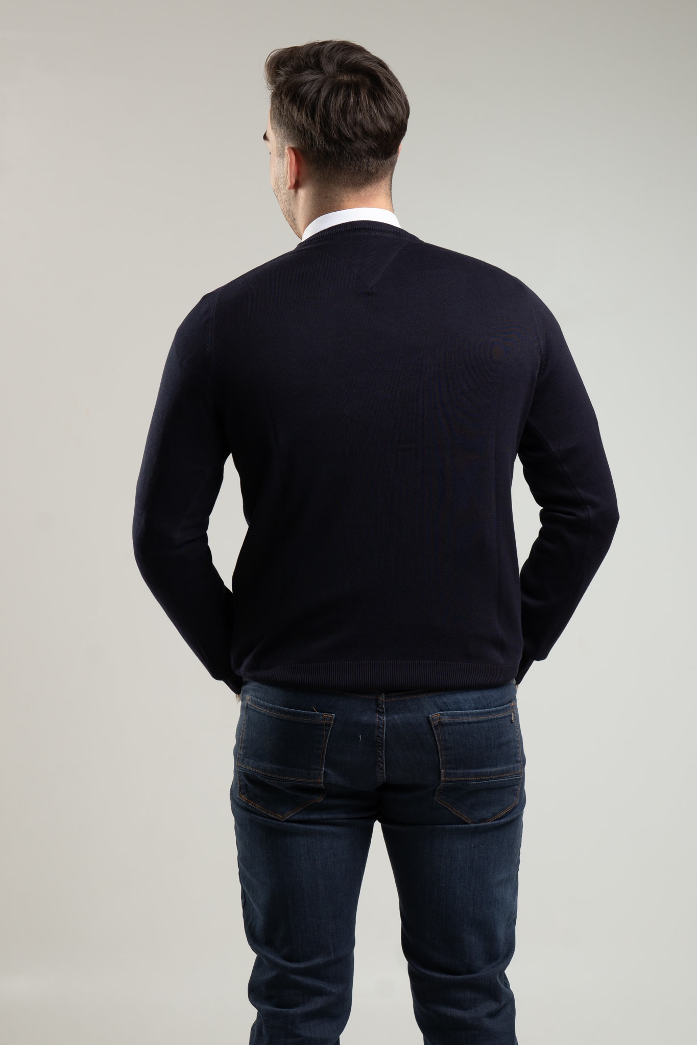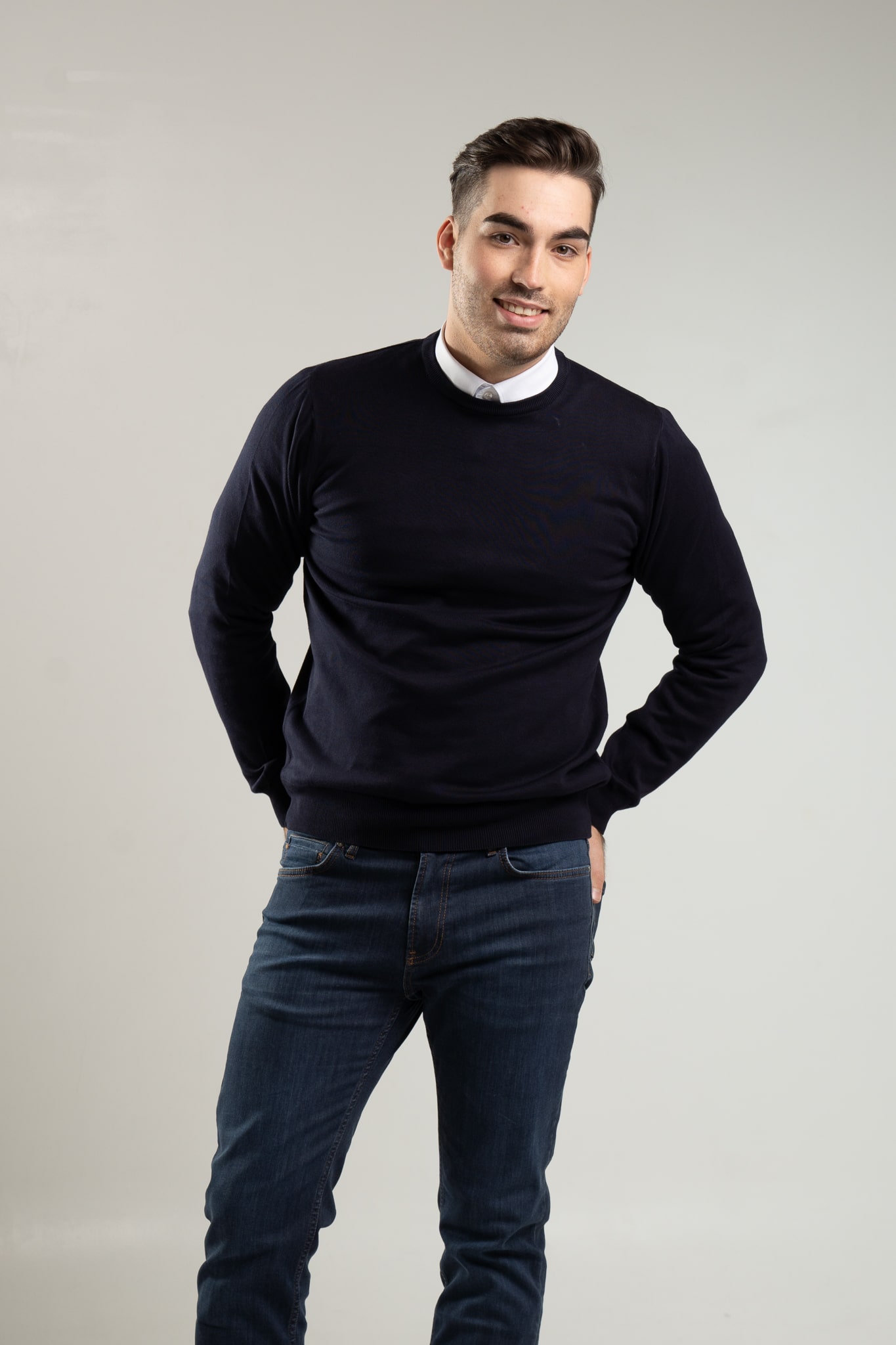 Sweter męski z okrągłym dekoltem w kolorze granatowym wykonany został z najwyższej jakości tkaniny bawełnianej (100% bawełny), co gwarantuje najwyższy komfort użytkowania. Wyposażony został w ściągacze przy szyi, w pasie i w rękawach dla zapewnienia maksymalnego komfortu termicznego. Cechuje go jakość wykonania oraz dbałość o detale.
