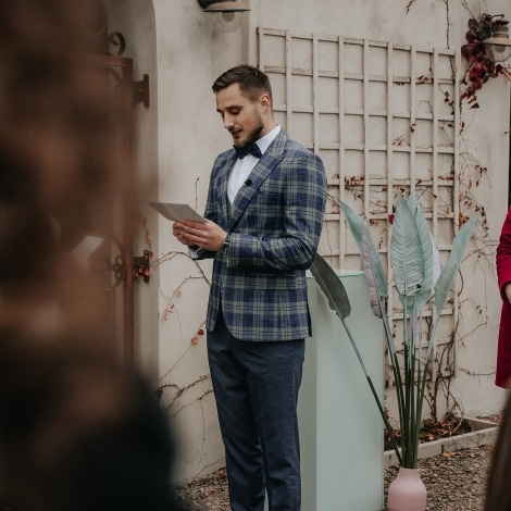 – garnitur typu slim-fit, trzyczęściowy (szaro – niebieska marynarka w kratę, szara kamizelka oraz spodnie w kolorze niebieskim)