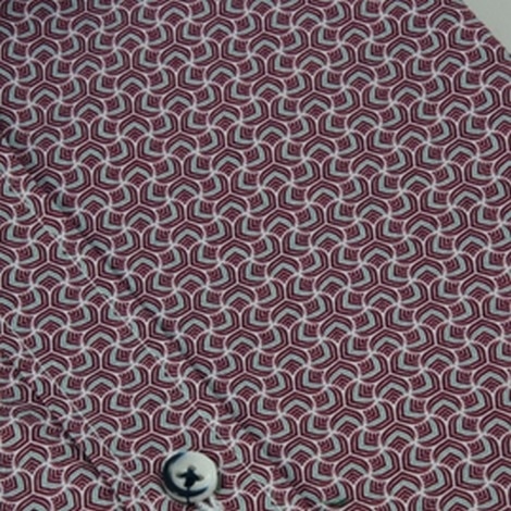 Koszula męska 201708-1 w szaro-bordowe wzory. Wykonana z wysokiej jakości tkaniny bawełnianej (100% bawełny) o kroju slim-fit. Kołnierzyk typu kryty button-down (guziki zapina się po wewnętrznej, niewidocznej stronie kołnierzyka). Mankiet zapinany na guziki z możliwością regulacji.