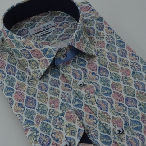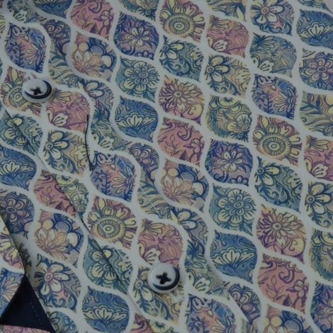 Koszula męska 201803 z graficznym deseniem kwiatów w pastelowych kolorach. Wykonana z wysokiej jakości tkaniny bawełnianej (100% bawełny) o kroju slim-fit. Kołnierzyk typu kryty button-down (guziki zapina się po wewnętrznej, niewidocznej stronie kołnierzyka). Mankiet zapinany na guziki z możliwością regulacji.