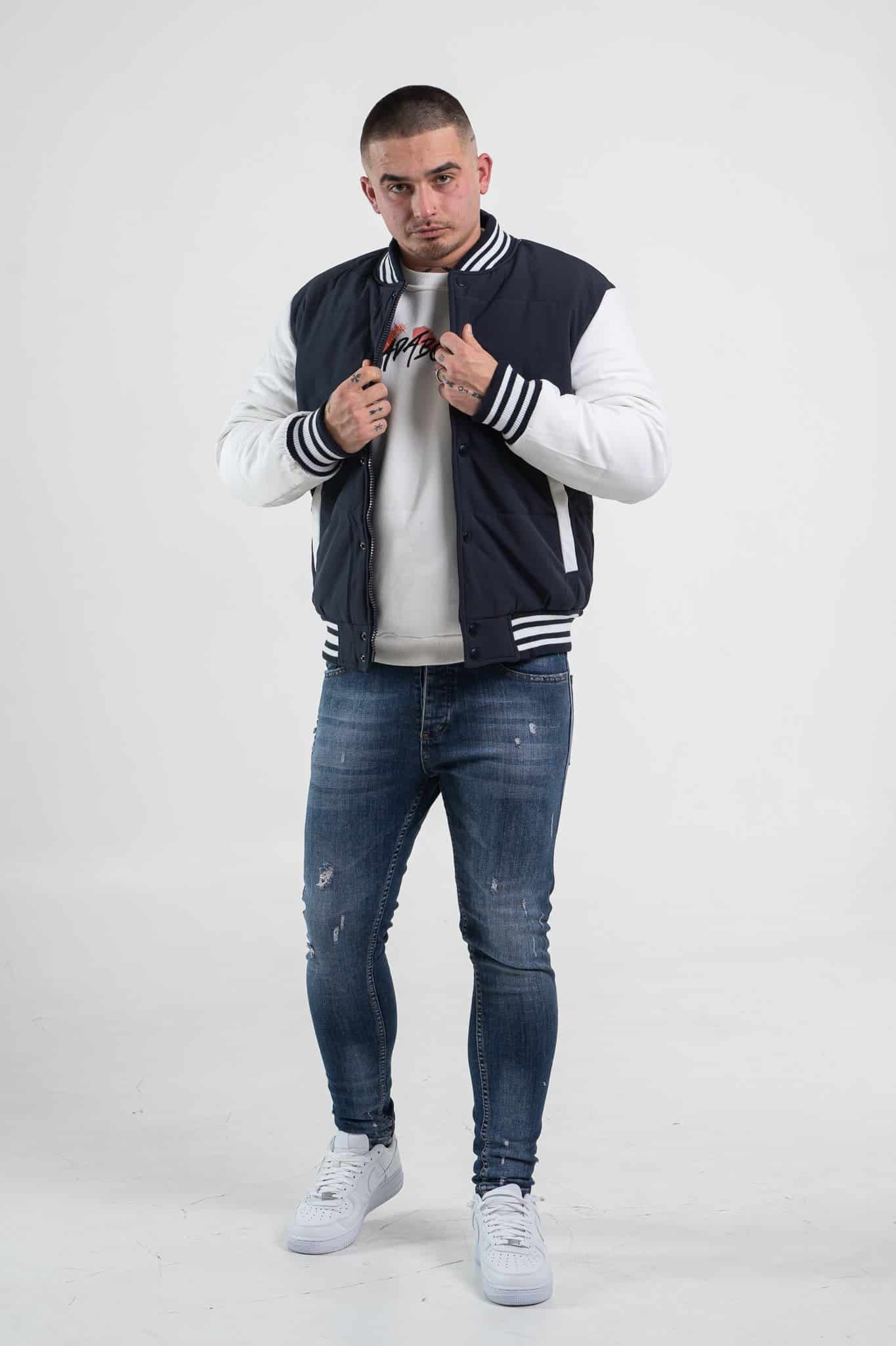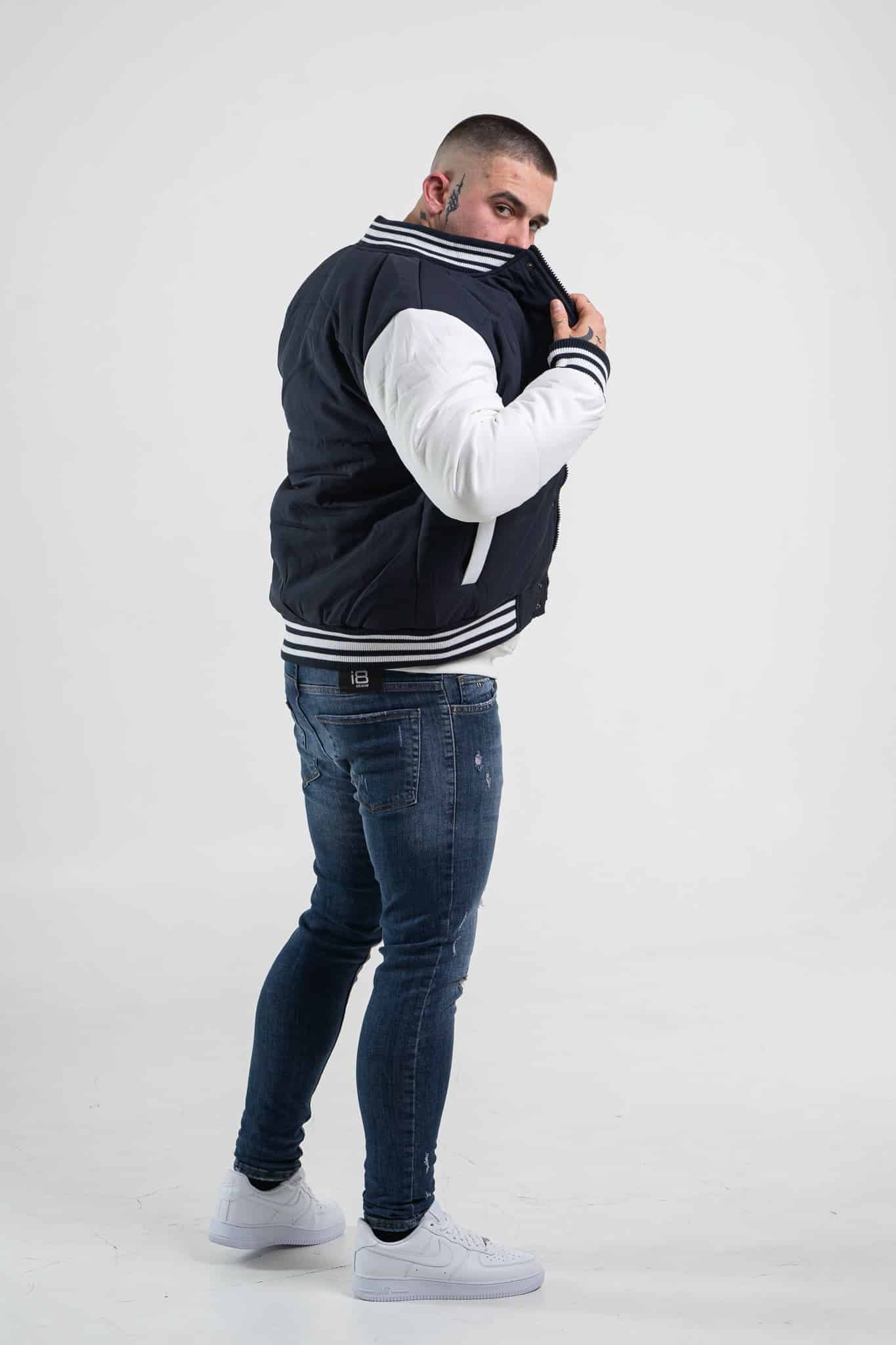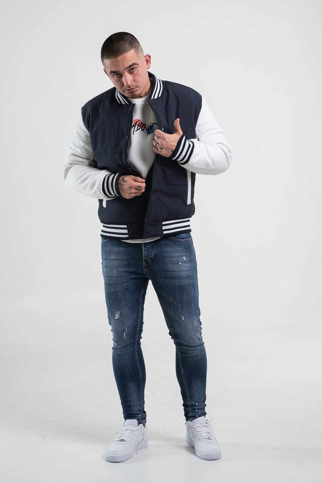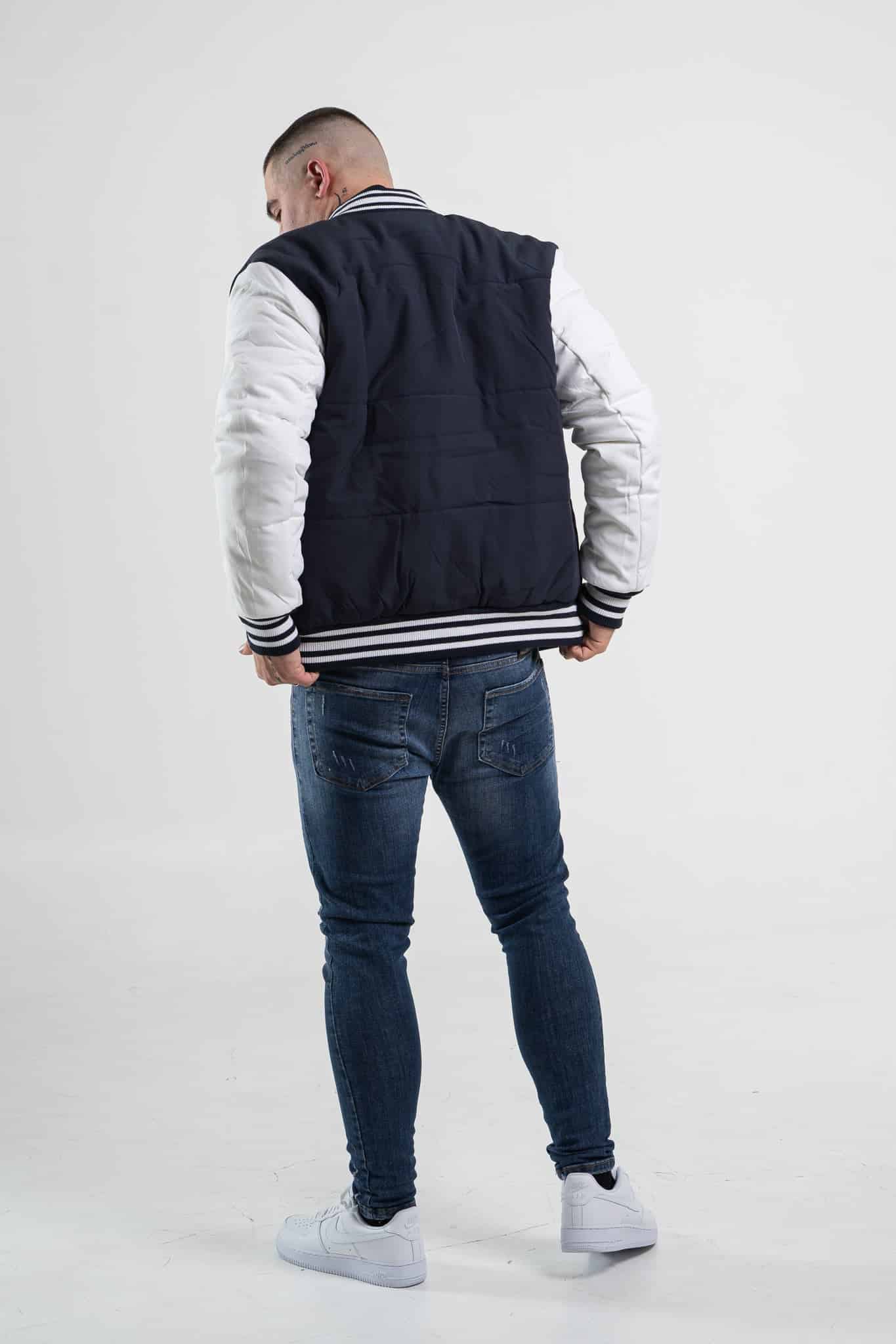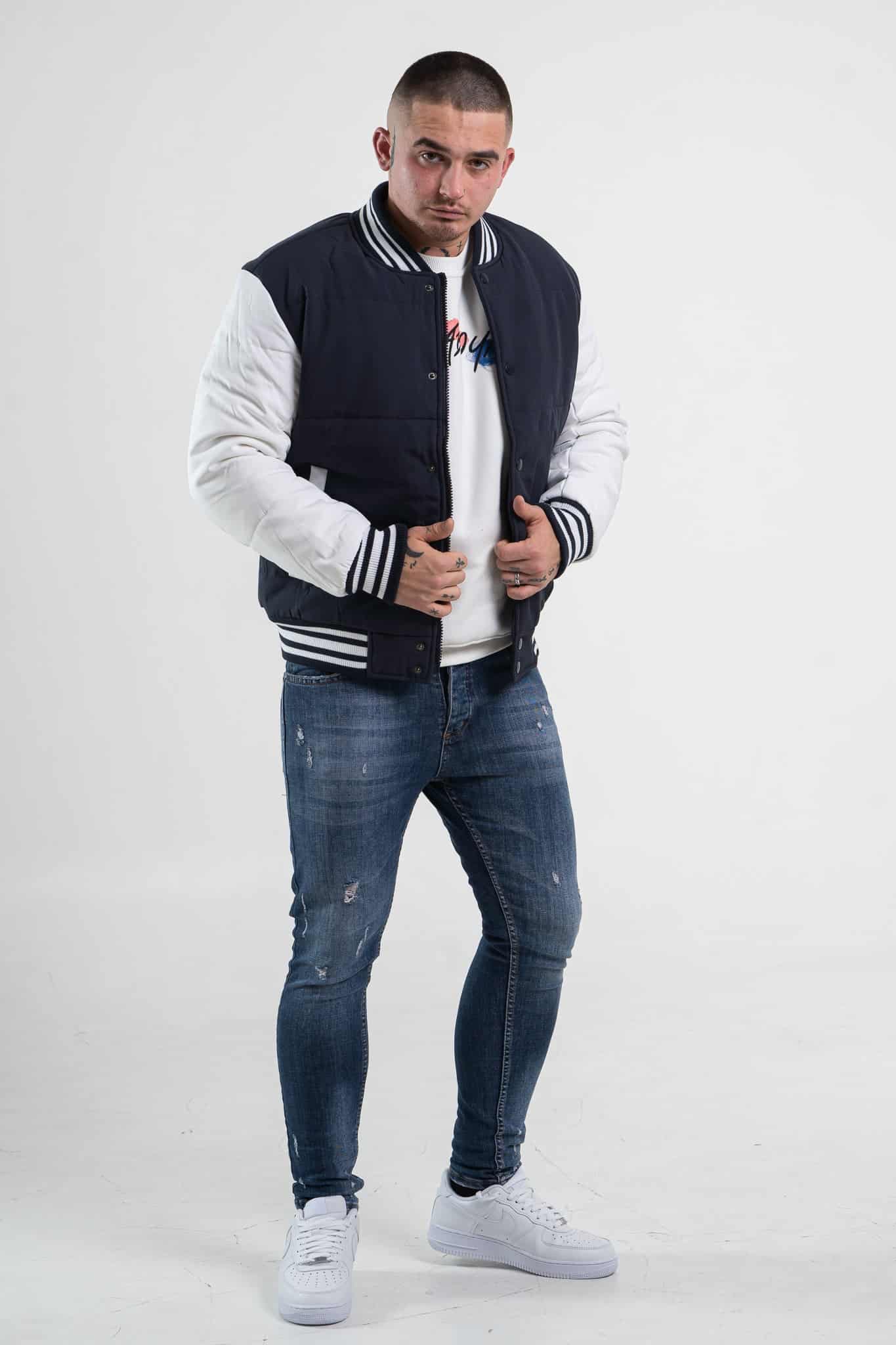 Stylowa i niezwykle modna kurtka męska typu bomberka w kolorze granatowym z białymi rękawami. Zapinana na napy. Posiada dwie kieszenie boczne. Wewnątrz znajduje się jedna kieszeń piersiowa. Rękawy, kołnierz oraz dół kurtki zakończone są czarno – białym ściągaczem.