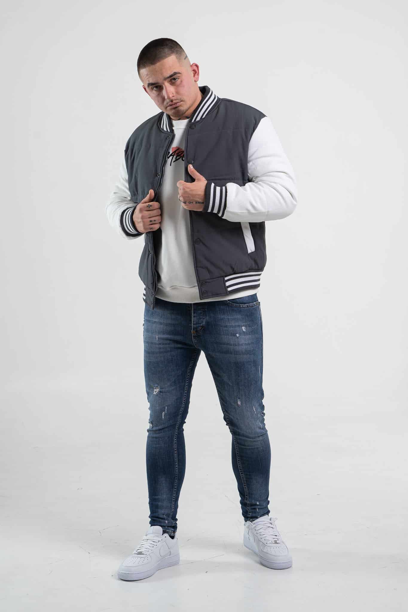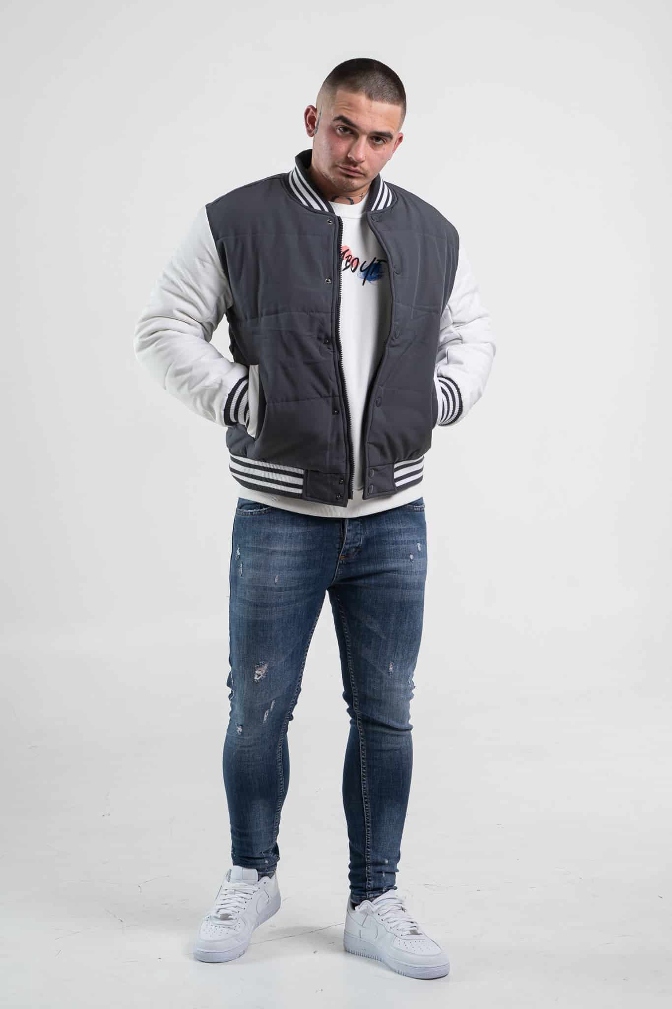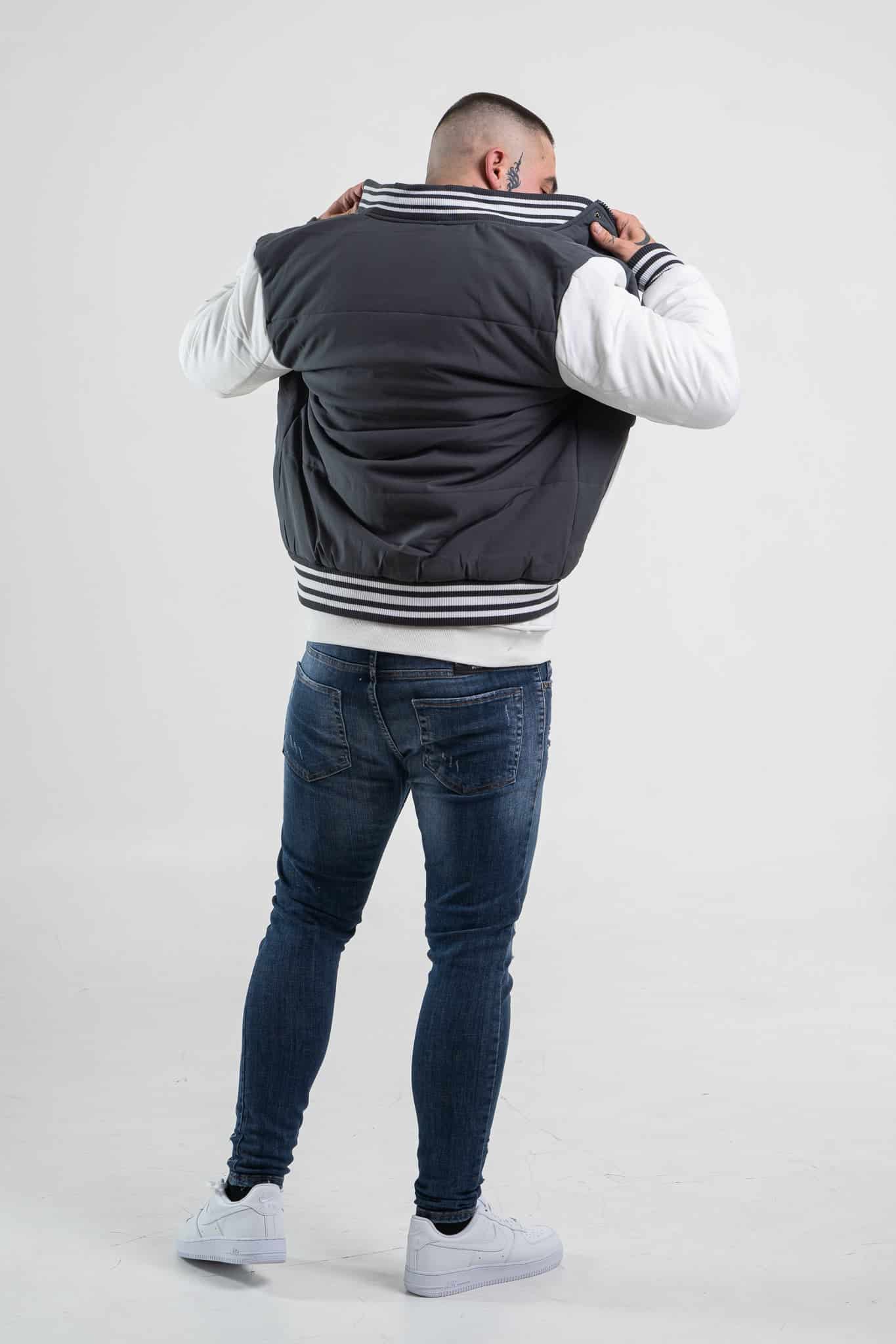 Stylowa i niezwykle modna kurtka męska typu bomberka w kolorze szarym z białymi rękawami. Zapinana na napy. Posiada dwie kieszenie boczne. Wewnątrz znajduje się jedna kieszeń piersiowa. Rękawy, kołnierz oraz dół kurtki zakończone są czarno – białym ściągaczem.