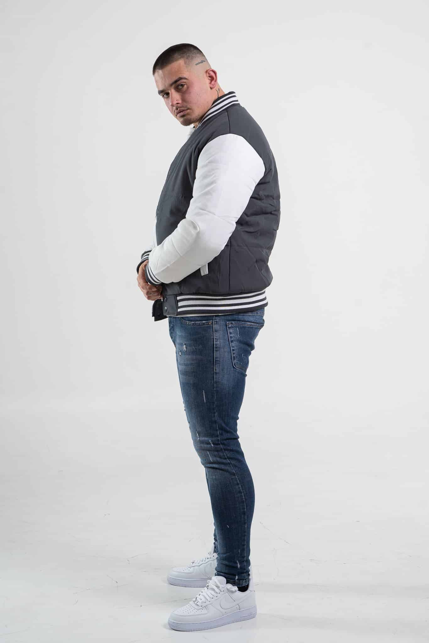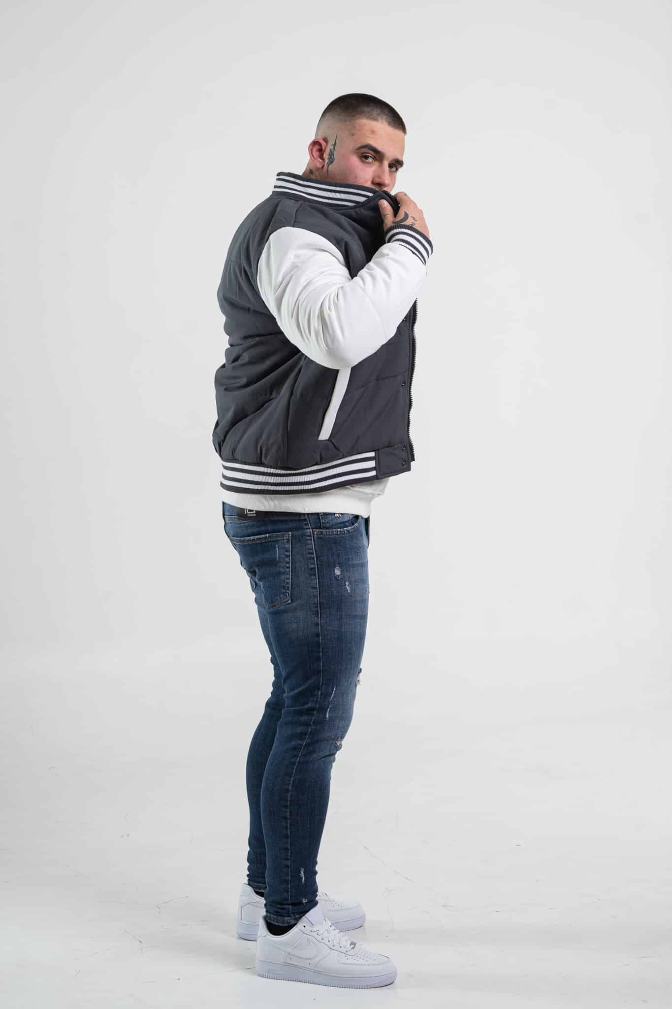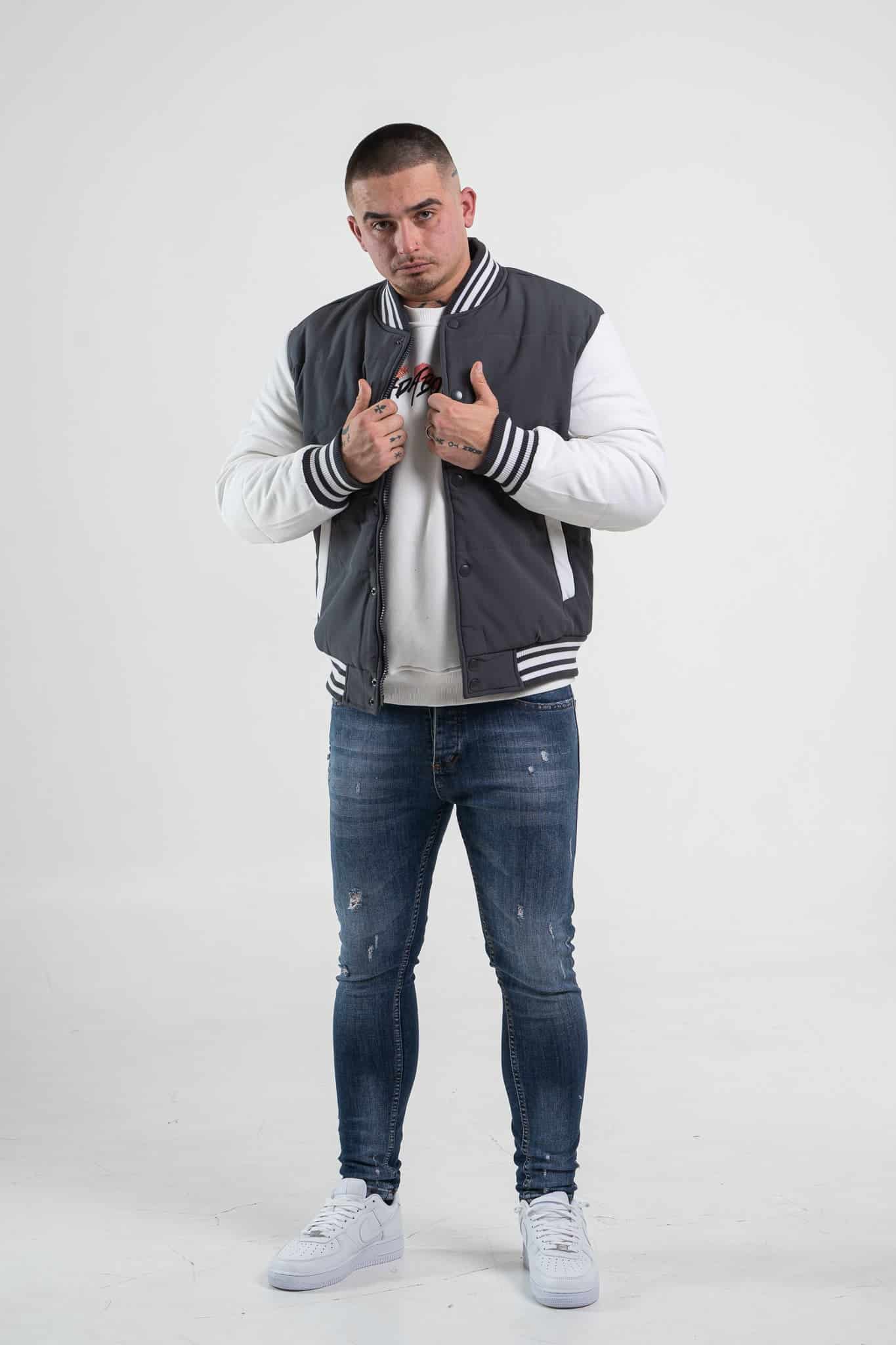 Stylowa i niezwykle modna kurtka męska typu bomberka w kolorze szarym z białymi rękawami. Zapinana na napy. Posiada dwie kieszenie boczne. Wewnątrz znajduje się jedna kieszeń piersiowa. Rękawy, kołnierz oraz dół kurtki zakończone są czarno – białym ściągaczem.