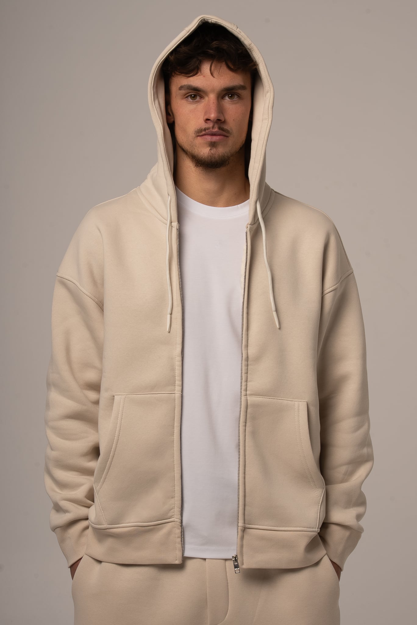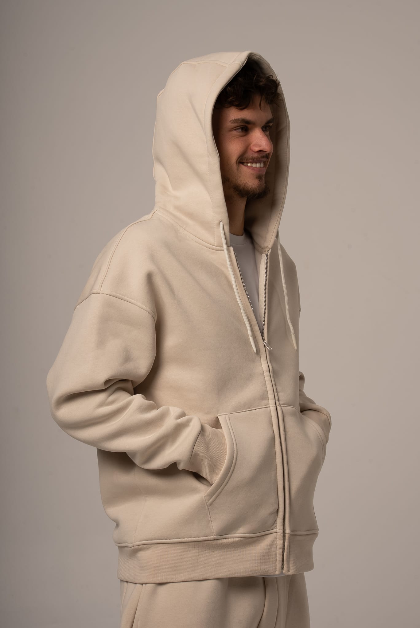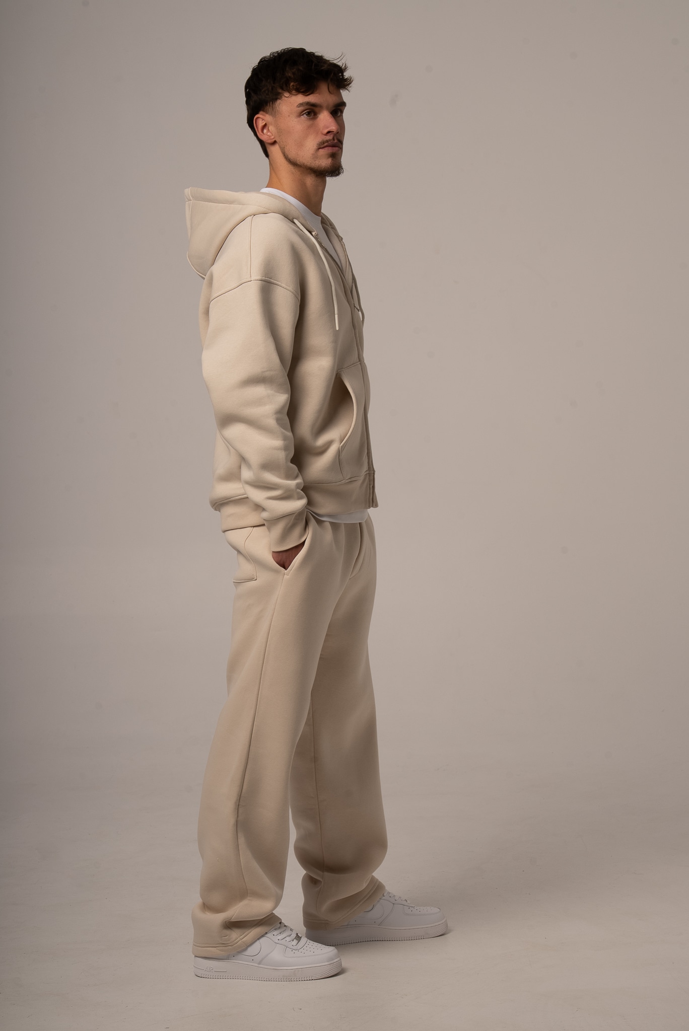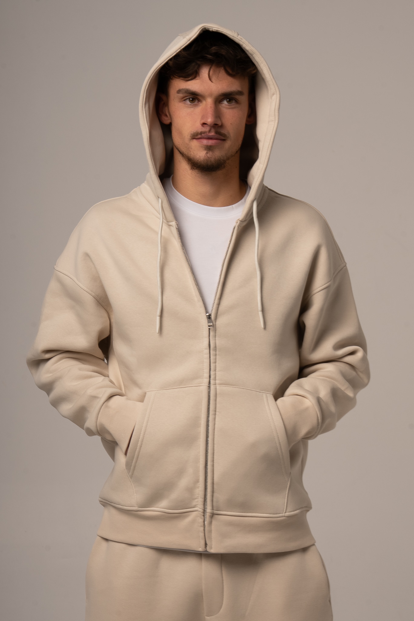 Męski komplet dresowy w kolorze beżowym z rozpinaną bluzą
