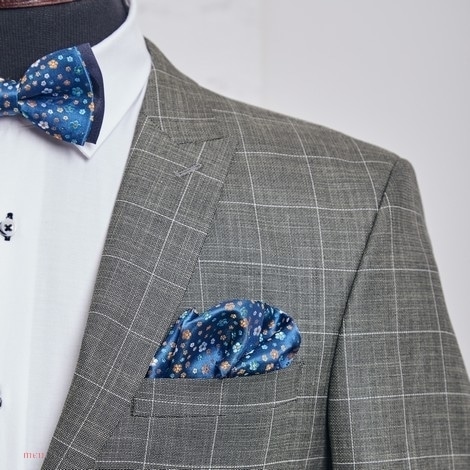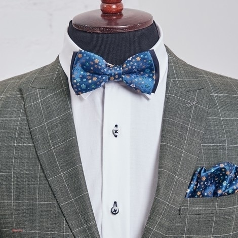 Mucha marki Men Island w niebieskim kolorze, ze stylowym, różnokolorowym akcentem kwiatowym (odcienie zielonego, szarego, pomarańczowego, żółtego oraz błękitnego), wykonana z najwyższej jakości materiałów. Rodzaj przedstawionej muchy to nowoczesny motyl, czyli Modern Butterfly.