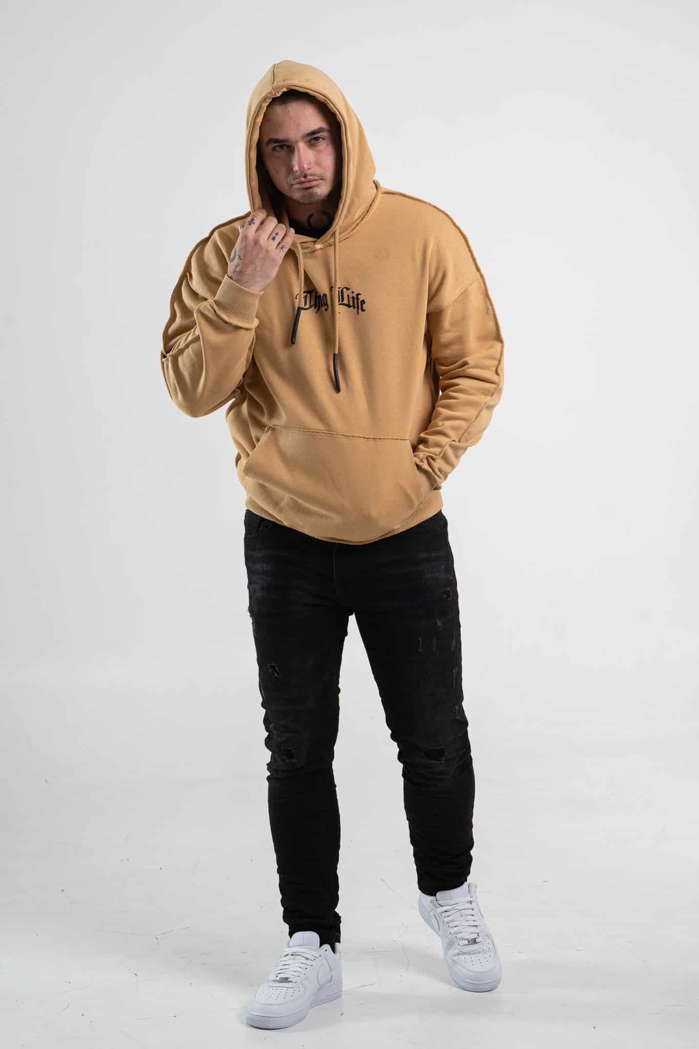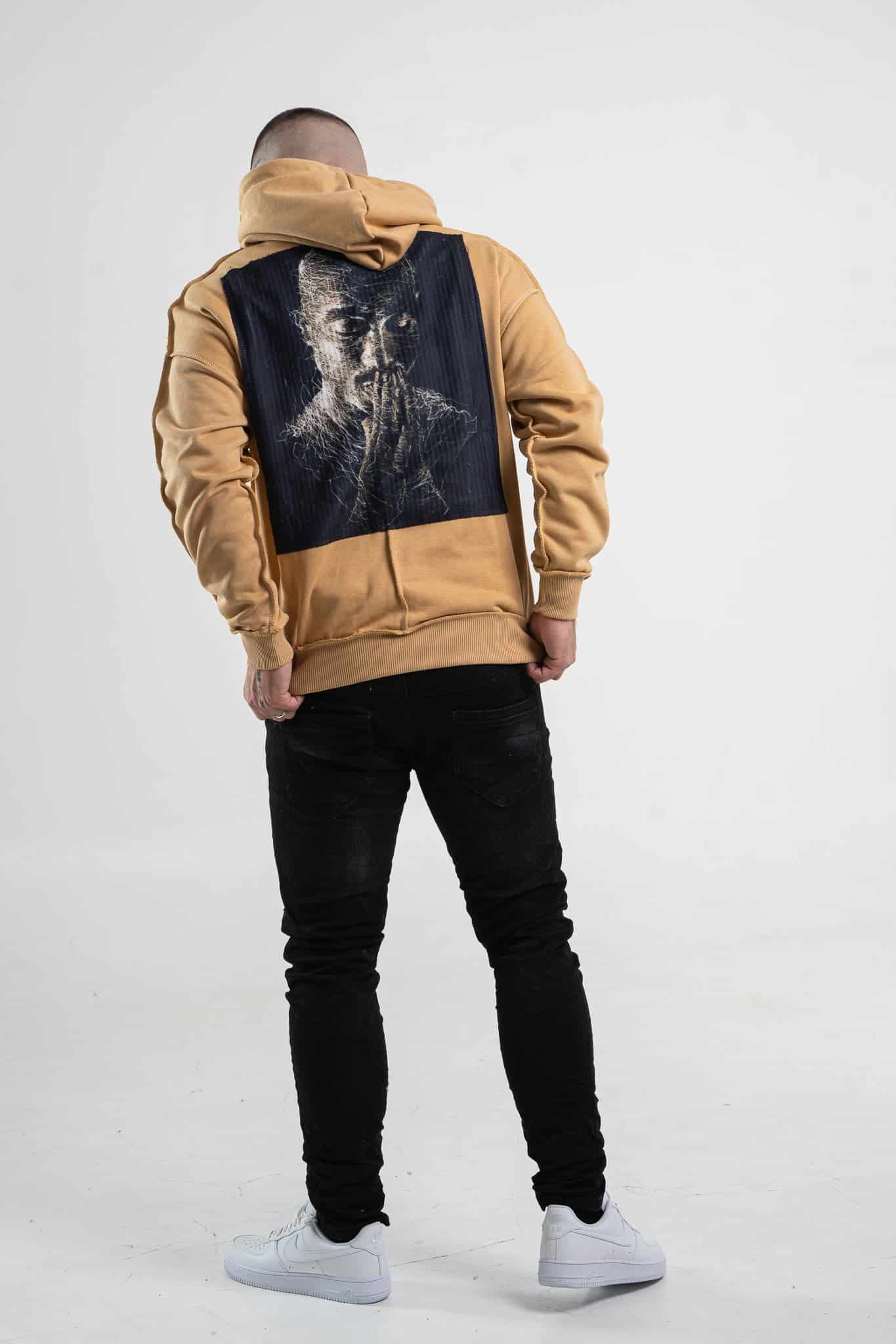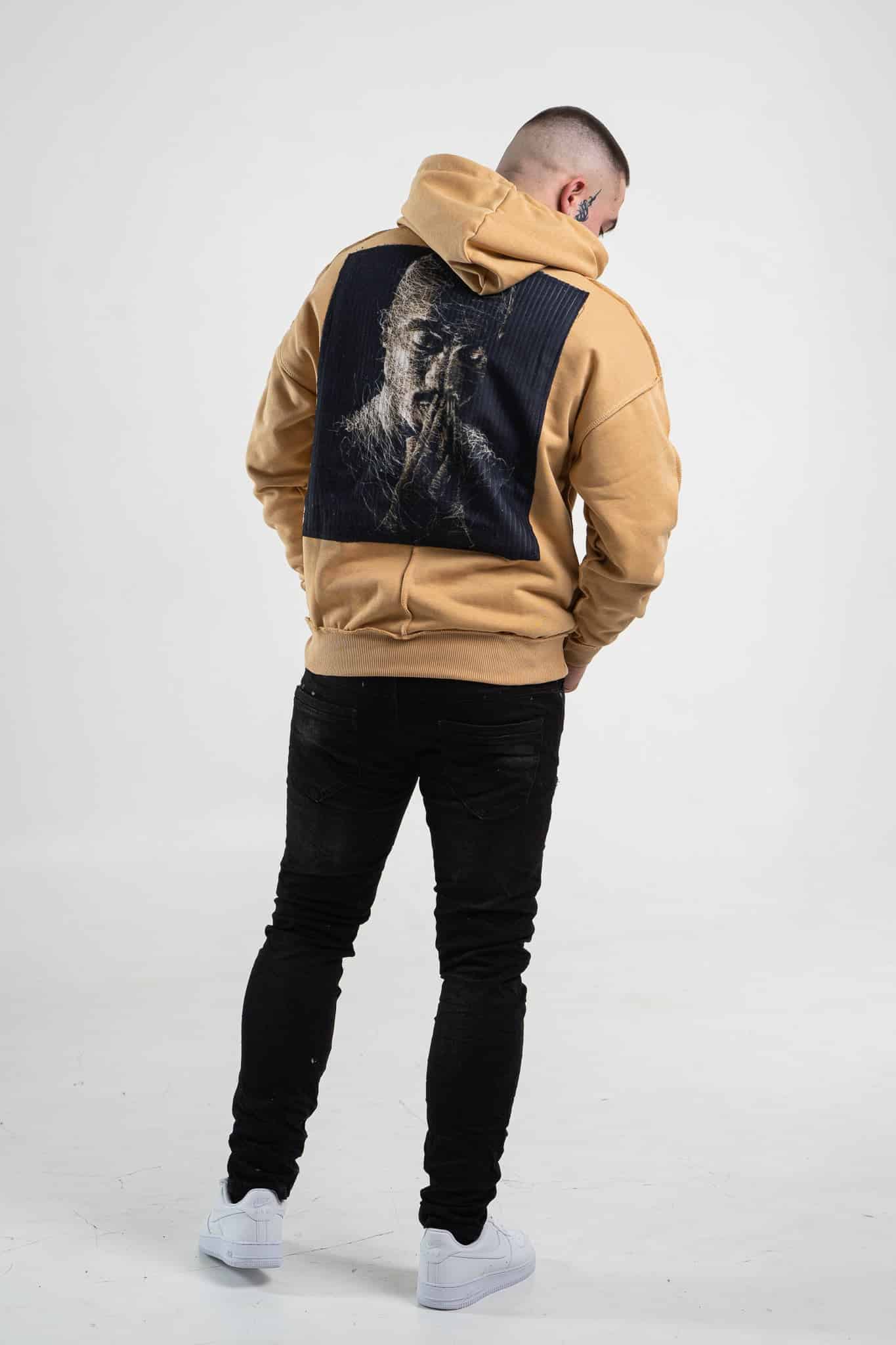 Musztardowa bluza męska o oversizowym kroju z dużym nadrukiem Tupac’a na plecach. Wykonana z wysokiej jakości materiału (65% bawełna, 35% poliester) ma kaptur oraz ozdobne przeszycia. Rękawy oraz dół bluzy zakończone są ściągaczem.
