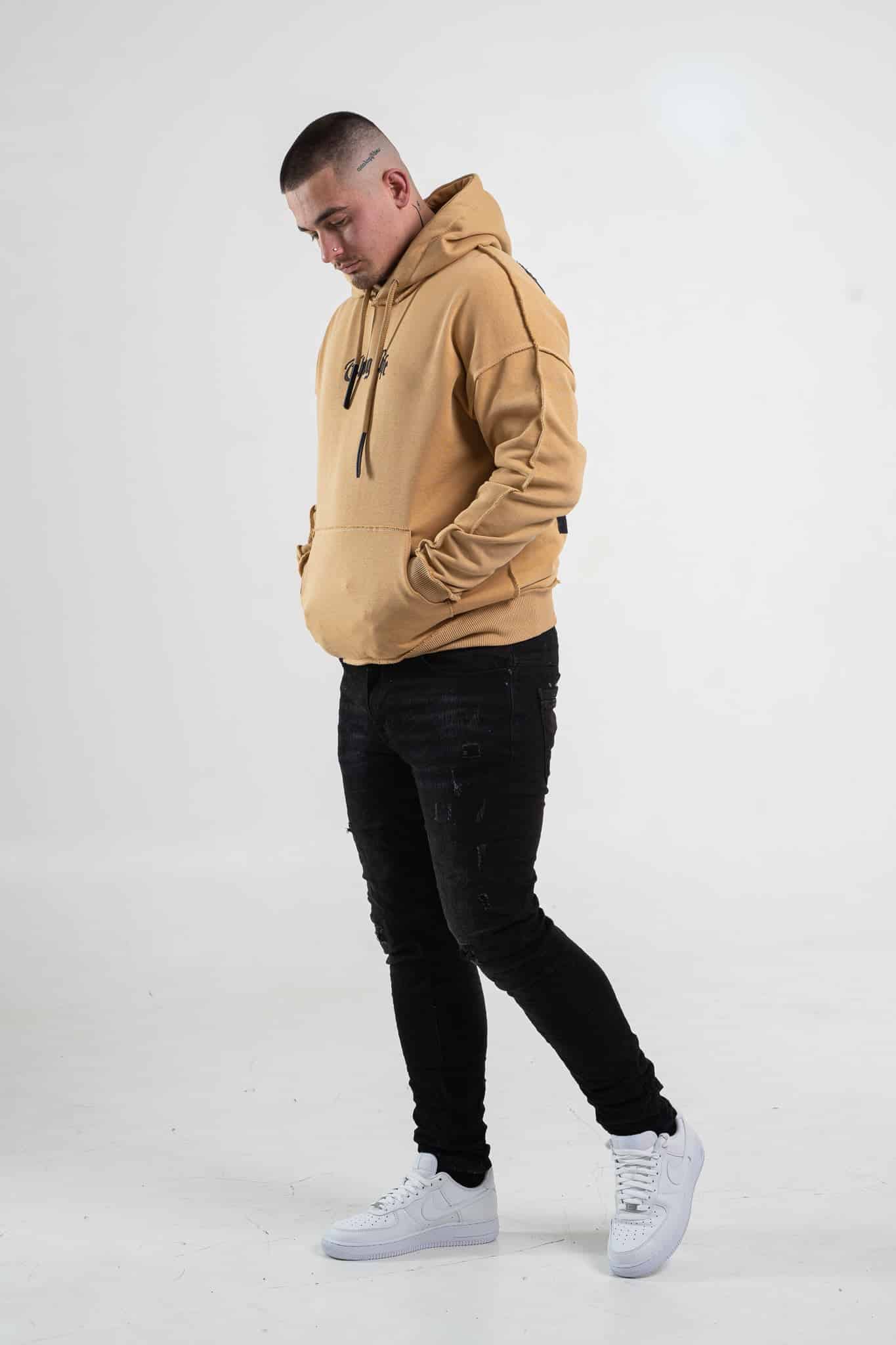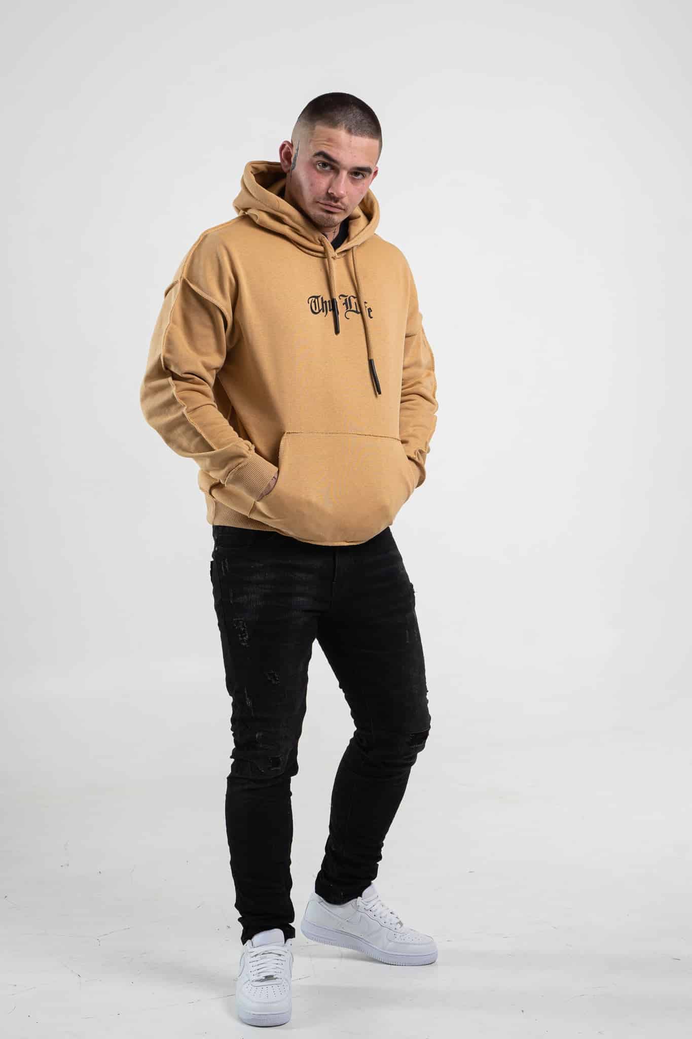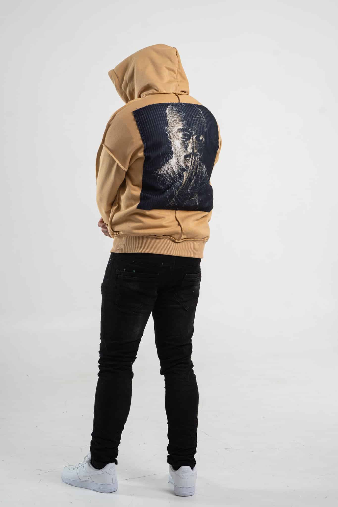 Musztardowa bluza męska o oversizowym kroju z dużym nadrukiem Tupac’a na plecach. Wykonana z wysokiej jakości materiału (65% bawełna, 35% poliester) ma kaptur oraz ozdobne przeszycia. Rękawy oraz dół bluzy zakończone są ściągaczem.