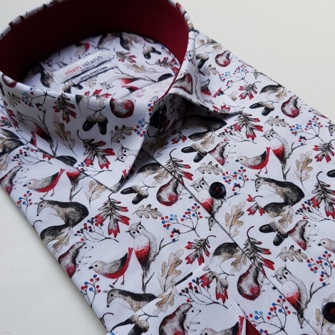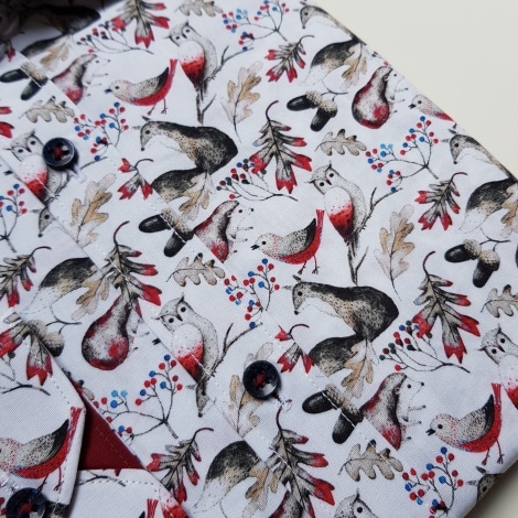 Stylowa koszula męska z roślinno – zwierzęcym motywem. Czerwone, szare oraz brązowe elementy na białym tle podkreślą Twój niezobowiązujący styl.