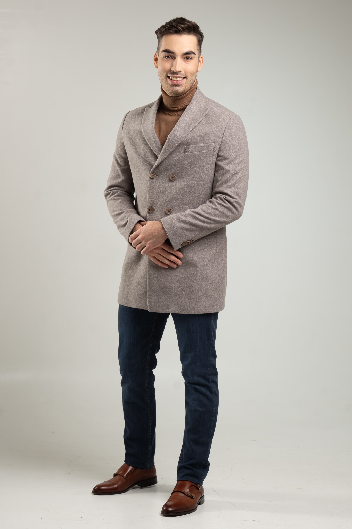 – płaszcz męski w kolorze szaro – beżowego melanżu