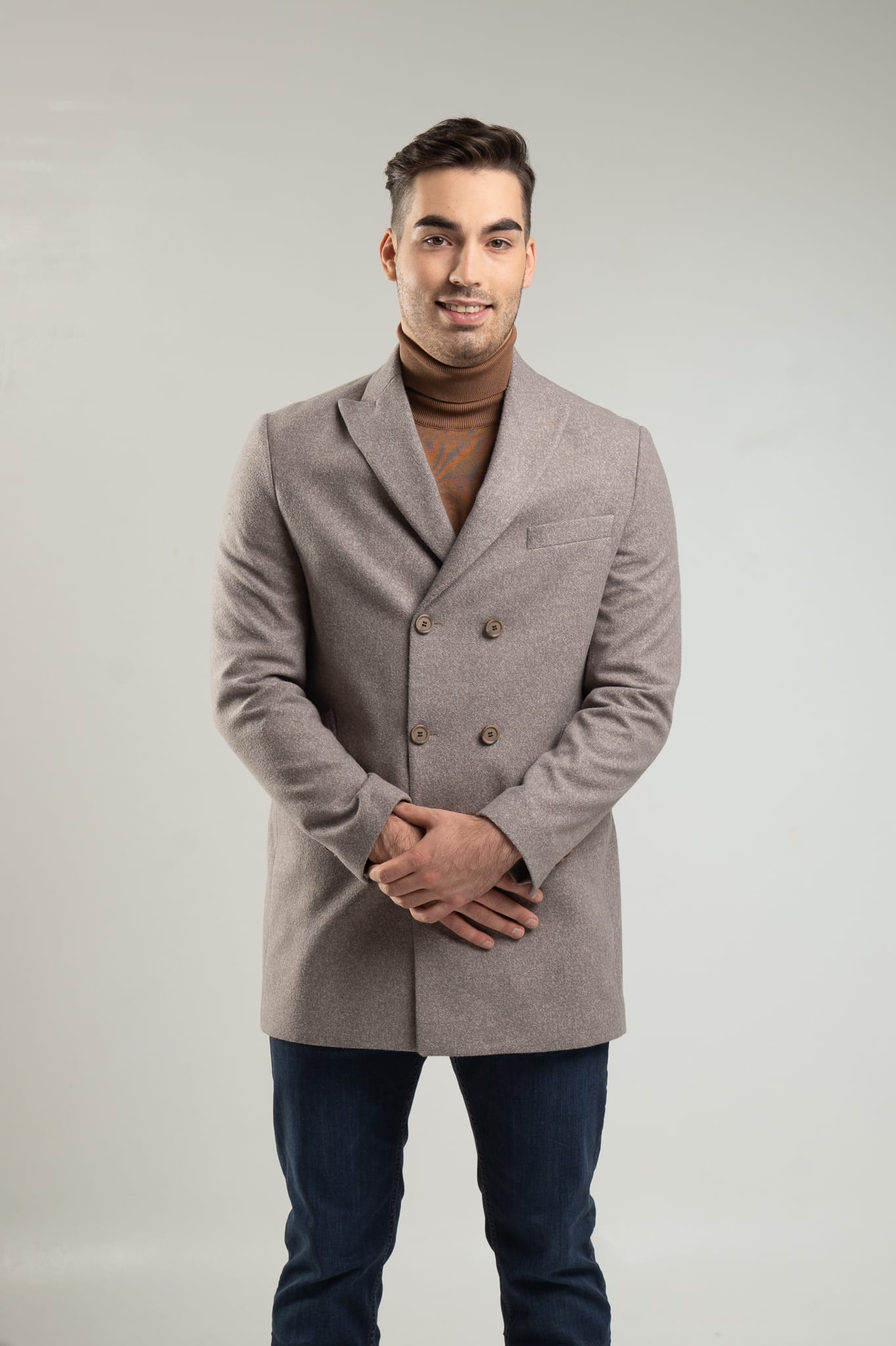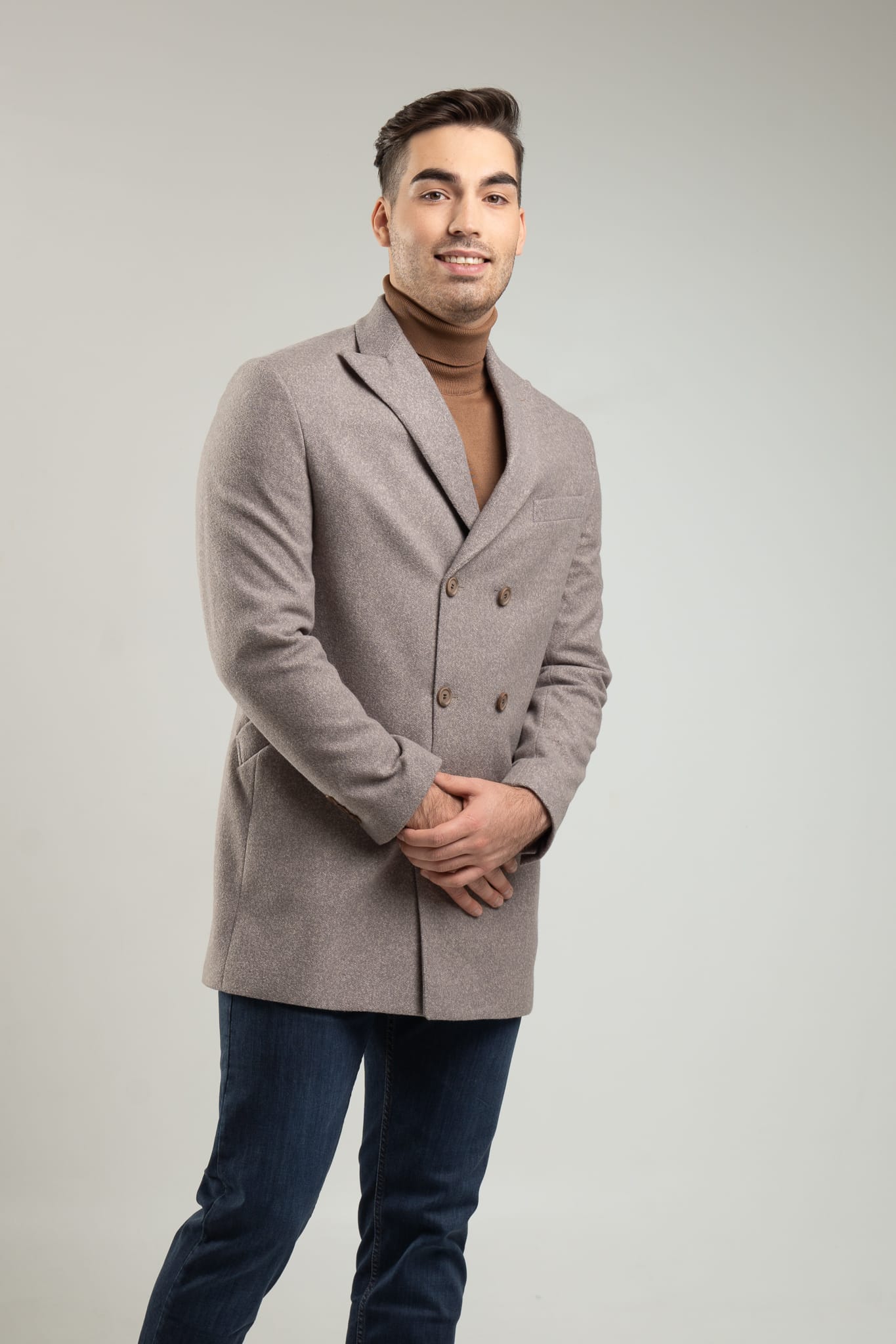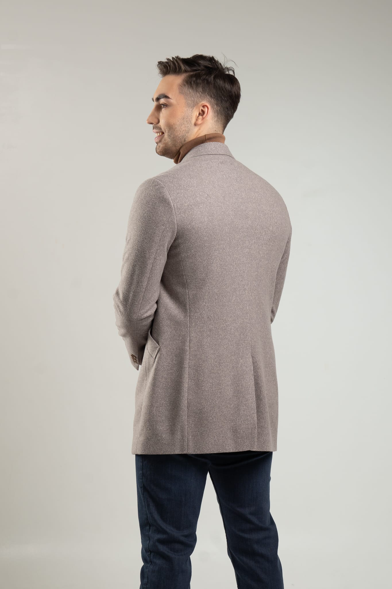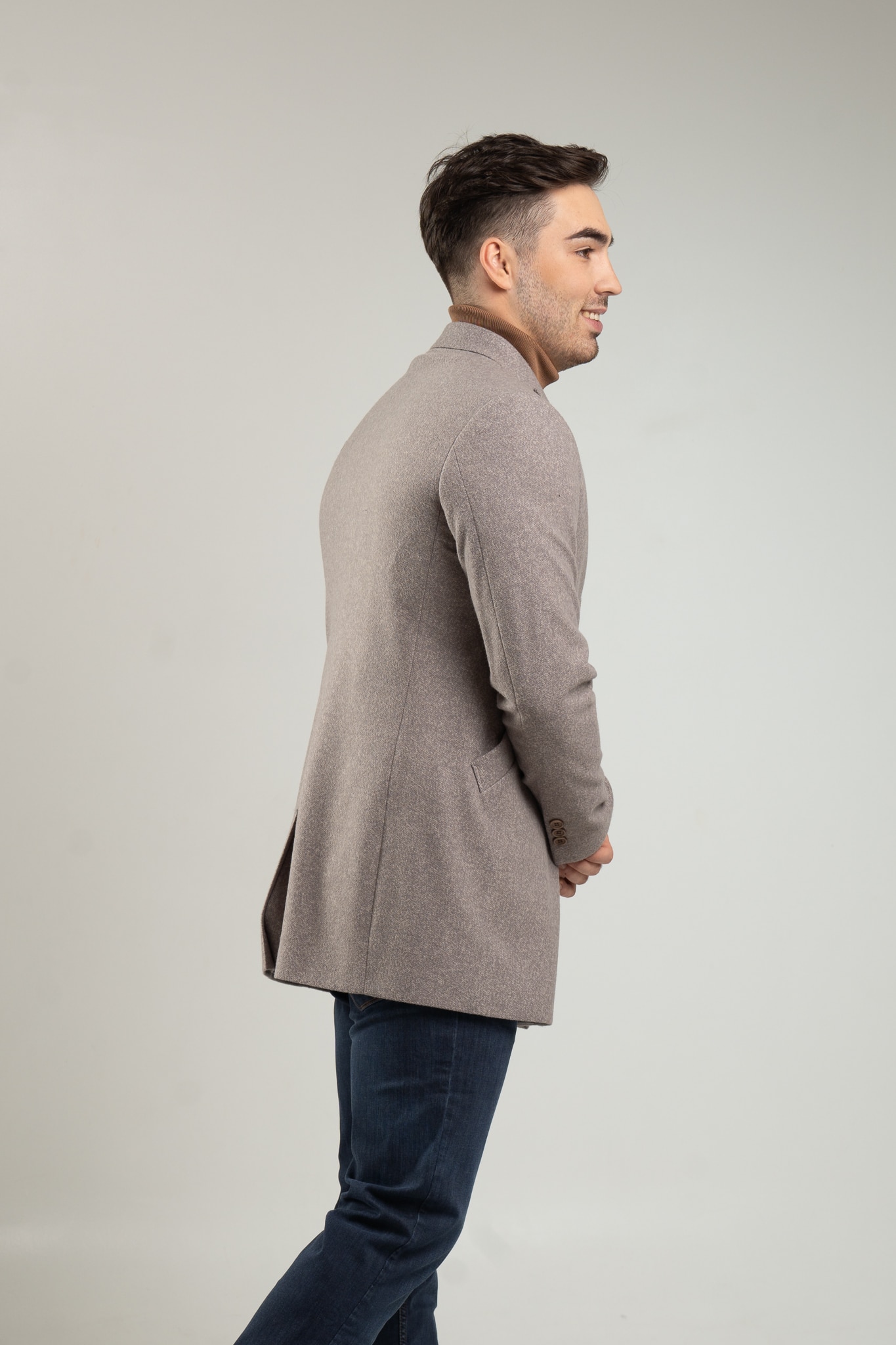 Niezastąpiony element garderoby męskiej. Płaszcz męski w kolorze szaro – beżowego melanżu. Wykonany z wysokiej jakości materiałów (65% wiskoza, 35% poliester) idealnie dopasowuje się do męskiej sylwetki.