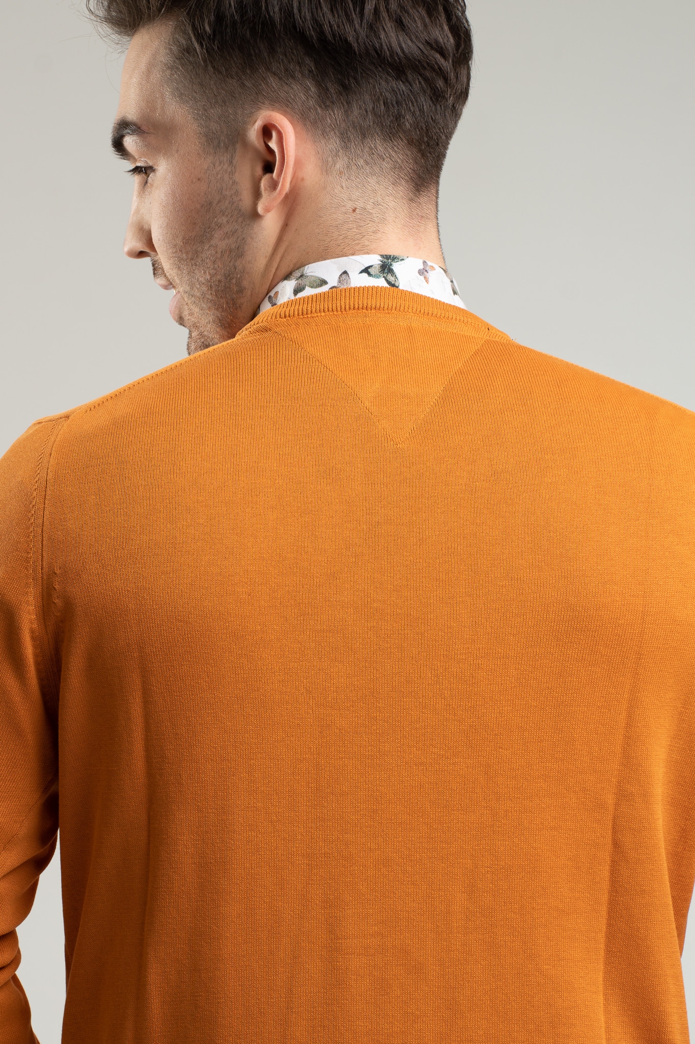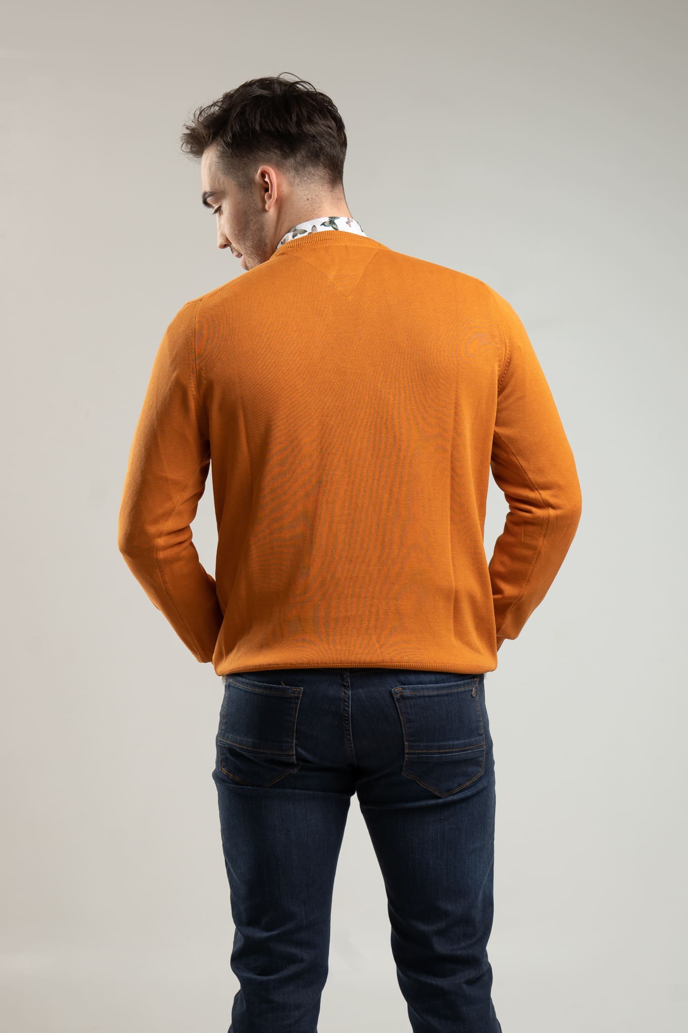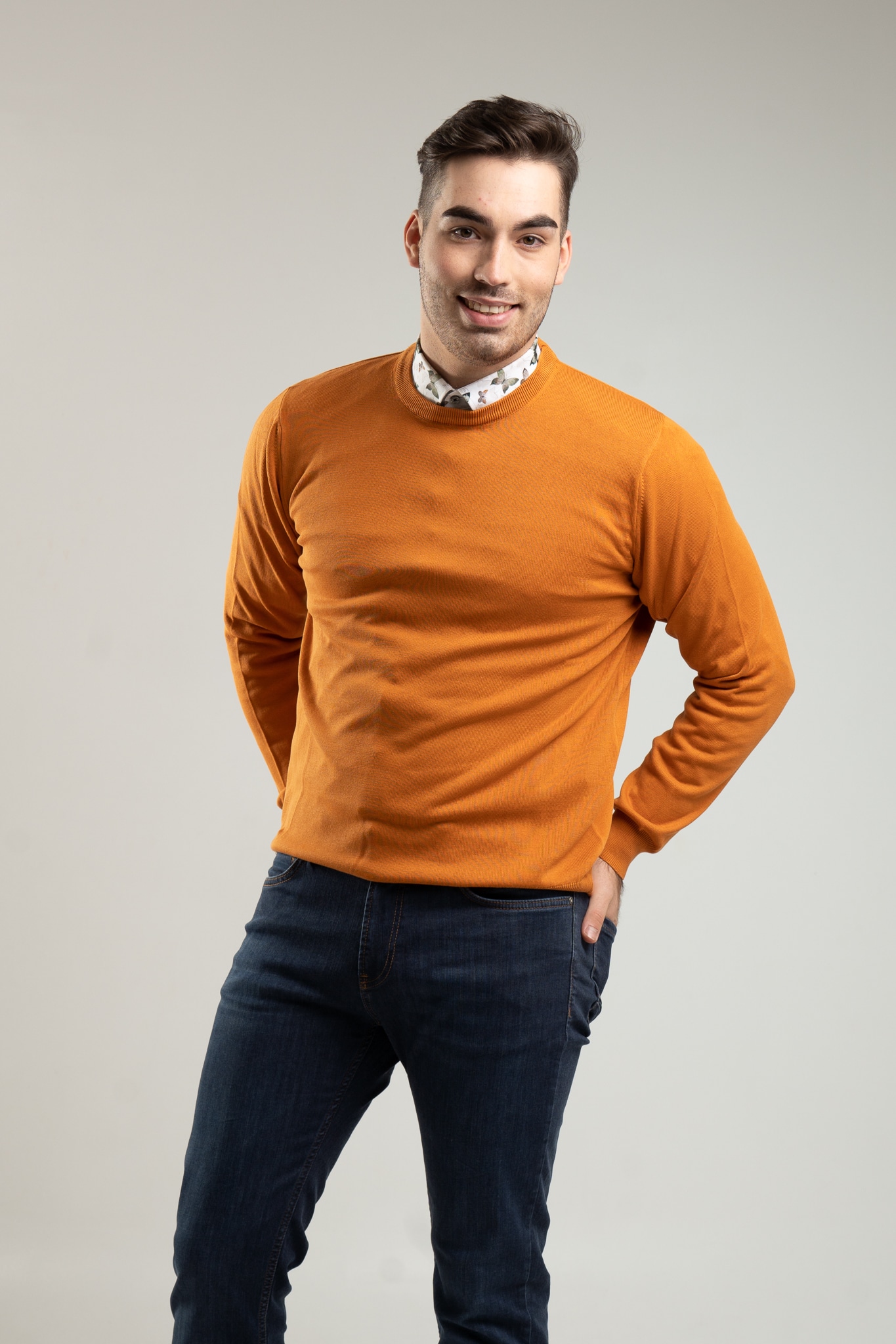 Sweter męski z okrągłym dekoltem w kolorze pomarańczowym wykonany został z najwyższej jakości tkaniny bawełnianej (100% bawełny), co gwarantuje najwyższy comfort użytkowania. Wyposażony został w ściągacze przy szyi, w pasie i w rękawach dla zapewnienia maksymalnego komfortu termicznego. Cechuje go jakość wykonania oraz dbałość o detale.