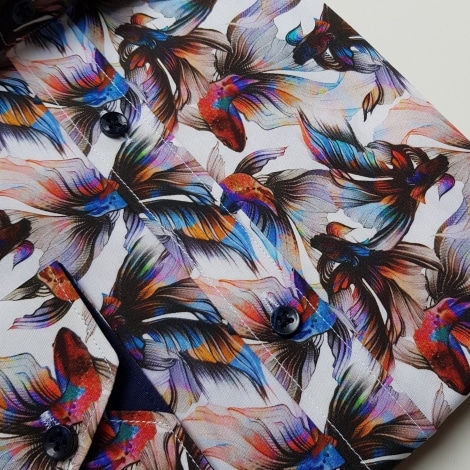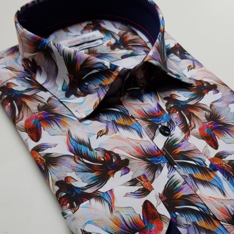 Wysokiej klasy koszula cechuje się idealnym doborem tkaniny (100% bawełny), dzięki czemu jest delikatna w dotyku oraz przyjemna w użytkowaniu. Modny krój koszuli, jakim jest slim-fit, posiada regulowany mankiet (dwa guziki) oraz niewidoczne, ukryte po wewnętrznej stronie kołnierzyka, guziki, dzięki którym kołnierzyk przylega, nie odstaje oraz nie załamuje się.