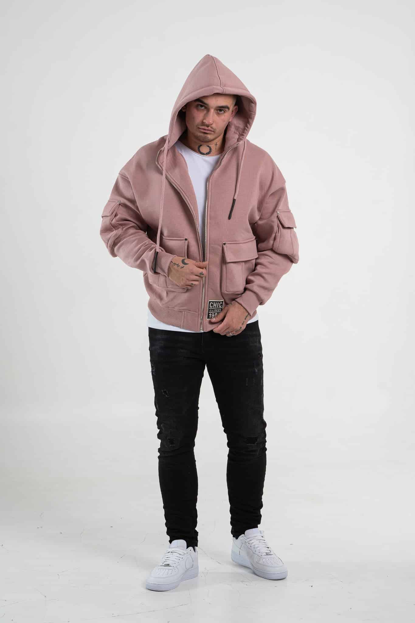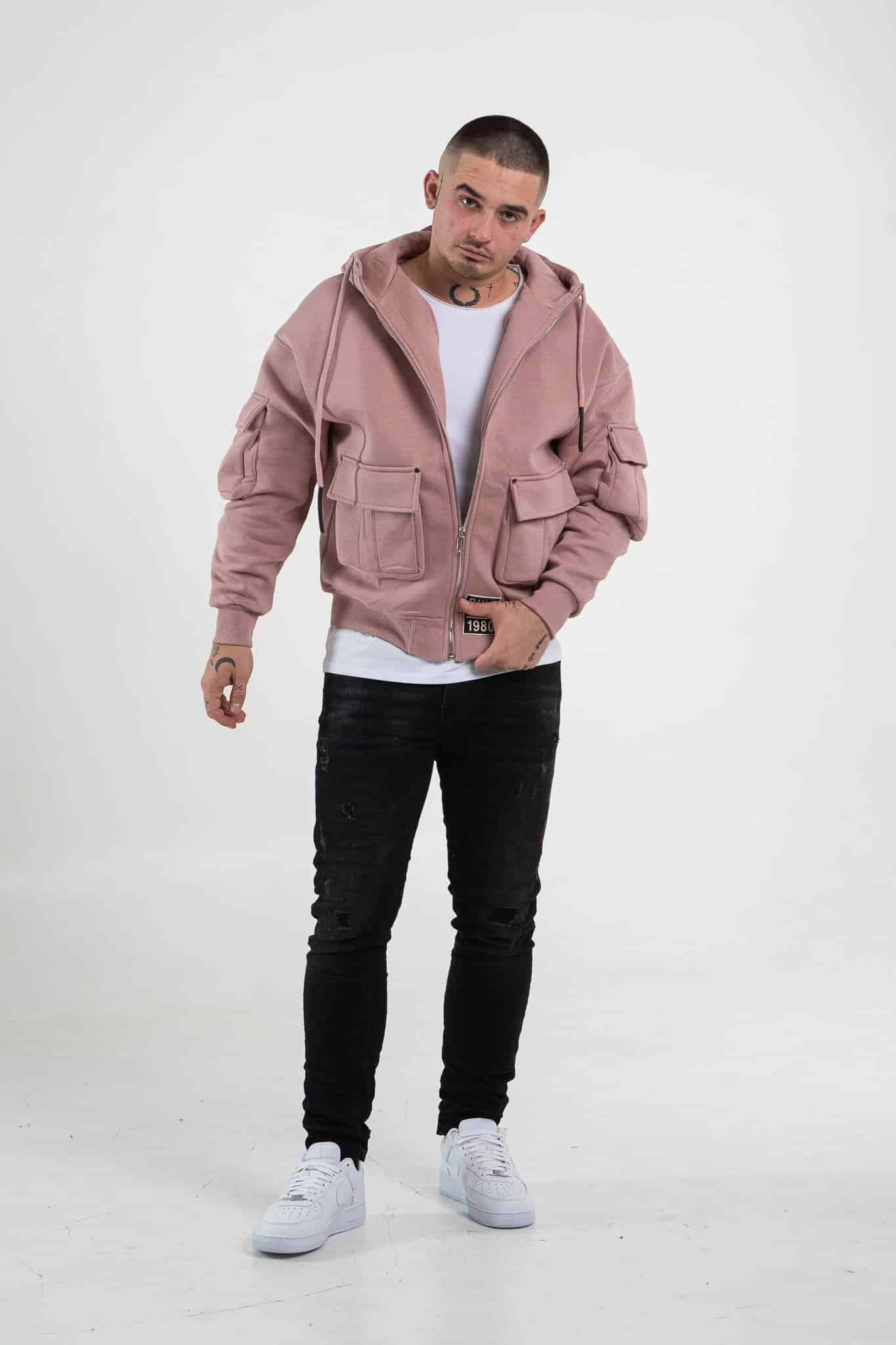 Różowa, rozpinana bluza męska o oversizowym kroju wykonana jest z wysokiej jakości materiału (65% bawełna, 35% poliester). Posiada dwie, zapinane kieszenie z przodu oraz dwie kieszenie, które znajdują się na rękawach. Zarówno jedne, jak i drugie tworzą również element dekoracyjny, przykuwający uwagę. Ma regulowany sznurkiem kaptur. Rękawy oraz dół bluzy zakończone są ściągaczem. Uwagę zwraca czarna naszywka, która znajduje się na przodzie bluzy.