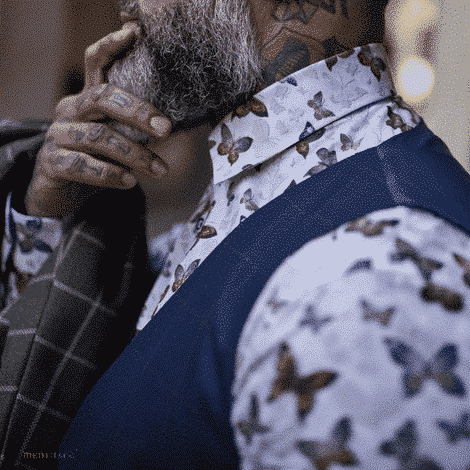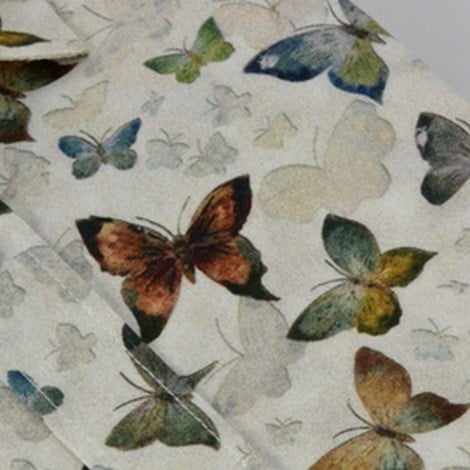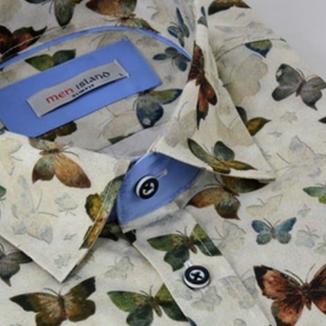 Koszula męska 201710-1 z graficznym motywem motyli (granat, brąz, beż, zieleń) na beżowym tle. Wykonana z wysokiej jakości tkaniny bawełnianej (100% bawełny) o kroju slim-fit. Kołnierzyk typu kryty button-down (guziki zapina się po wewnętrznej, niewidocznej stronie kołnierzyka). Mankiet zapinany na guziki z możliwością regulacji.