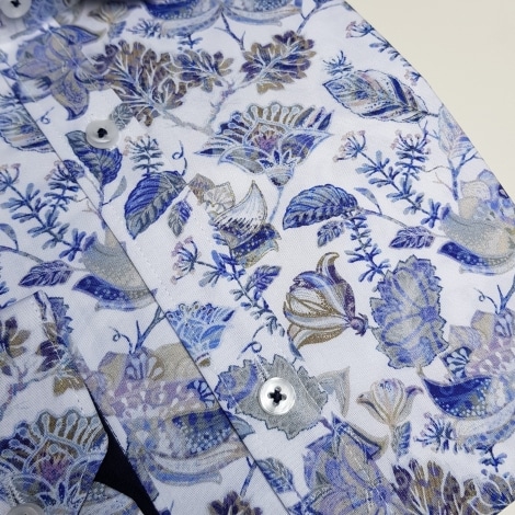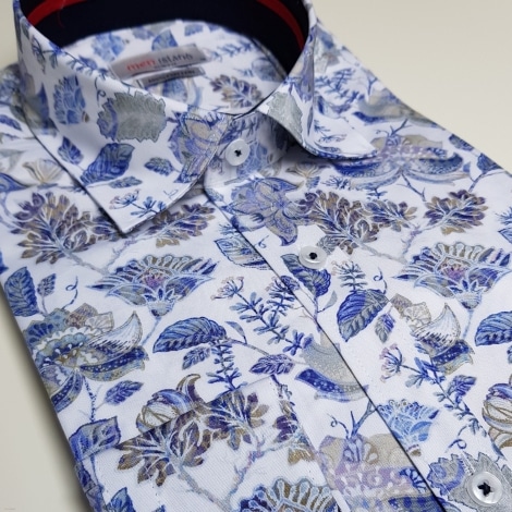 Bardzo elegancka oraz stylowa koszula 201912 marki Men Island to niezwykłe połączenie świadomości stylu, dbałości o najmniejsze szczegóły oraz ekskluzywnej jakości. Stylowa propozycja w oryginalny deseń wielobarwnych kwiatów utrzymanych w stonowanych kolorach (odcienie niebieskiego, szarości, beżu oraz zieleni).