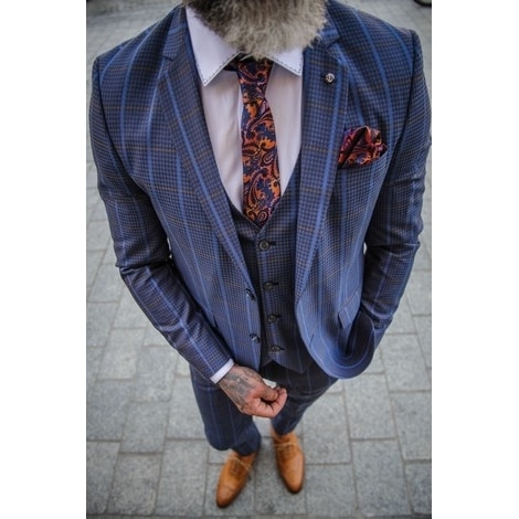 Stylowy, elegancki oraz bardzo gustowny garnitur męski. Rzecz, która w męskiej garderobie jest zdecydowanie niezbędna. Niebanalna, jednorzędowa marynarka w beżowo-błękitną kratę, jednorzędowa kamizelka oraz wytaliowane spodnie tworzą najbardziej pożądany w tym sezonie, garnitur trzyczęściowy. Wyróżniający się delikatnym wzorem na całej powierzchni, wysoką jakością materiału, elegancką kolorystyką oraz szykowną kratą, a także mieniącym się materiałem (odcienie niebieskiego, wpadające w fiolet), wywiera wyjątkowe wrażenie na miłośnikach mody męskiej. Wyjątkowym, czyni go również kamizelka, która coraz częściej staje się uzupełnieniem stroju. Pozwala zachować perfekcyjny wygląd, genialnie wysmukla sylwetkę, nadaje charakteru oraz urozmaica stylizację. Jak żadna inna część garderoby męskiej jest symbolem elegancji, dobrego stylu, gustu i smaku.
