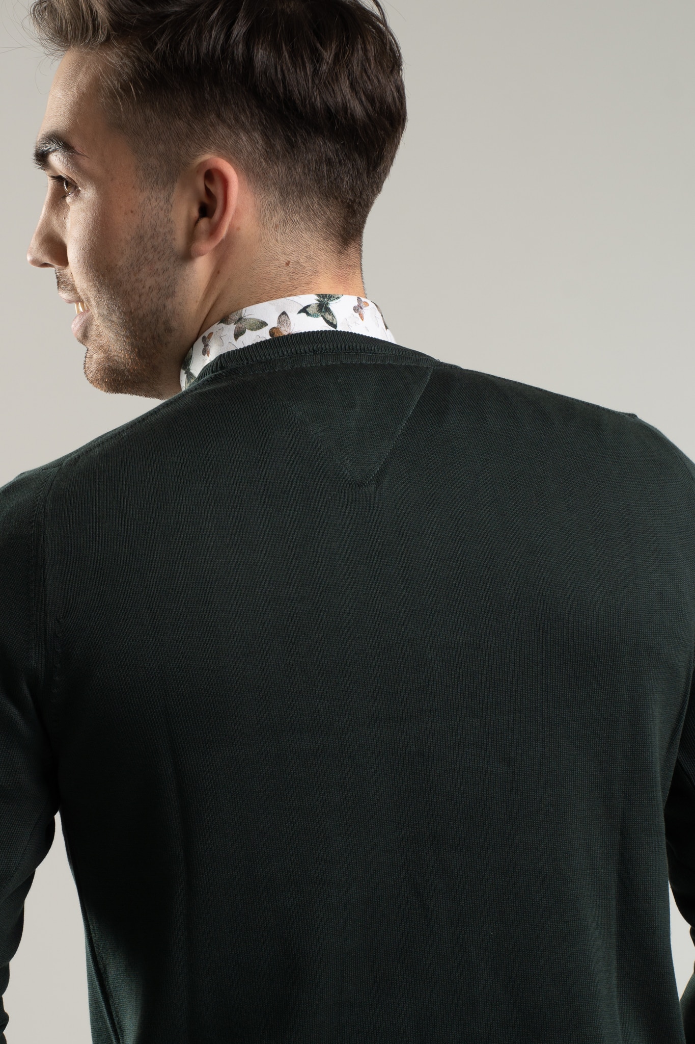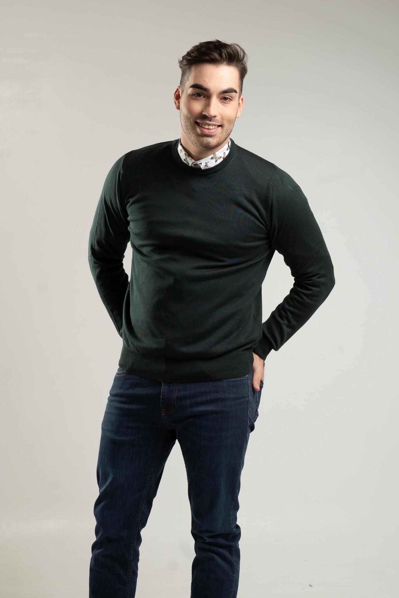 Sweter męski z okrągłym dekoltem w kolorze butelkowej zieleni wykonany został z najwyższej jakości tkaniny bawełnianej (100% bawełny), co gwarantuje najwyższy komfort użytkowania. Wyposażony został w ściągacze przy szyi, w pasie i w rękawach dla zapewnienia maksymalnego komfortu termicznego. Cechuje go jakość wykonania oraz dbałość o detale.
