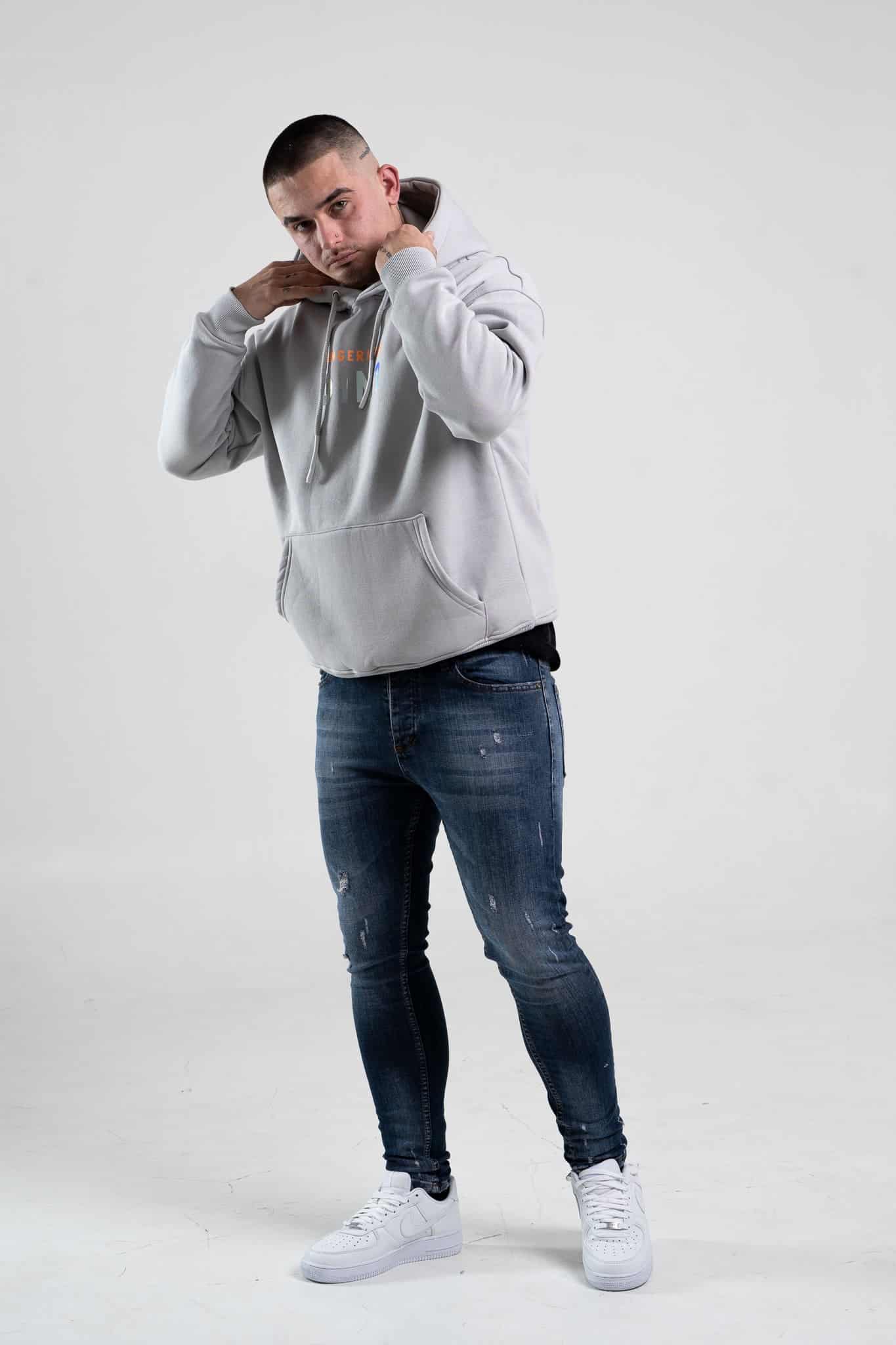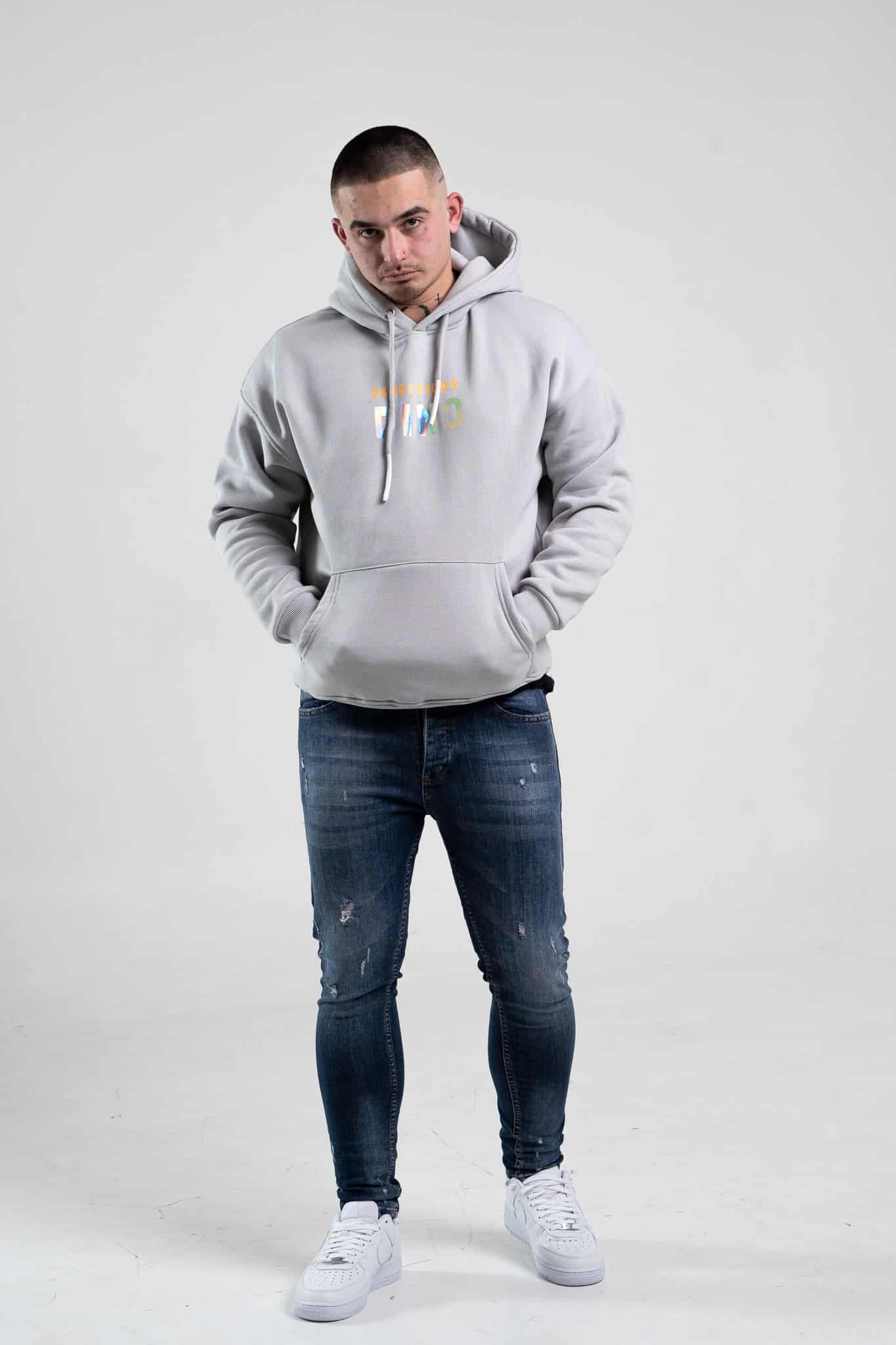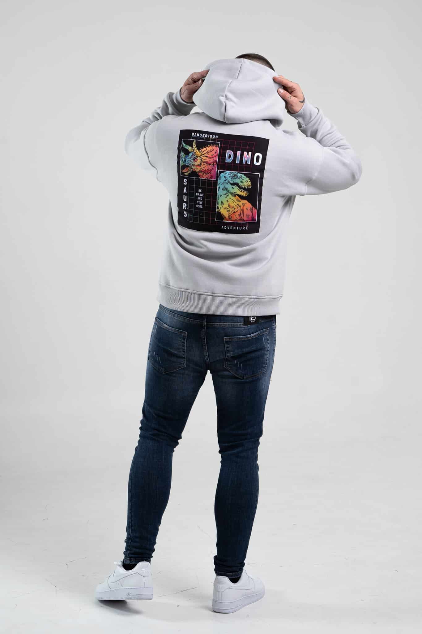 Szara bluza męska o oversizowym kroju z dużym, ozdobnym nadrukiem na plecach. Wykonana z wysokiej jakości materiału (65% bawełna, 35% poliester) posiada regulowany sznurkiem kaptur oraz kieszeń kangurkę. Rękawy oraz dół bluzy zakończone są ściągaczem. Uwagę zwraca również napis, który znajduje się na przodzie bluzy.