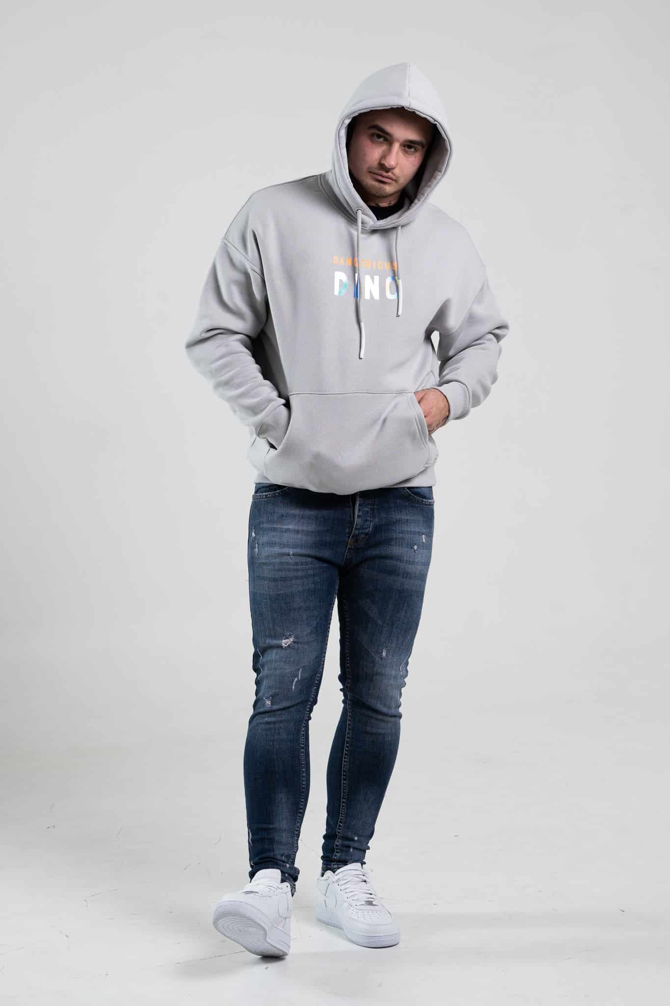 Szara bluza męska oversize z kapturem i nadrukiem